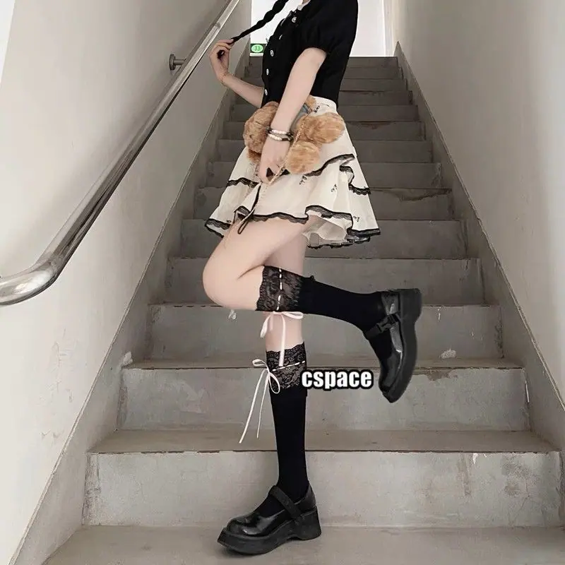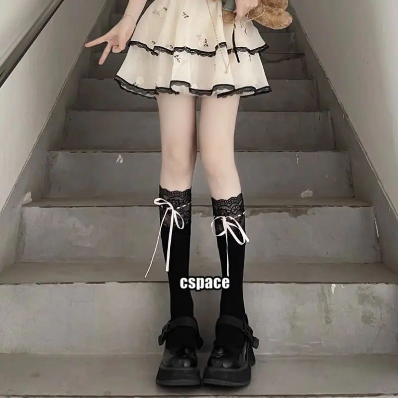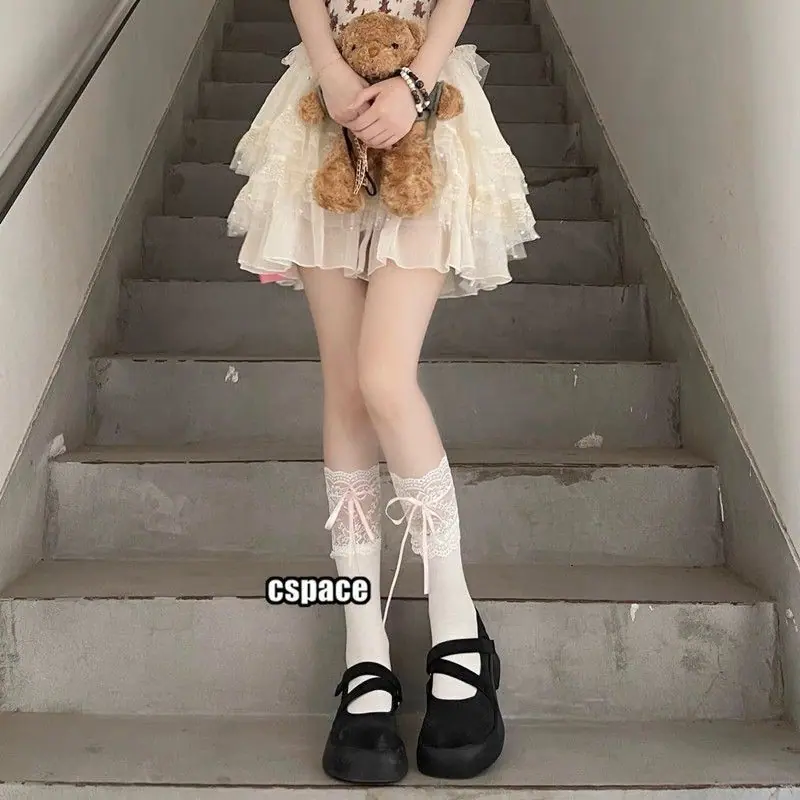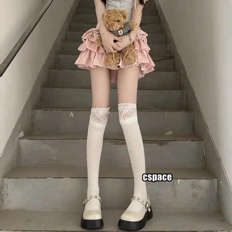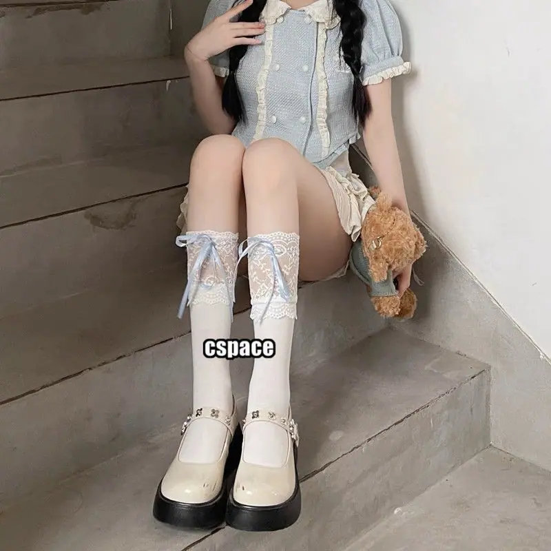 Compra Meias Brancas de Renda Lolita Acima do Joelho jk Estilo Ballet Laço de Fita Azul Estudante Versátil Meias Longas al por mayor en Joom.pro
