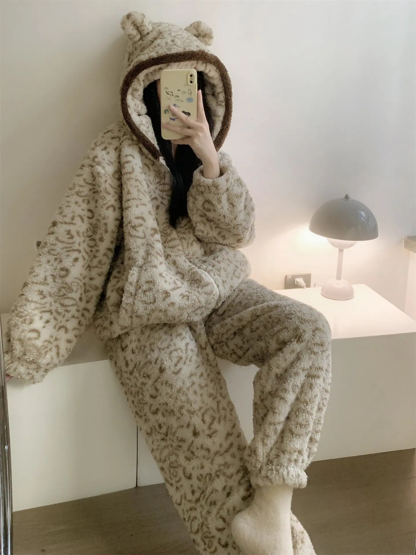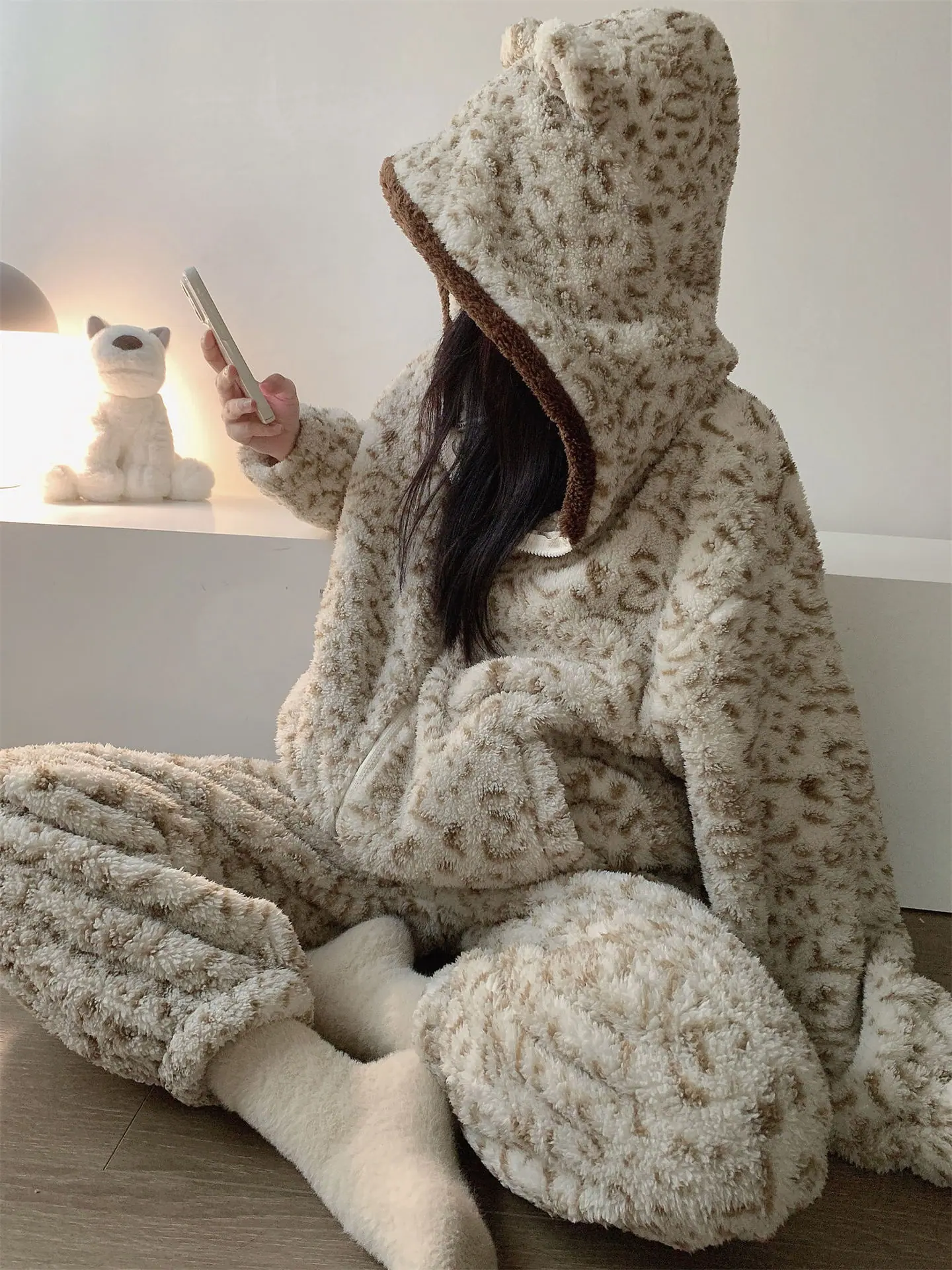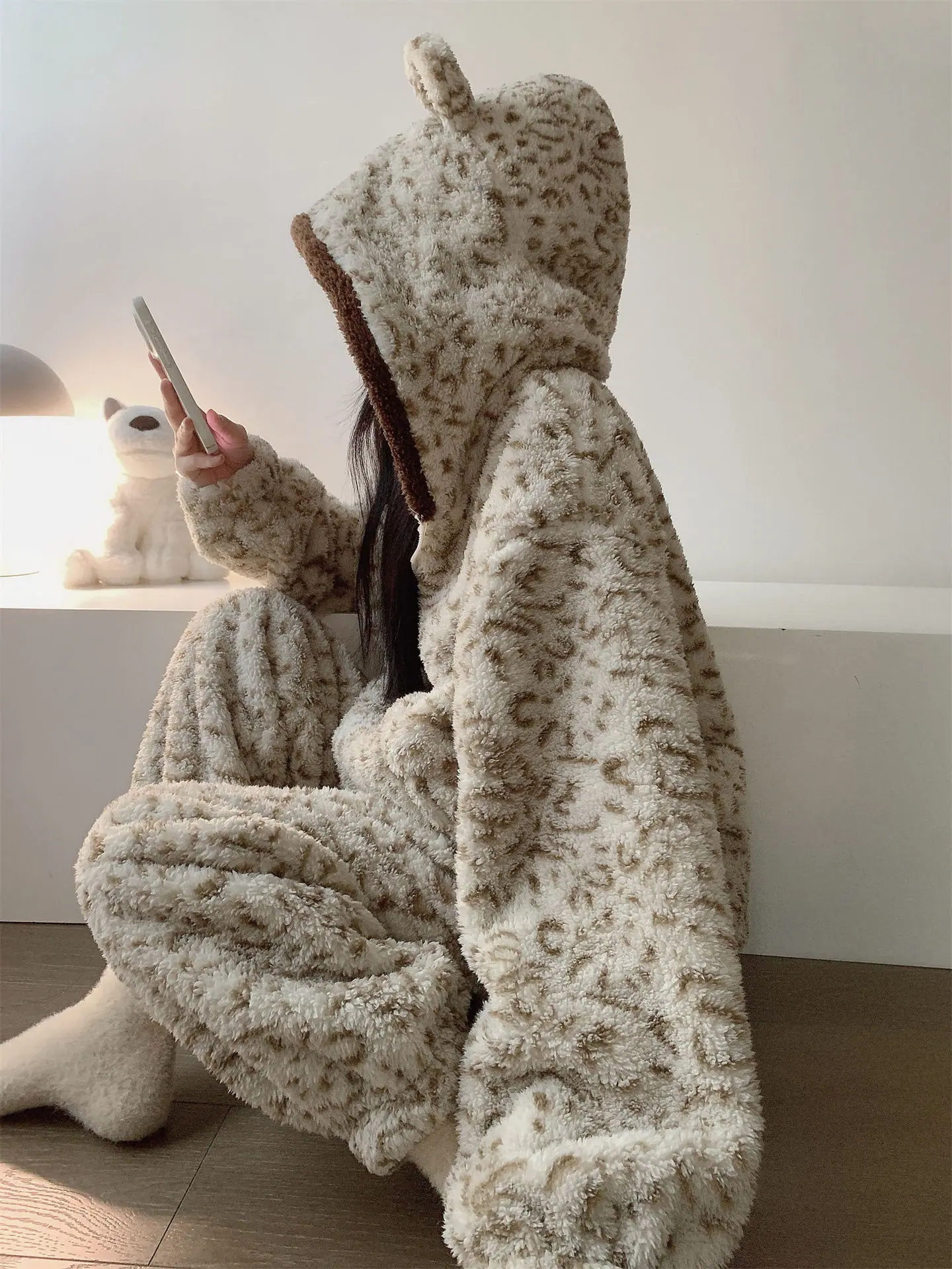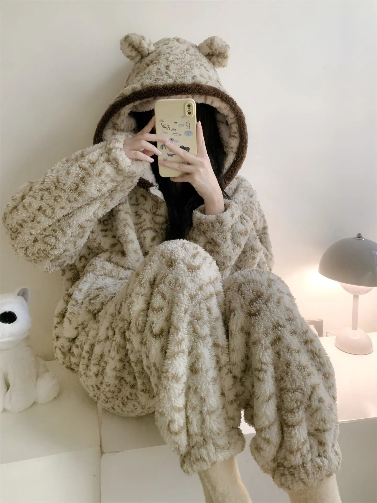 Pijama con Capucha de Forro Polar Coral con Estampado de Leopardo para Niña Otoño Invierno Talla Grande Grueso Cálido Set de Ropa para el Hogar Lindo