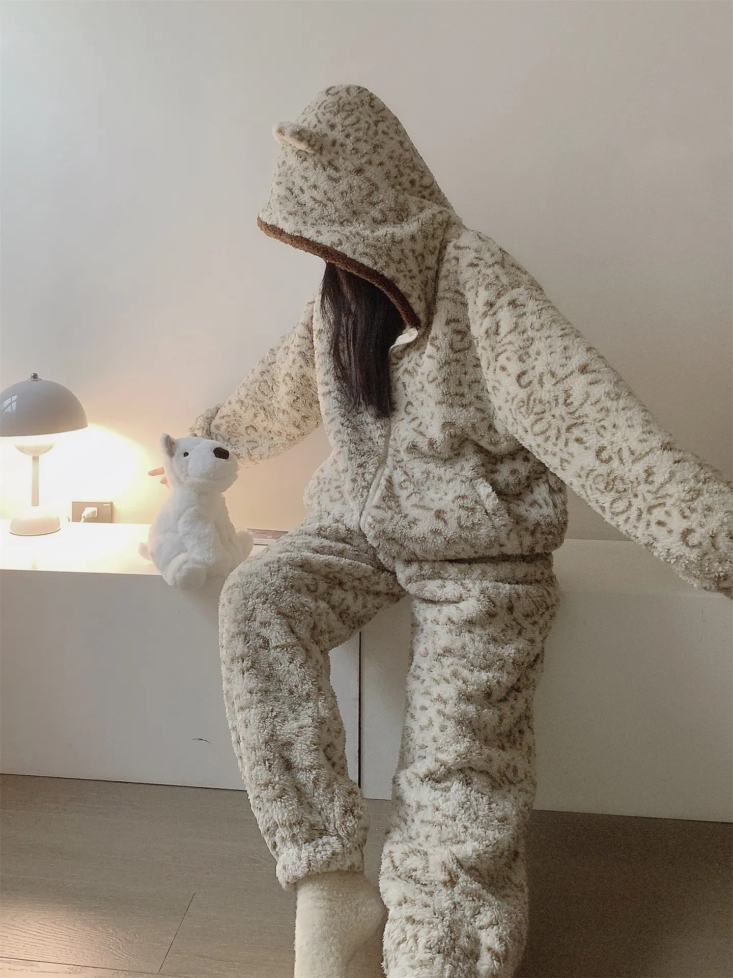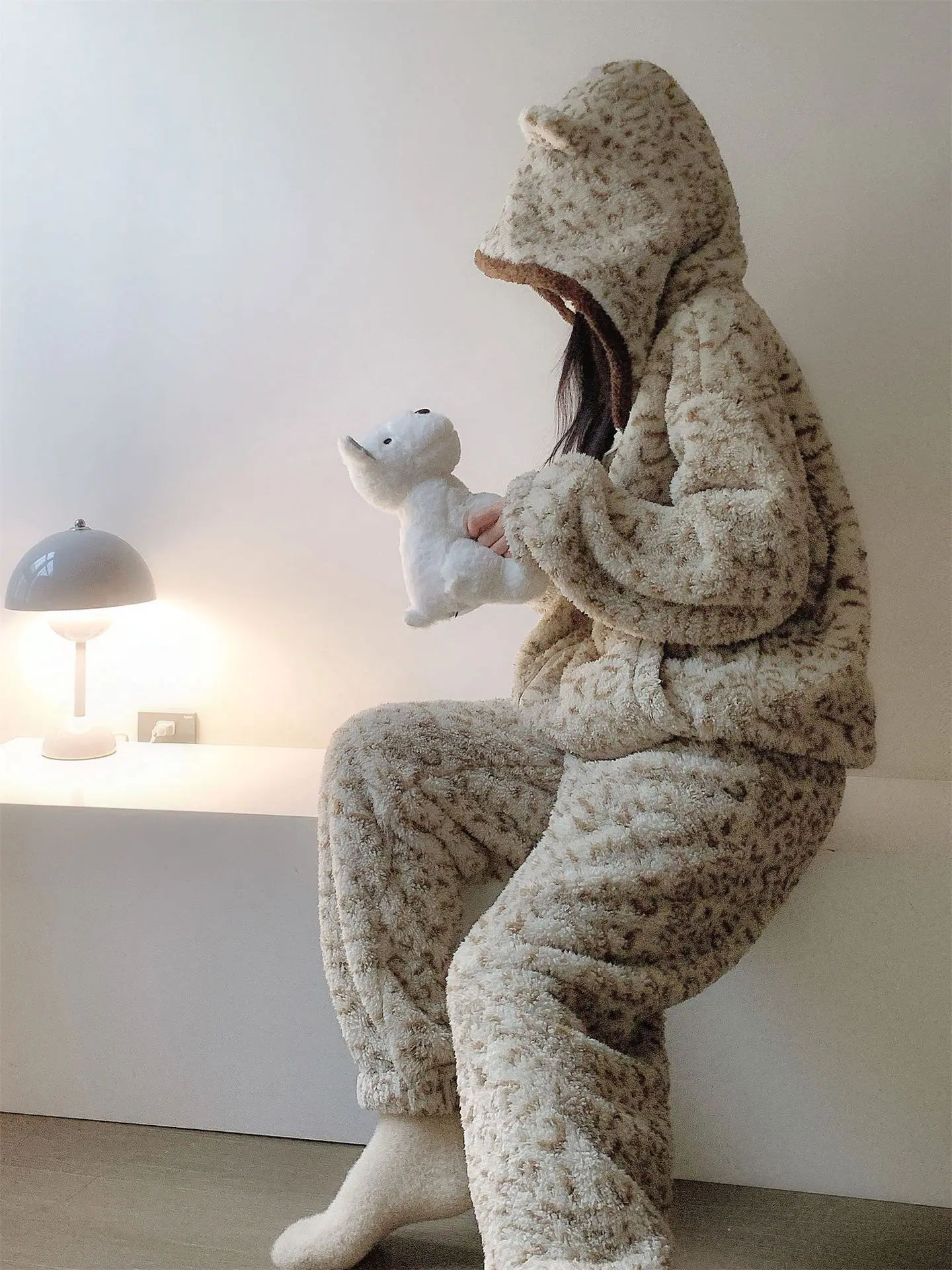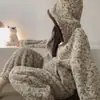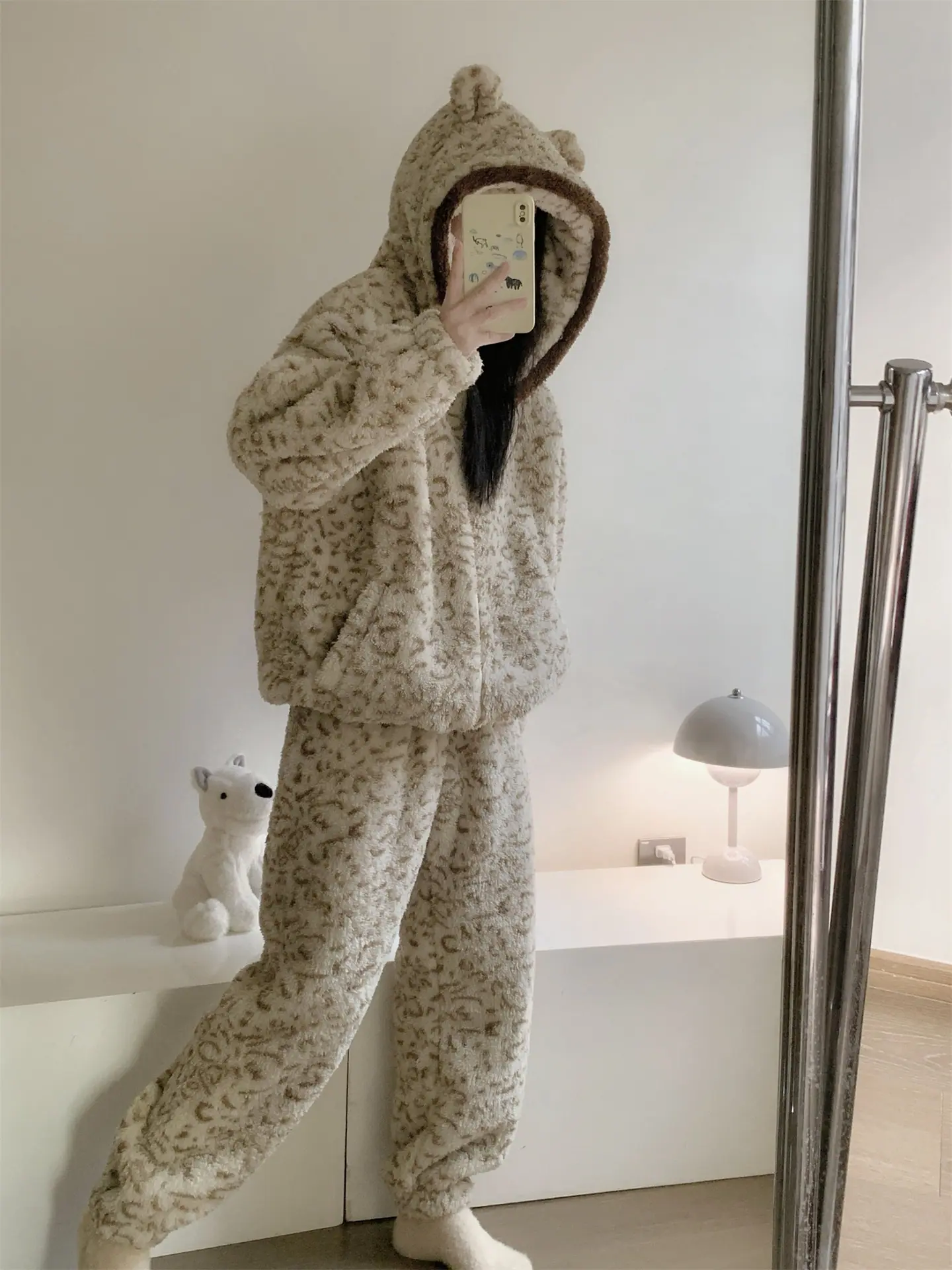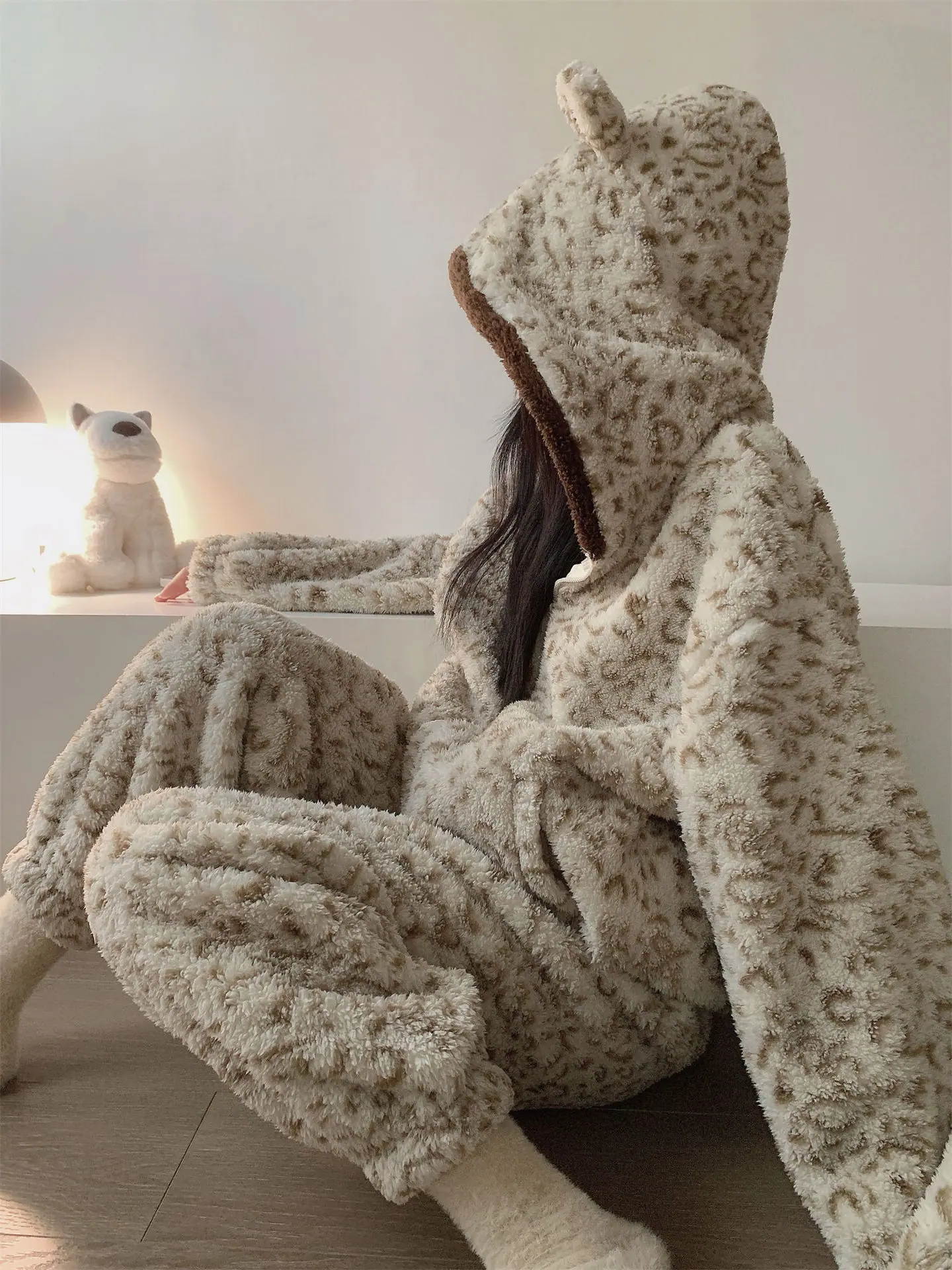 Pijama con Capucha de Forro Polar Coral con Estampado de Leopardo para Niña Otoño Invierno Talla Grande Grueso Cálido Set de Ropa para el Hogar Lindo