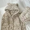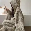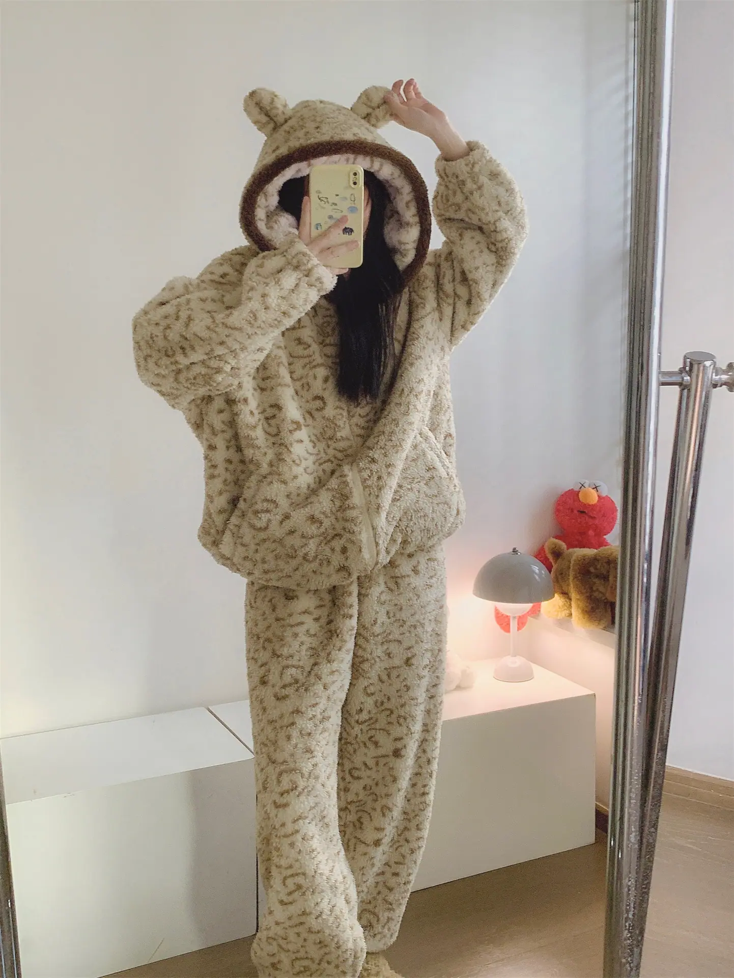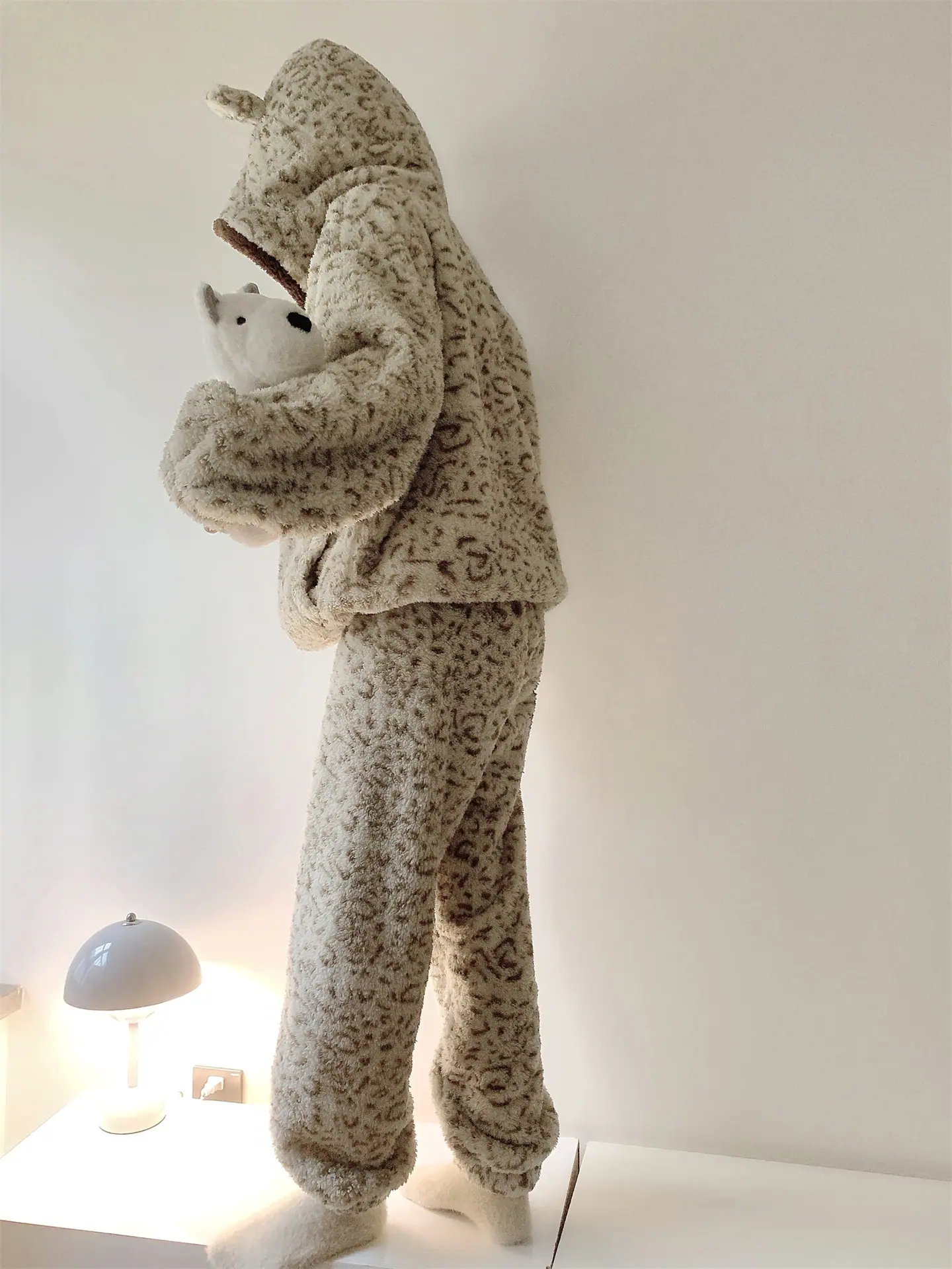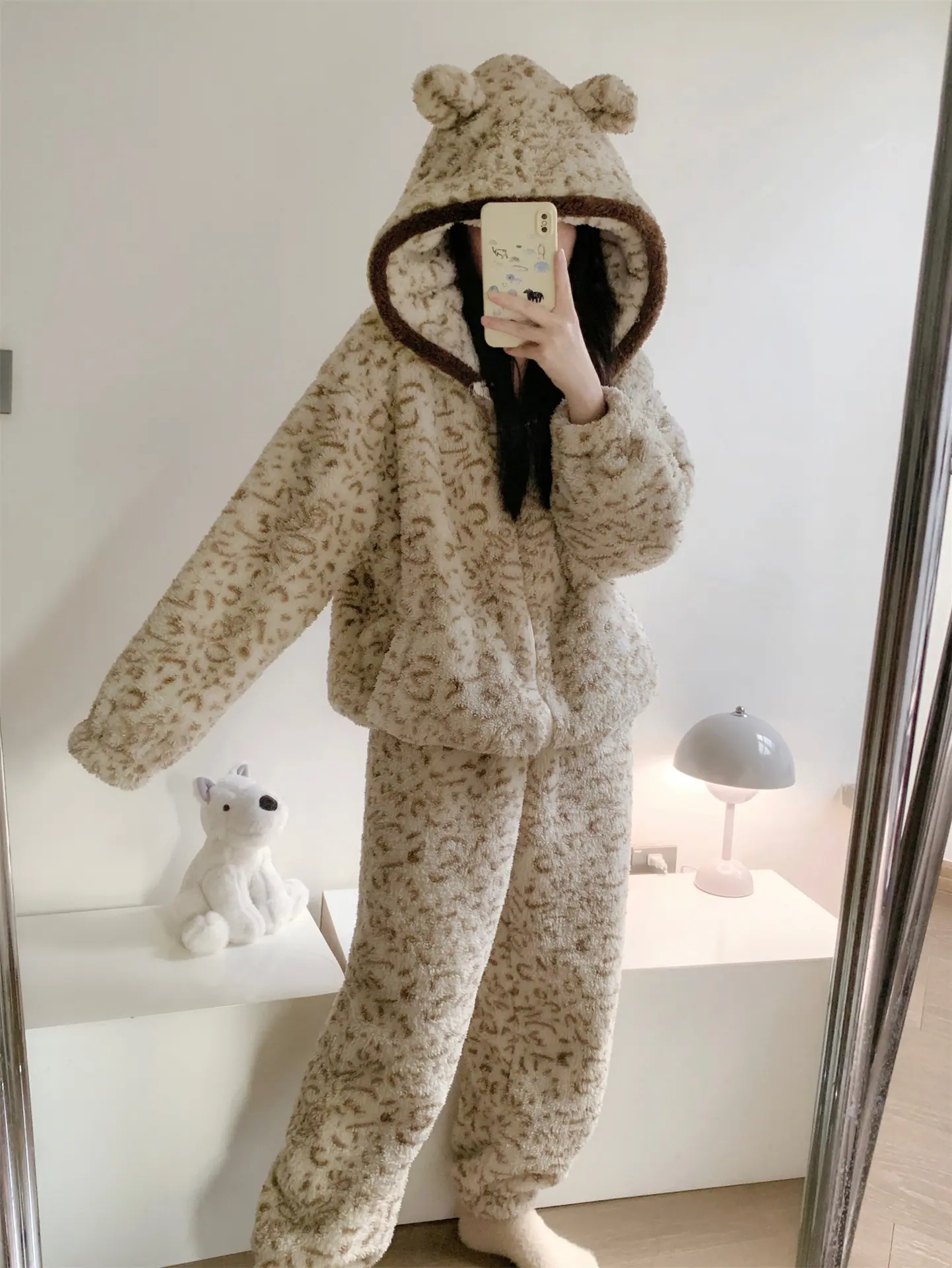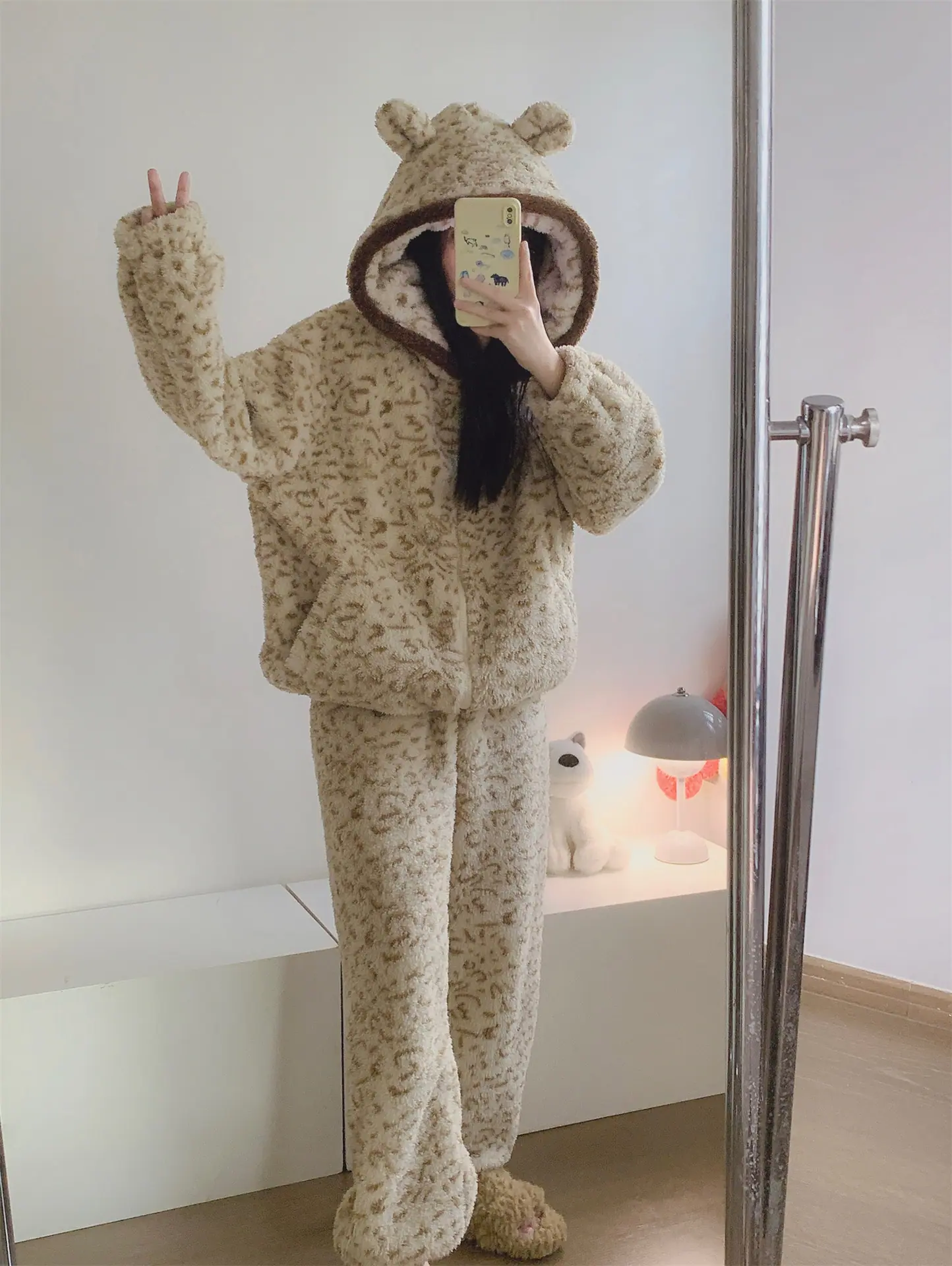 Pijama con Capucha de Forro Polar Coral con Estampado de Leopardo para Niña Otoño Invierno Talla Grande Grueso Cálido Set de Ropa para el Hogar Lindo