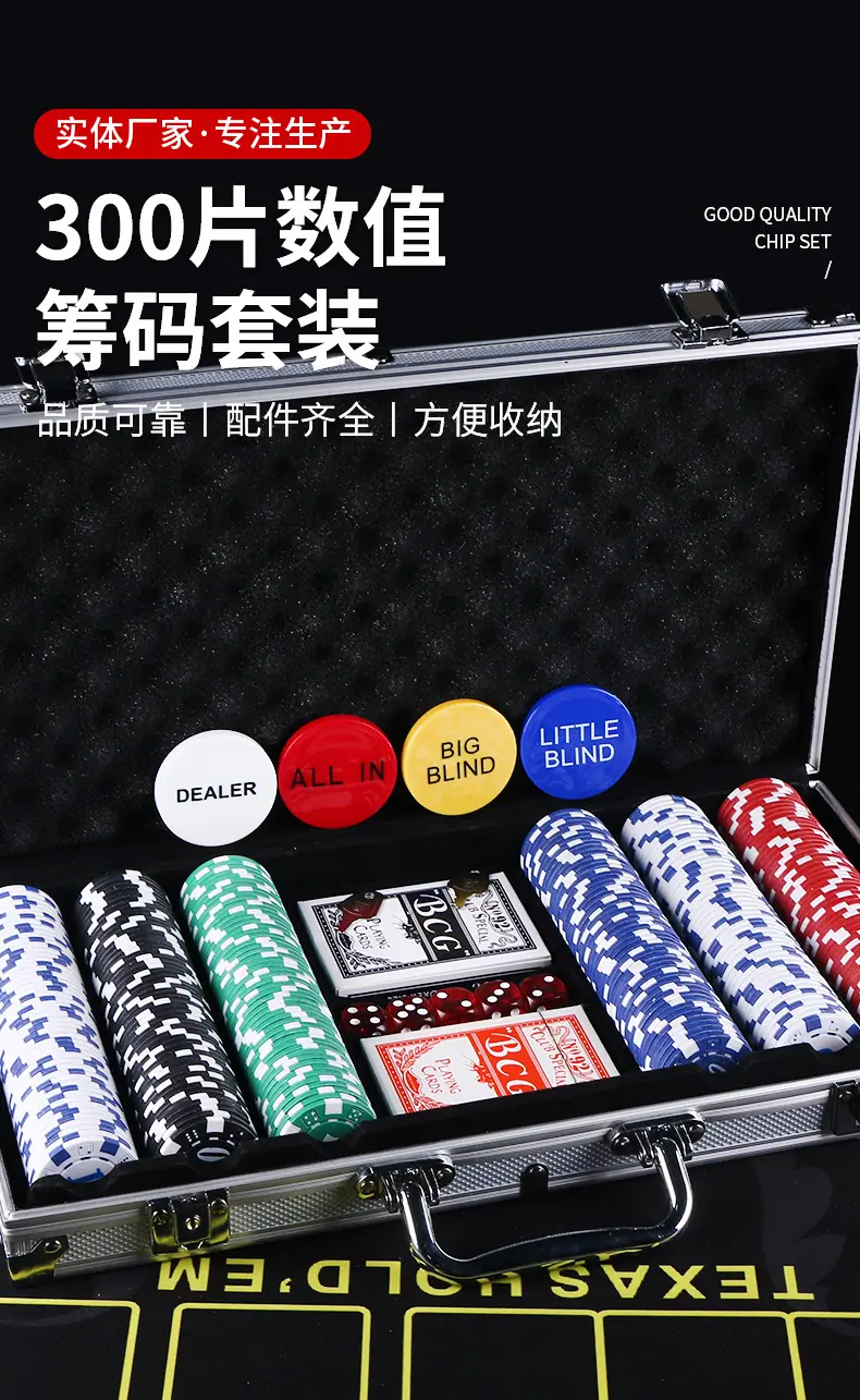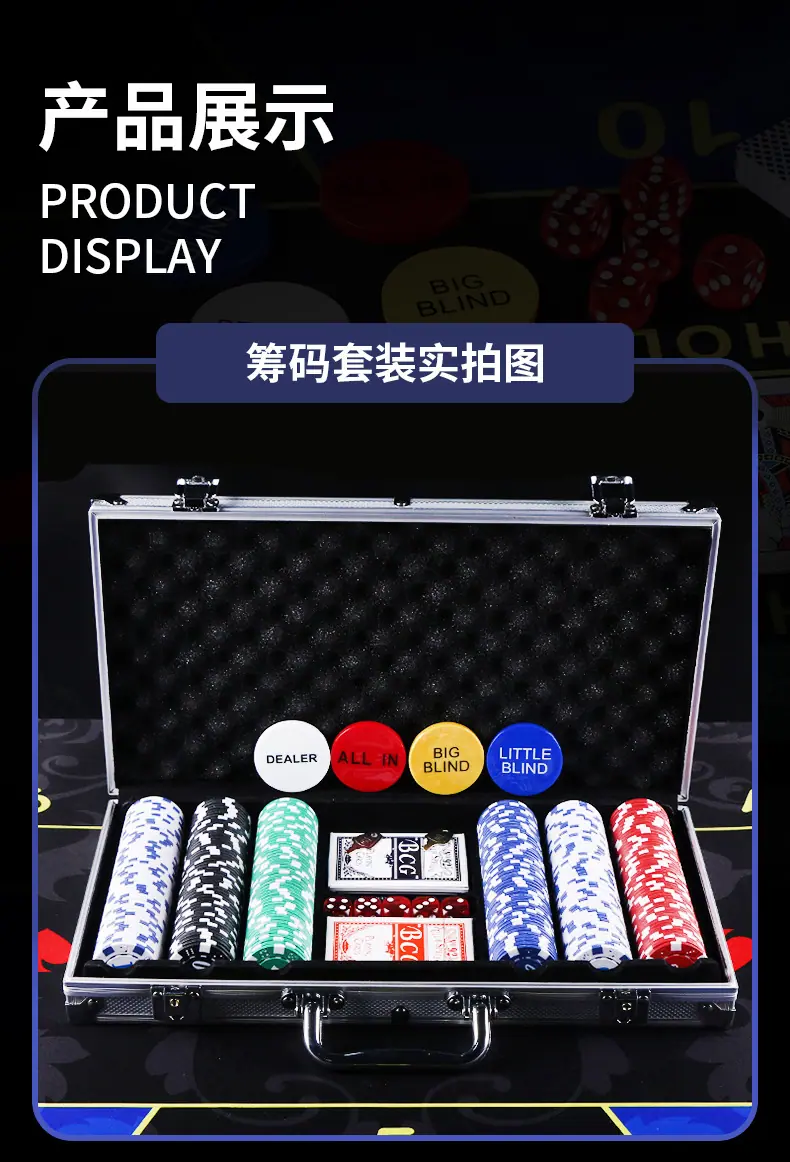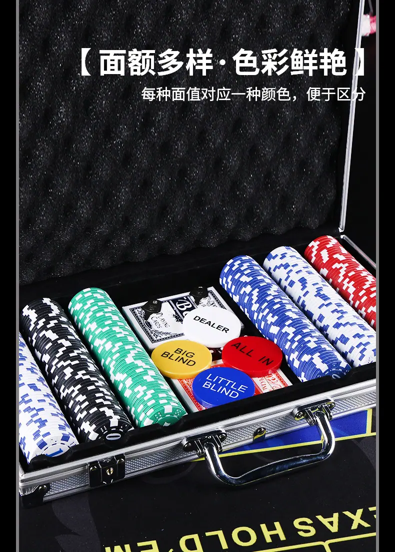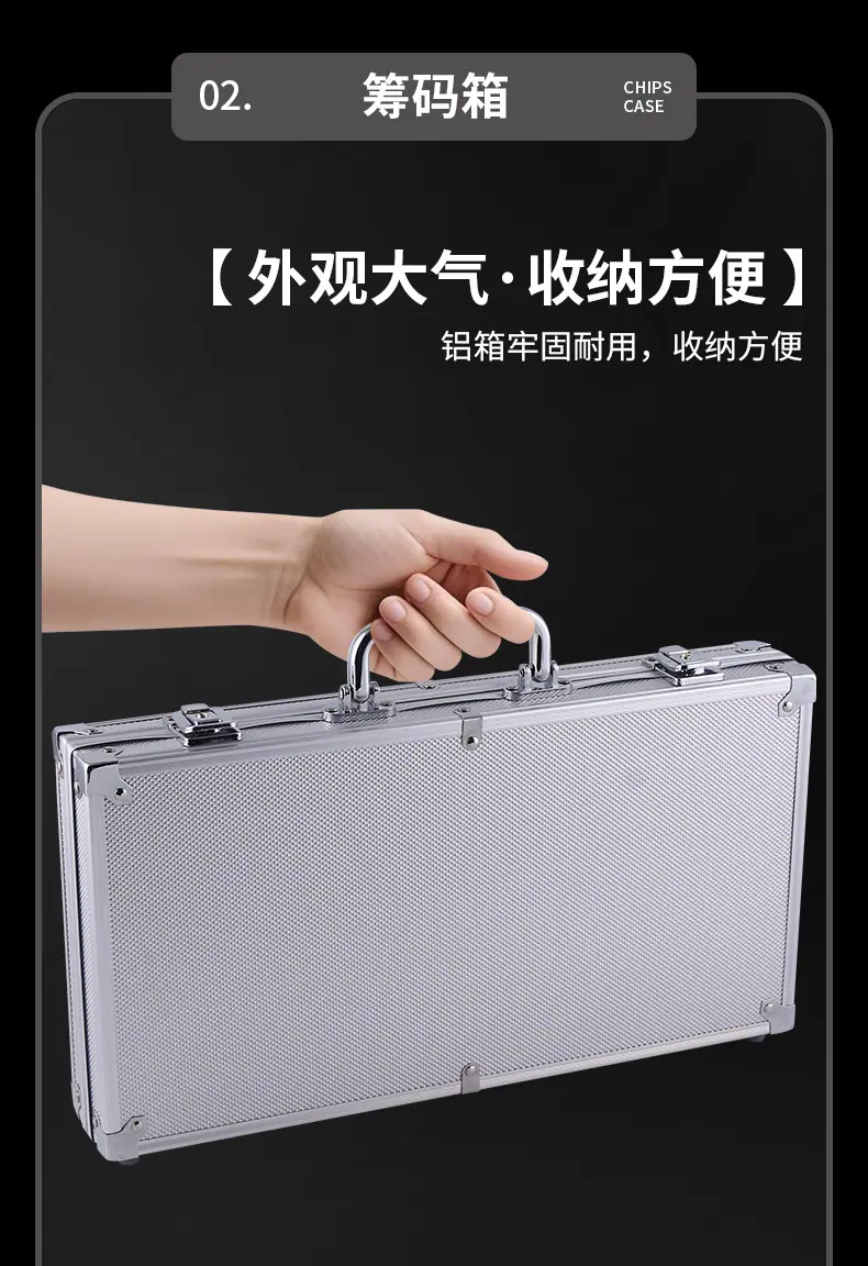 100-piece aluminum case dice chip set, 200-piece counting chip set, 300 piece value chip set, 500-piece counti...