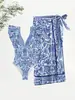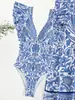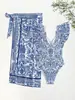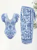 Nuevo Traje de Baño de Comercio Exterior Azul Estampado Retro Traje de Baño de Dos Piezas con Falda Traje de Baño Sexy con Encaje de Manga V Profundo para Mujer
