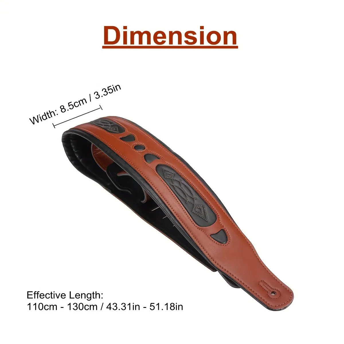 Características: Correa cómoda ancha. Hecho de cuero PU, suave y duradero. Podría usarse en bajo, guitarra eléctrica, guitarra acústica, etc. Tamaño: Ancho: 8.5cm / 3.35in Longitud Ajustable: 110cm - 130cm / 43.31in - 51.18in