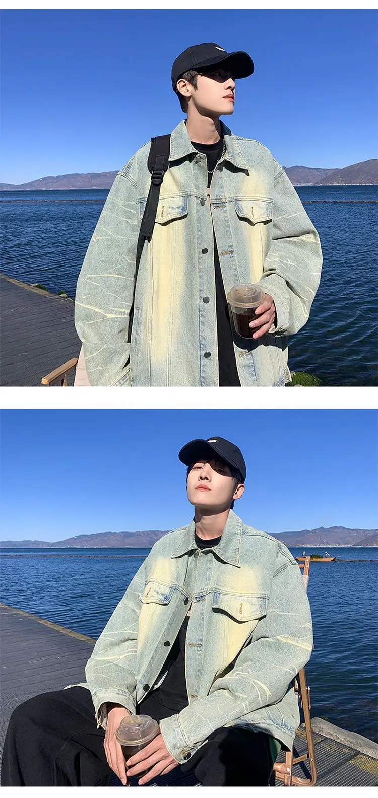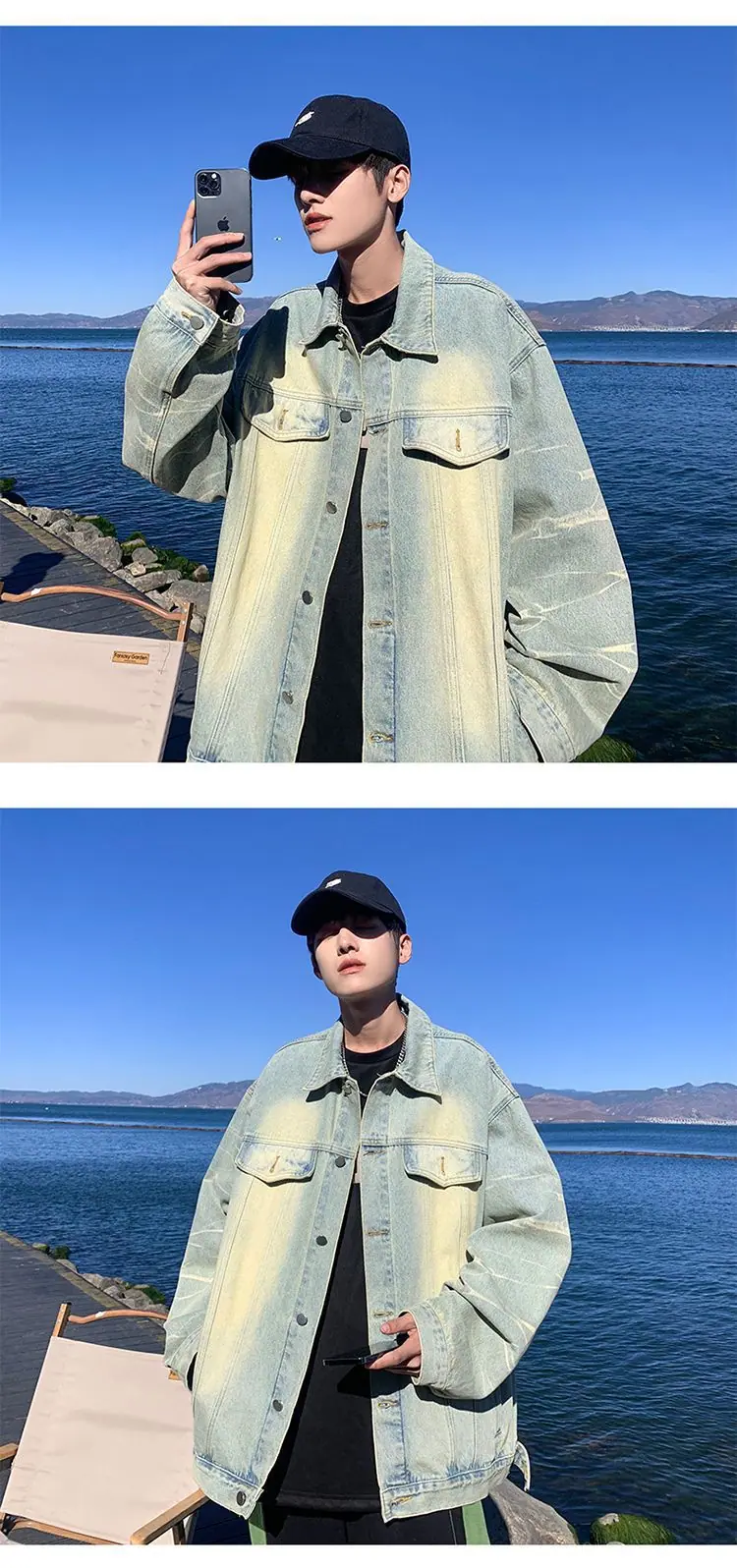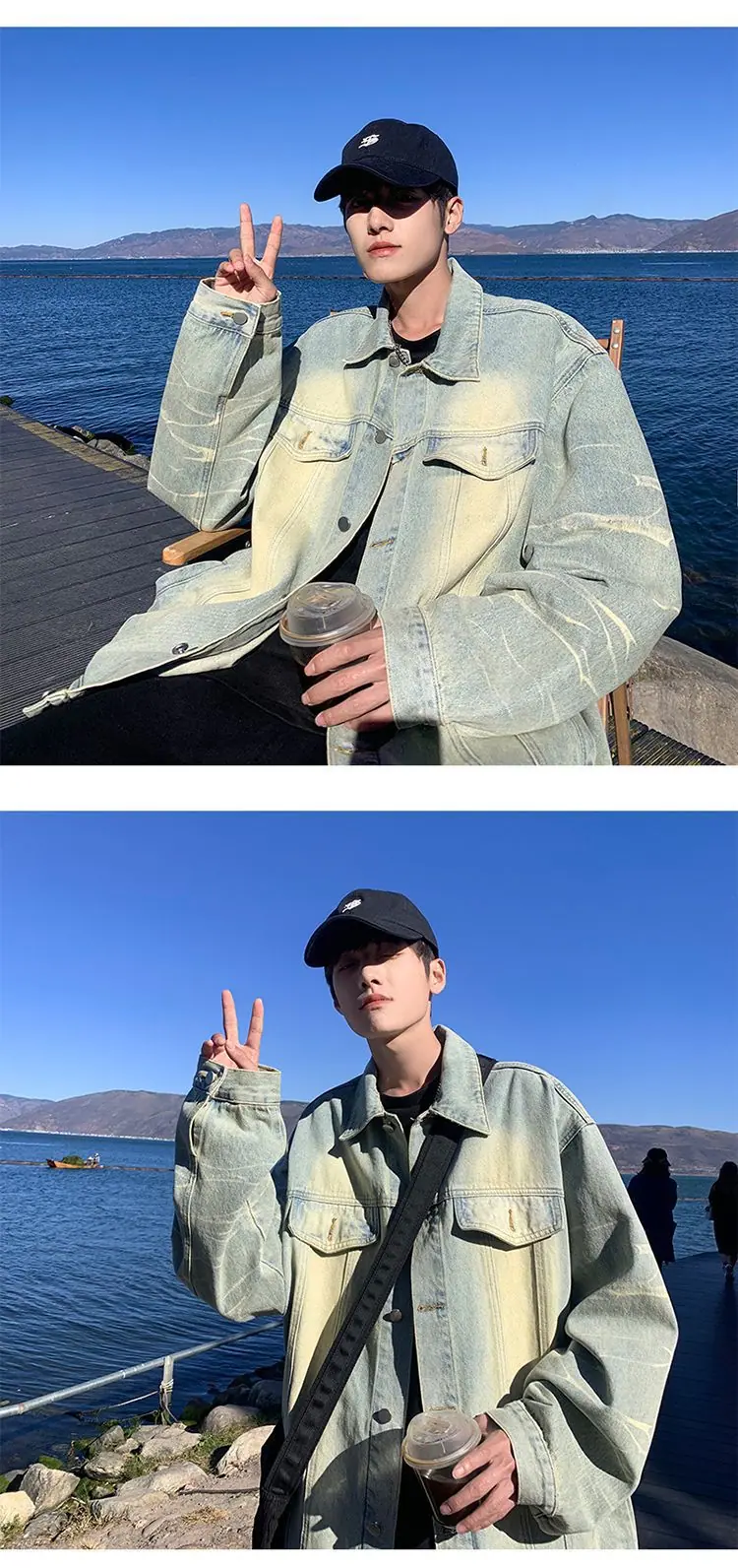 Chaqueta de mezclilla degradada para hombre Otoño Americano Retro High Street Ropa de trabajo Chaqueta Marca de moda Tendencia Suelta Casual Top