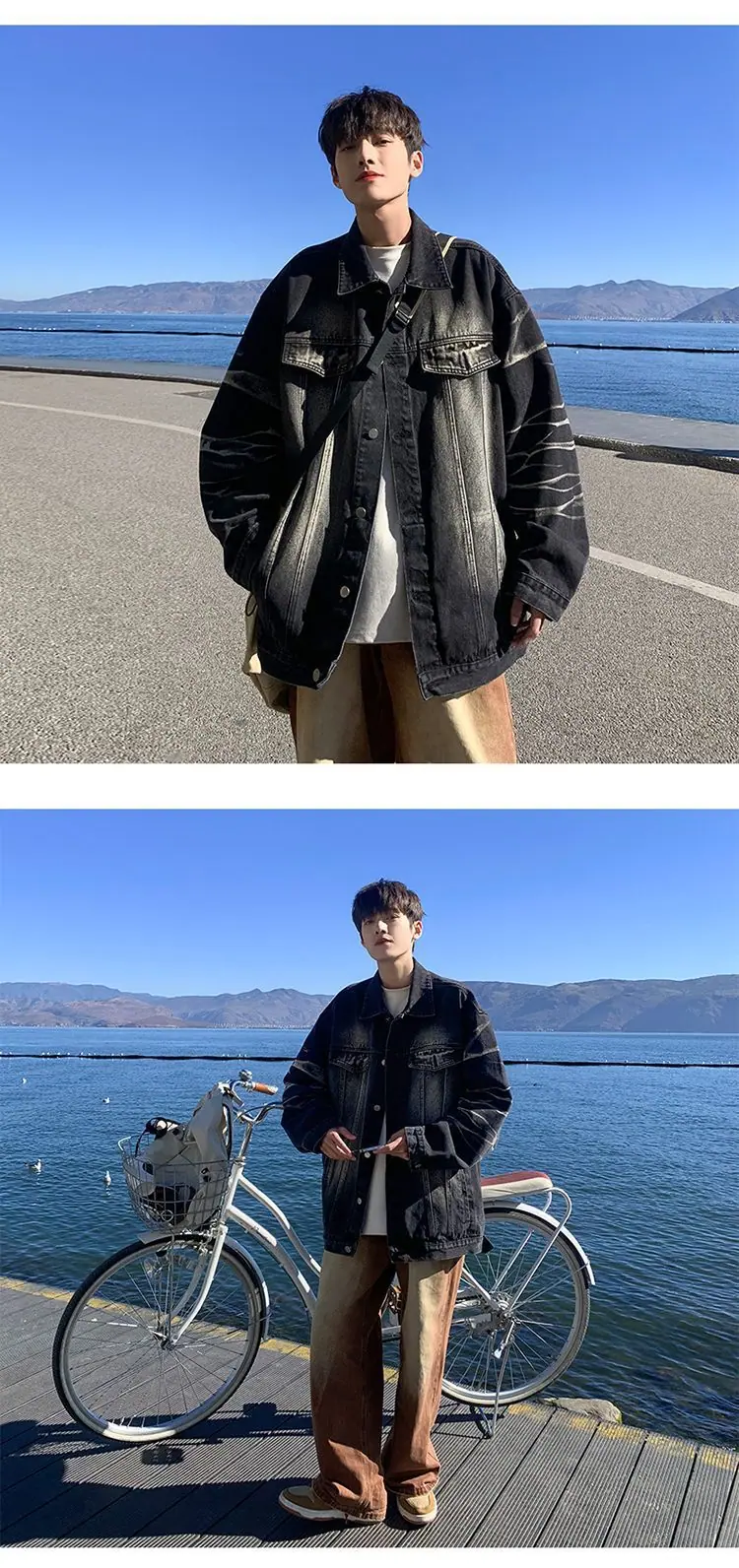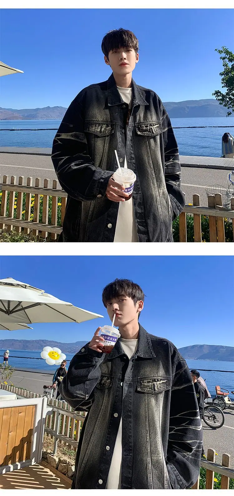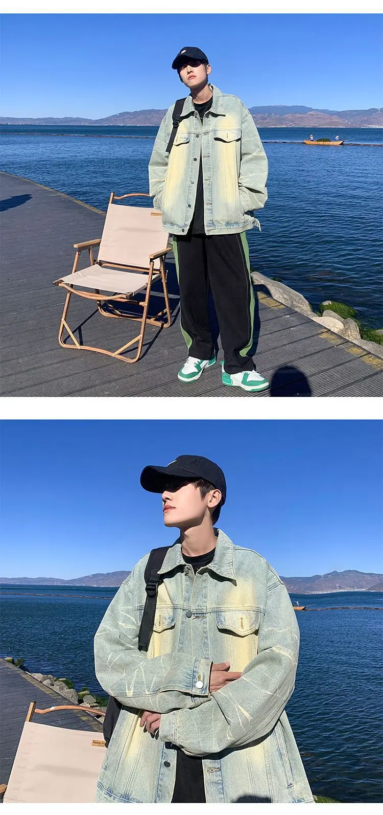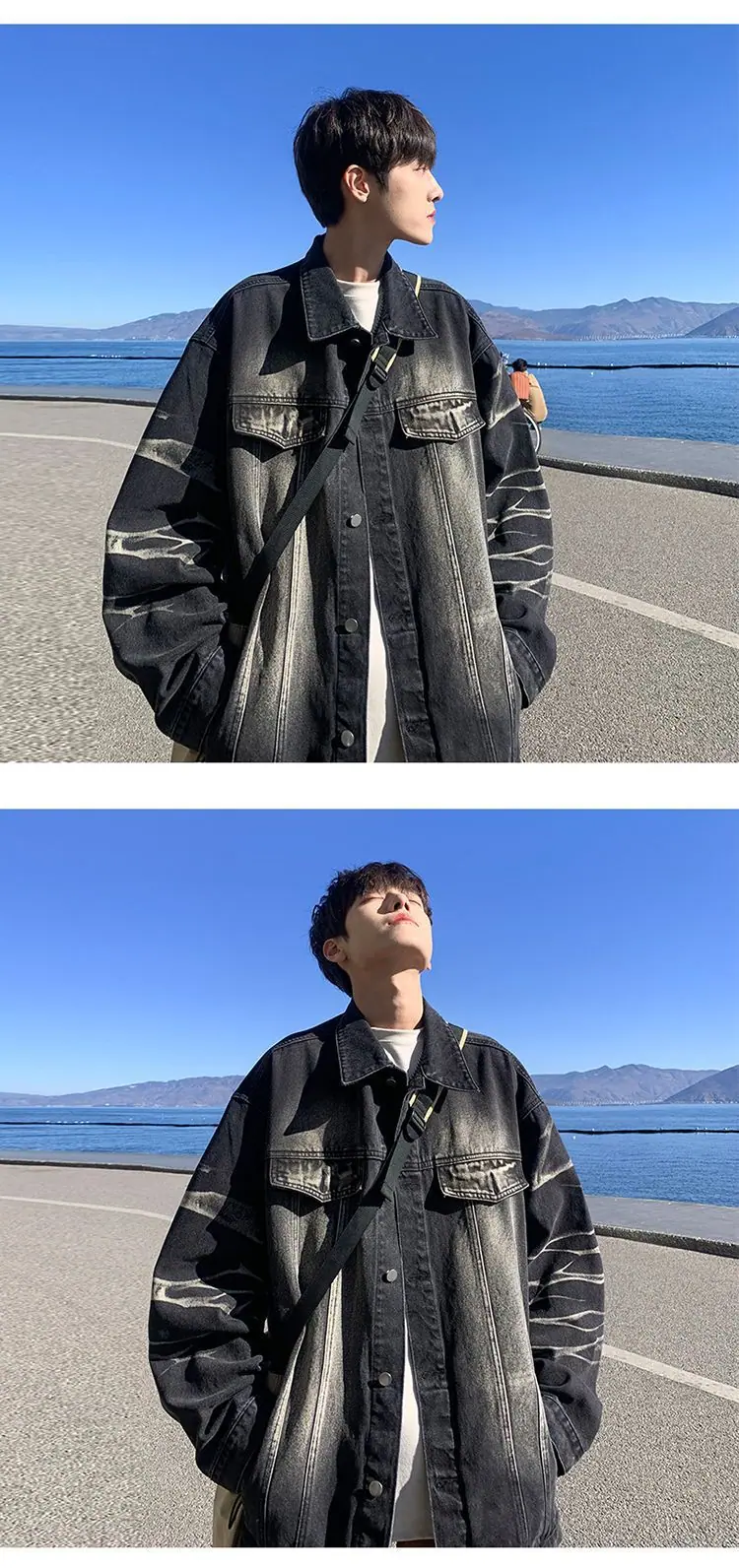 Chaqueta de mezclilla degradada para hombre Otoño Americano Retro High Street Ropa de trabajo Chaqueta Marca de moda Tendencia Suelta Casual Top