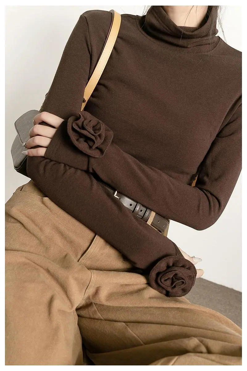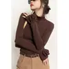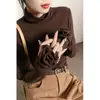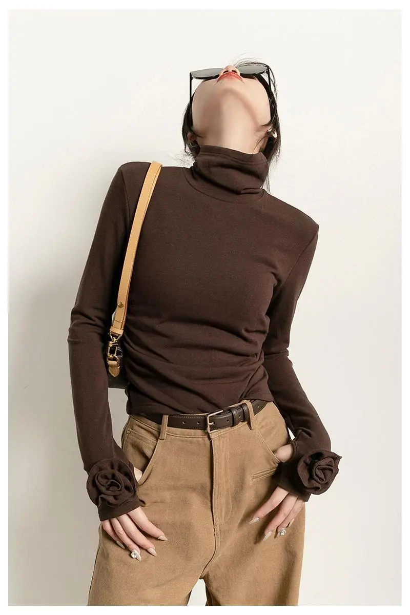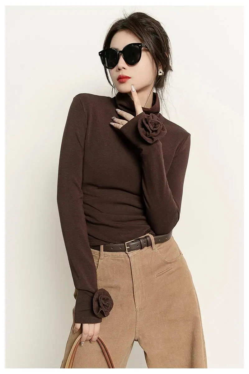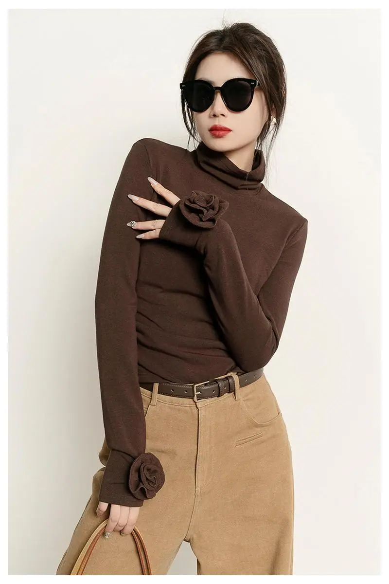 Exquisita camiseta de capa base de cuello alto de mylar teñido anudado marrón con forro polar para mujer, otoño e invierno, corte ajustado, alta elasticidad, manga larga