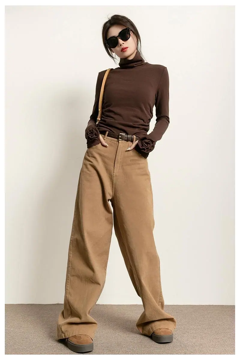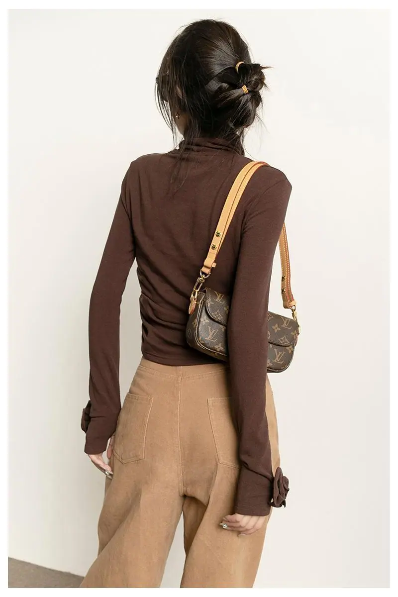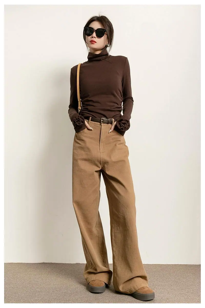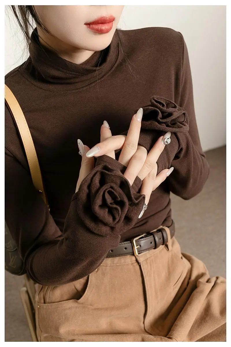 Exquisita camiseta de capa base de cuello alto de mylar teñido anudado marrón con forro polar para mujer, otoño e invierno, corte ajustado, alta elasticidad, manga larga