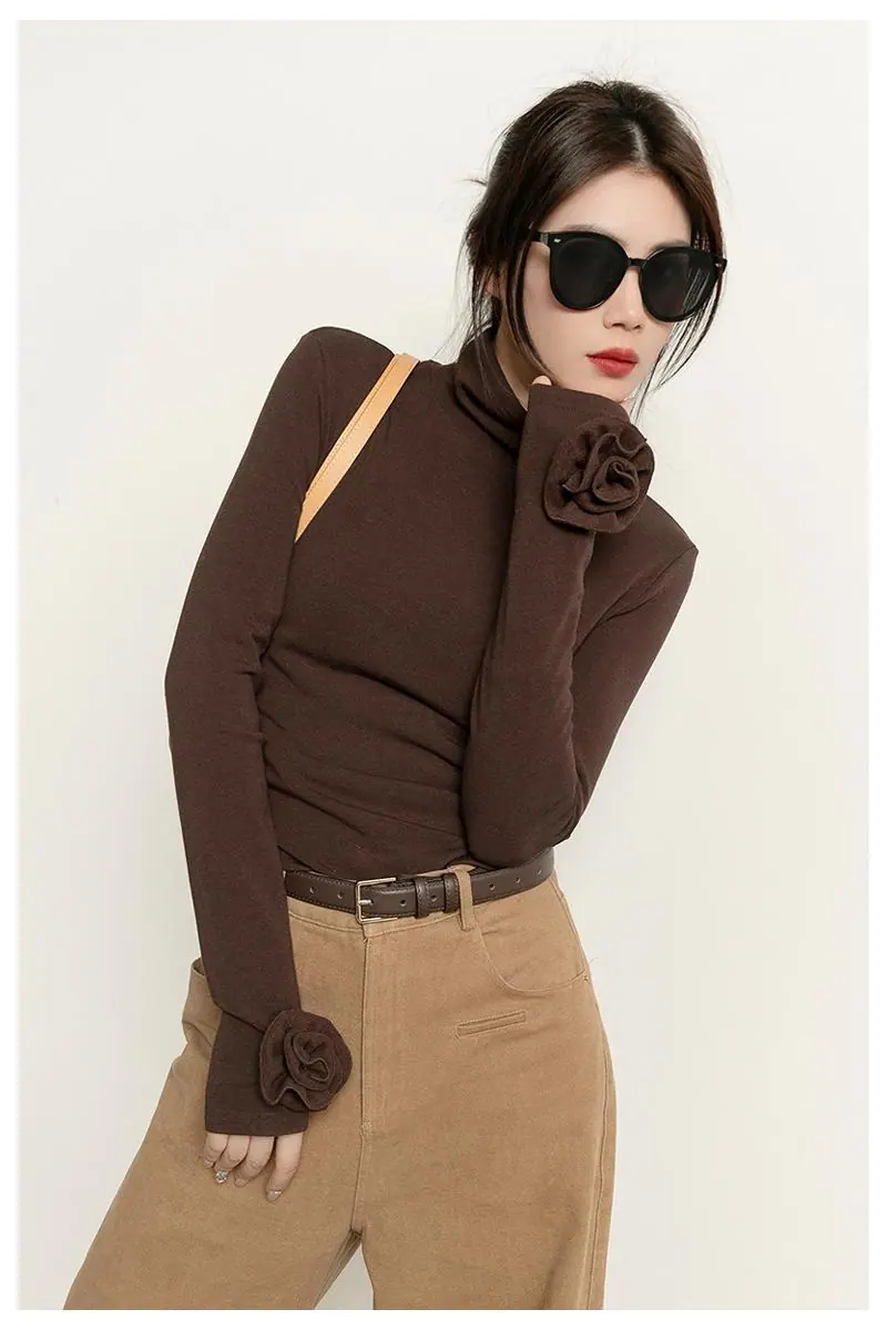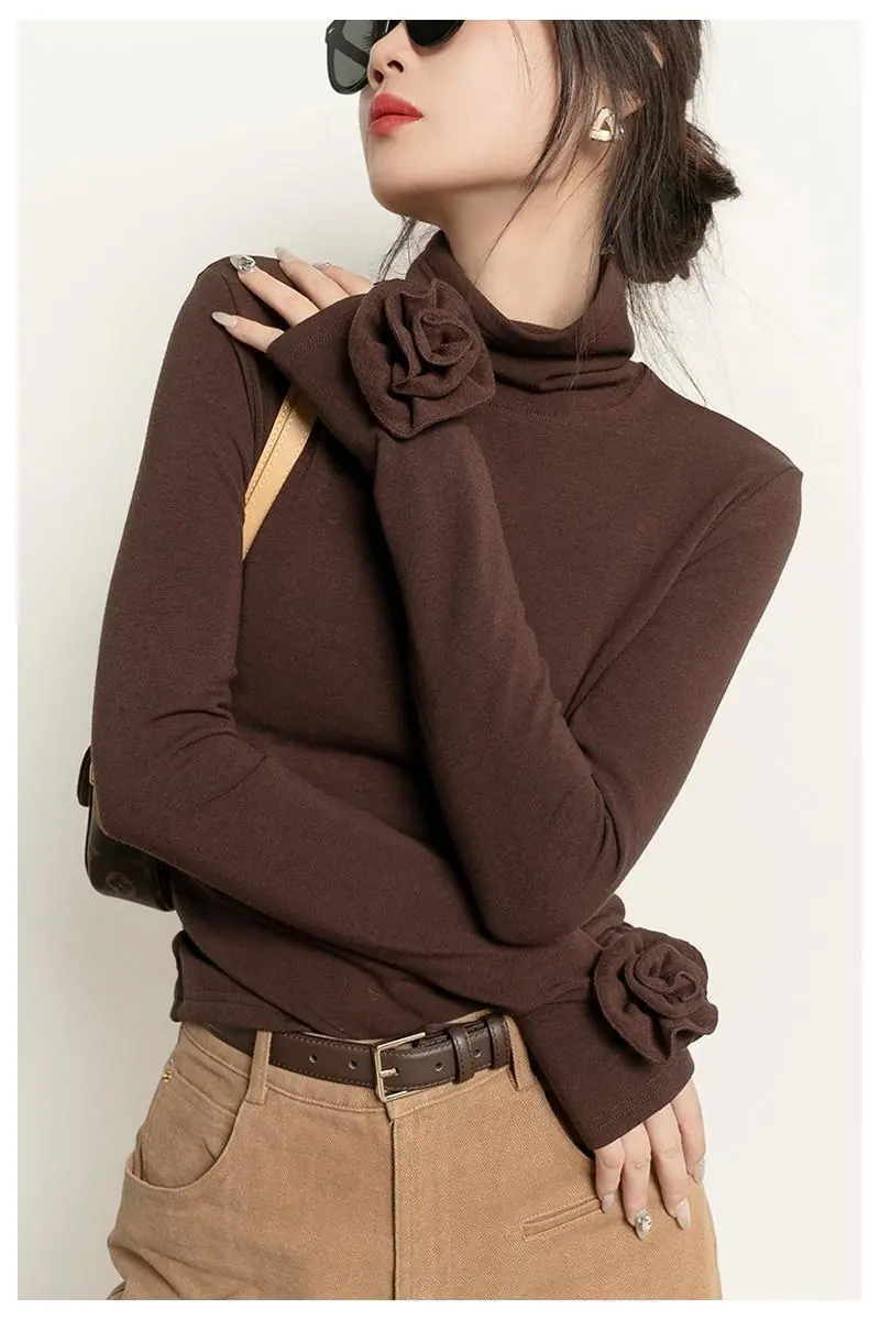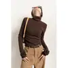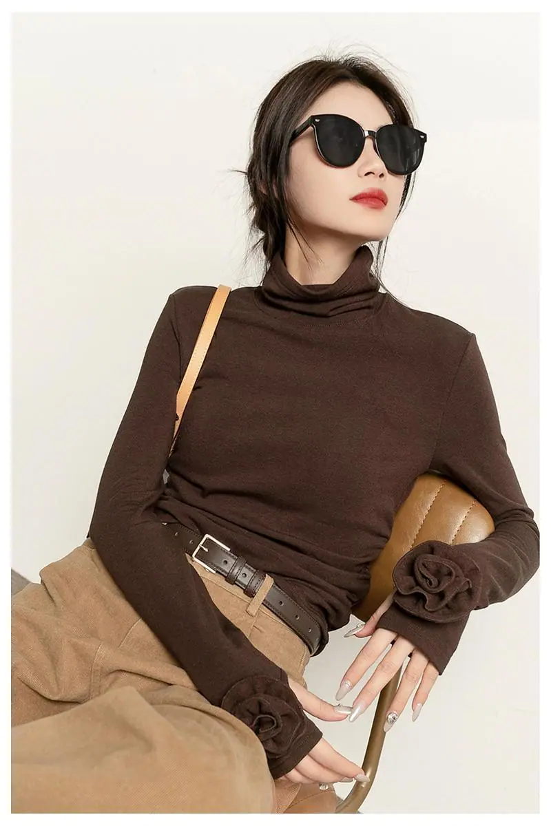 Compra Exquisita camiseta de capa base de cuello alto de mylar teñido anudado marrón con forro polar para mujer, otoño e invierno, corte ajustado, alta elasticidad, manga larga al por mayor en Joom.pro