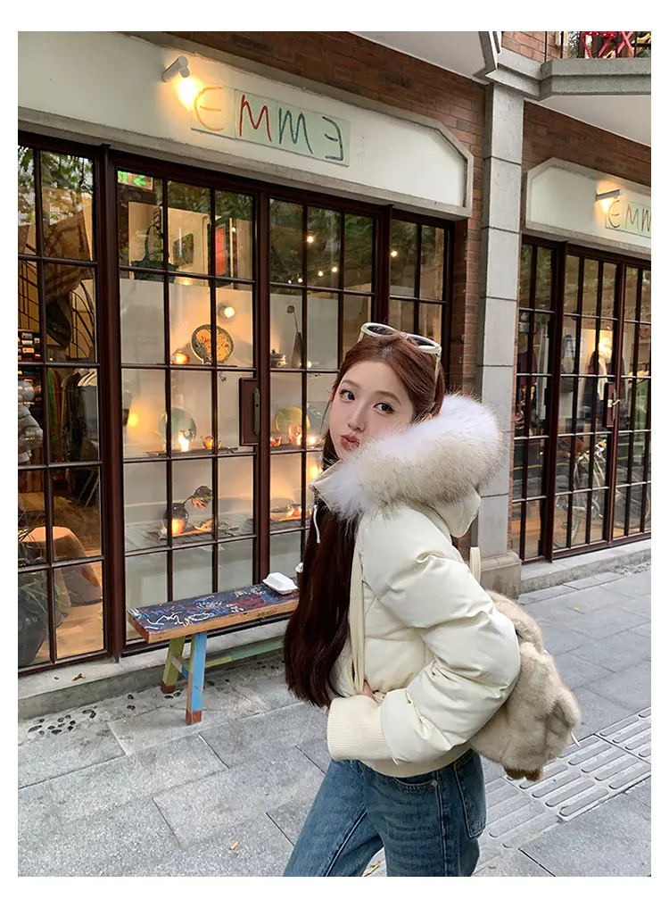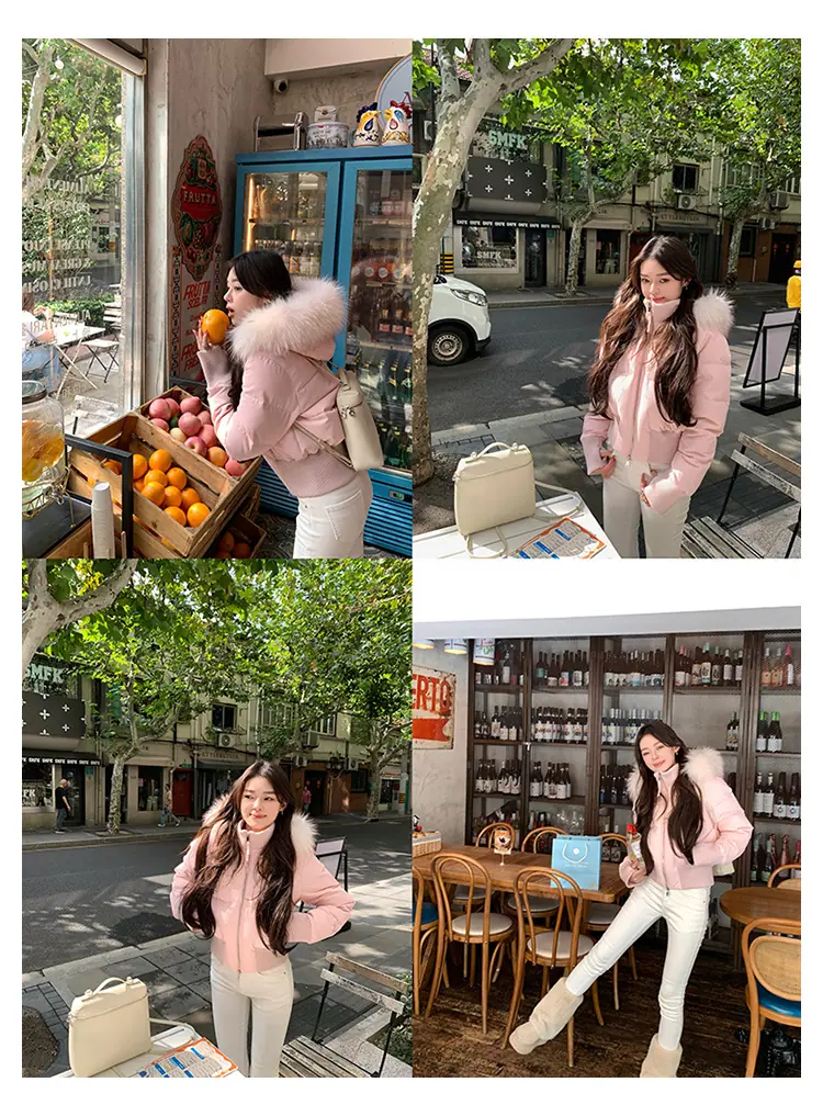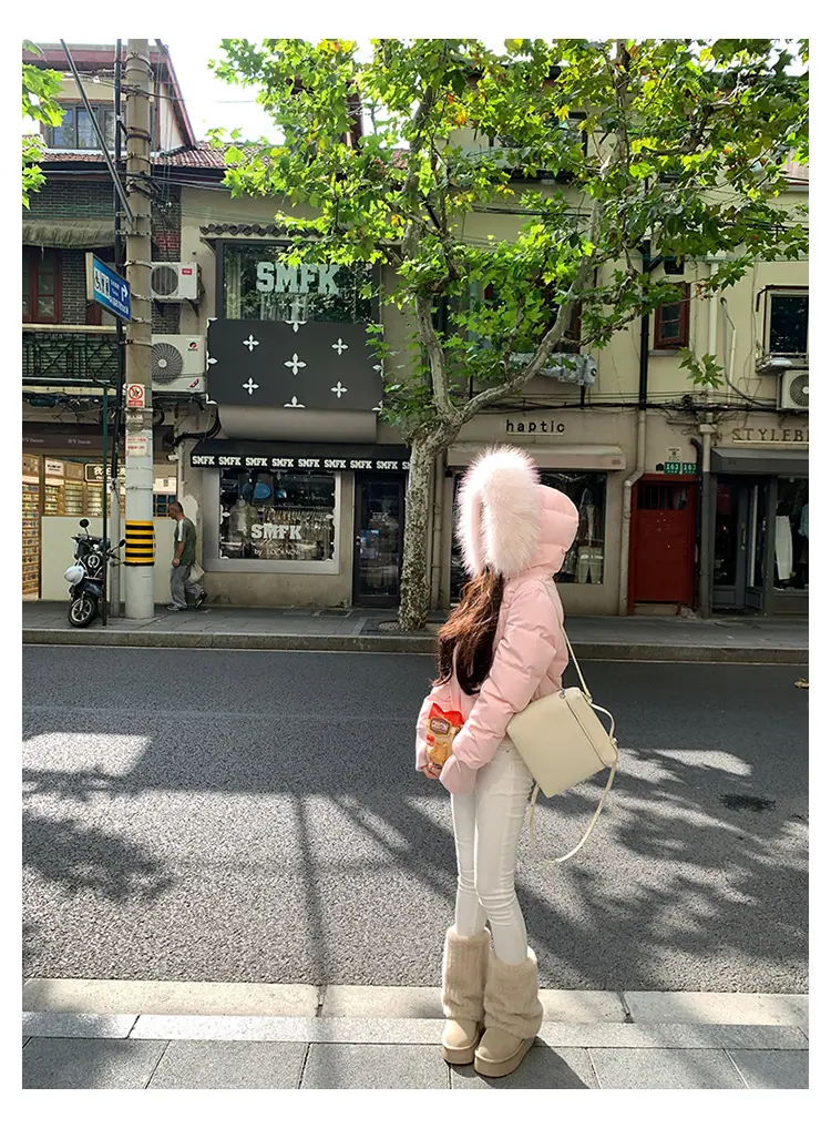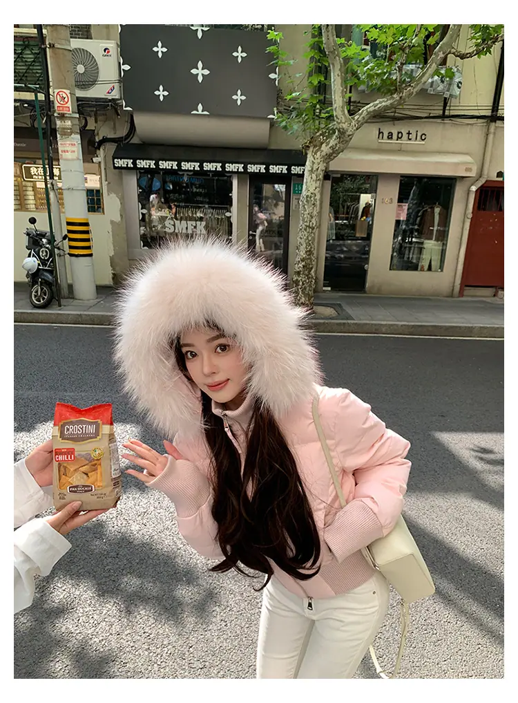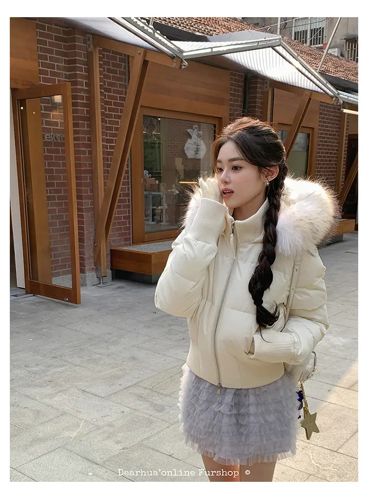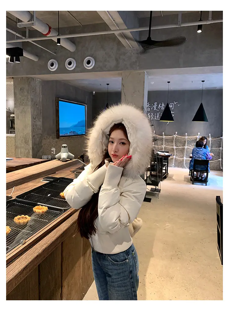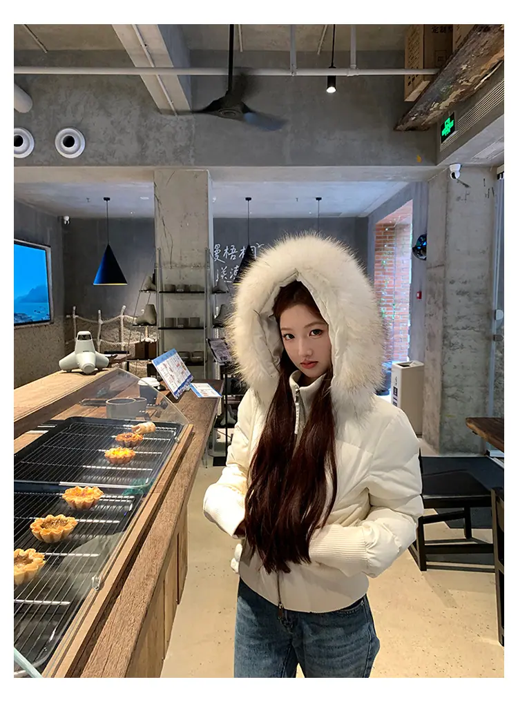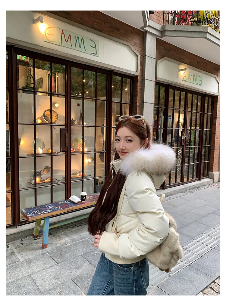2025 Invierno Nuevo Chaqueta de Plumón Corta para Mujer con Cuello Grande de Piel Moda Americana Chica Picante Sentido de Alta Gama Abrigo Adelgazante de Cintura