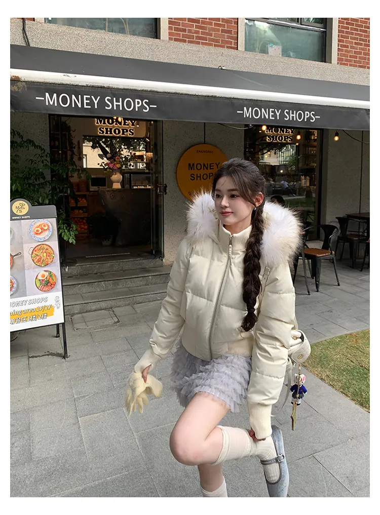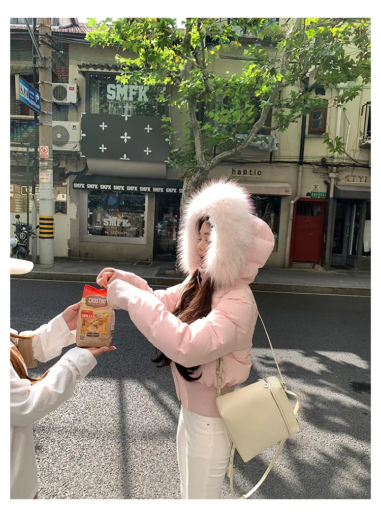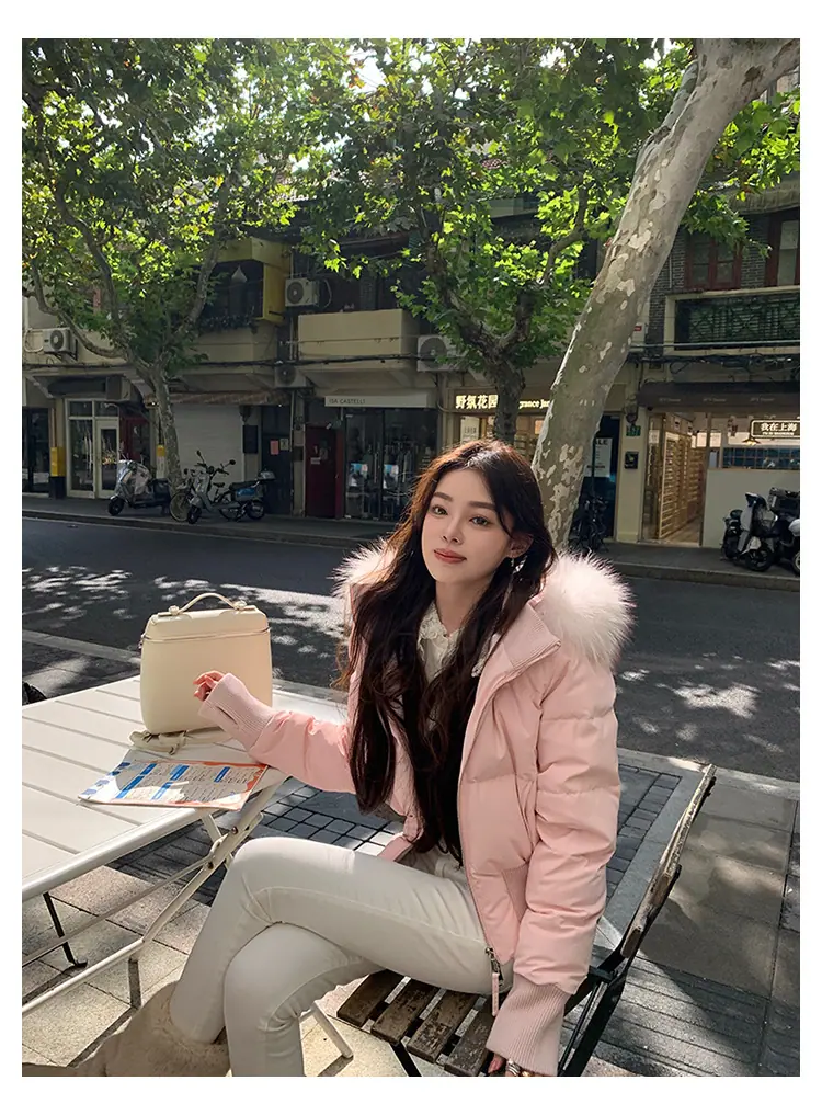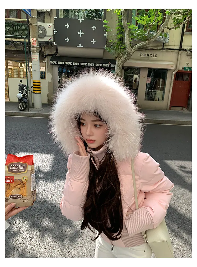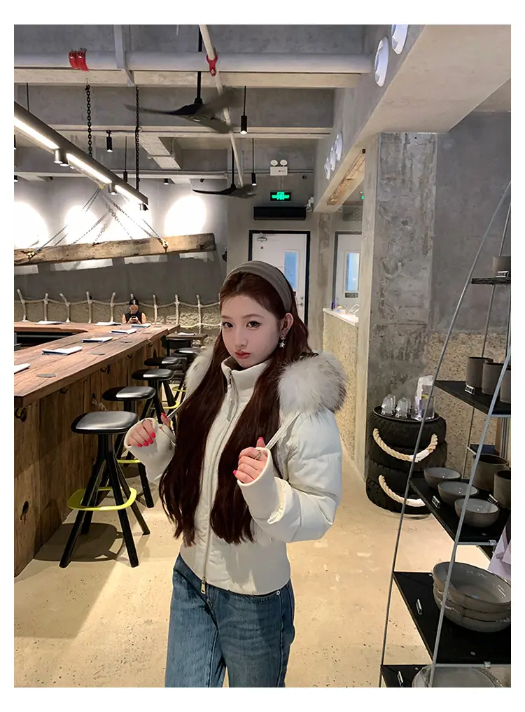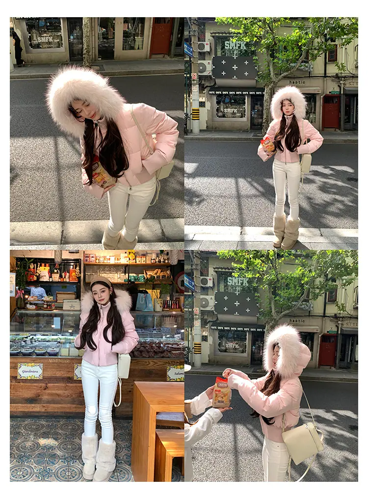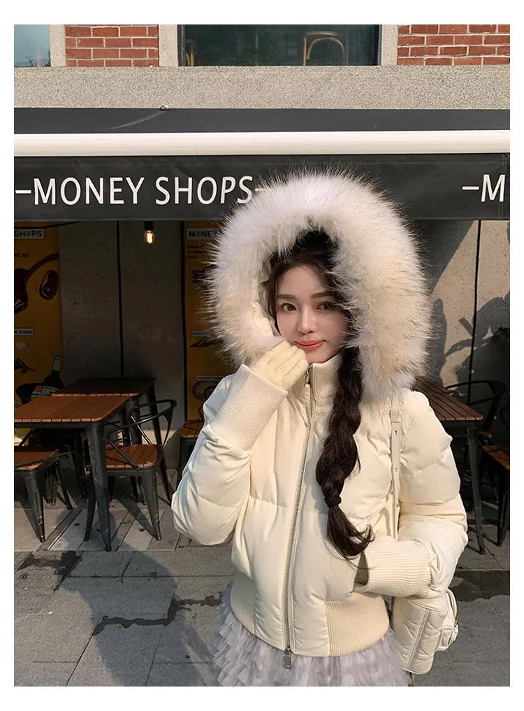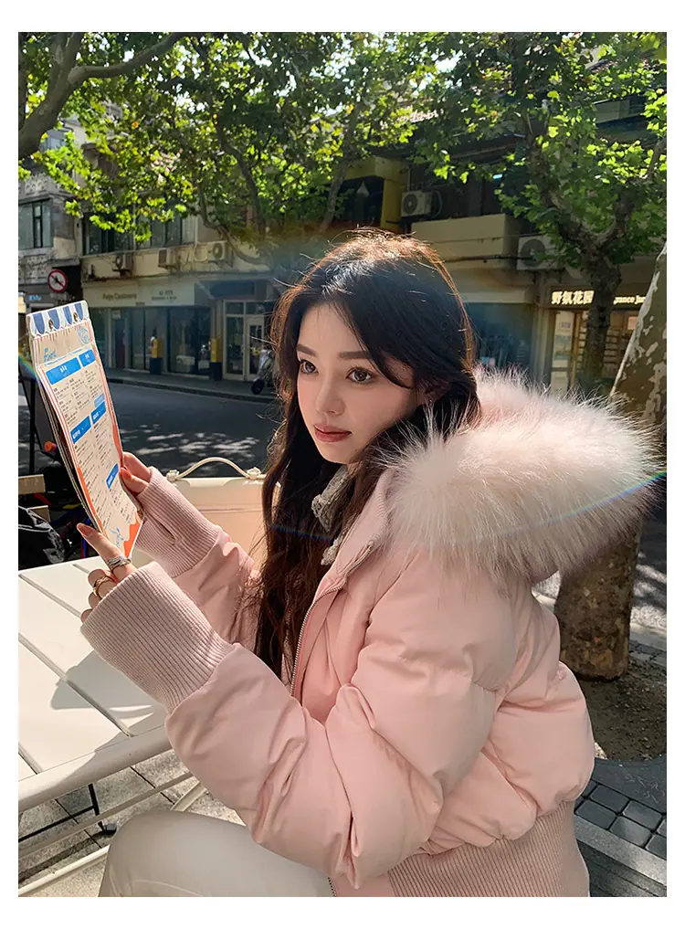 2025 Invierno Nuevo Chaqueta de Plumón Corta para Mujer con Cuello Grande de Piel Moda Americana Chica Picante Sentido de Alta Gama Abrigo Adelgazante de Cintura