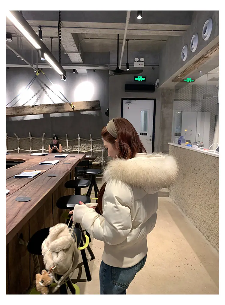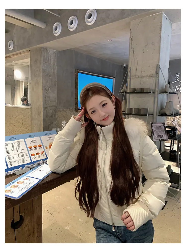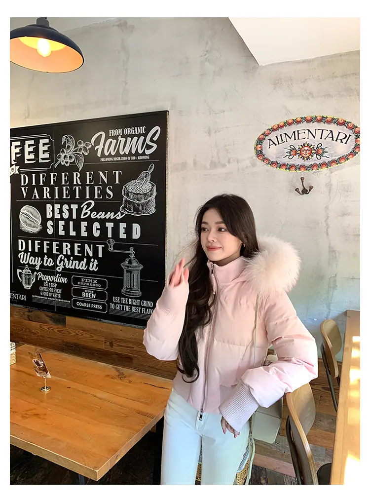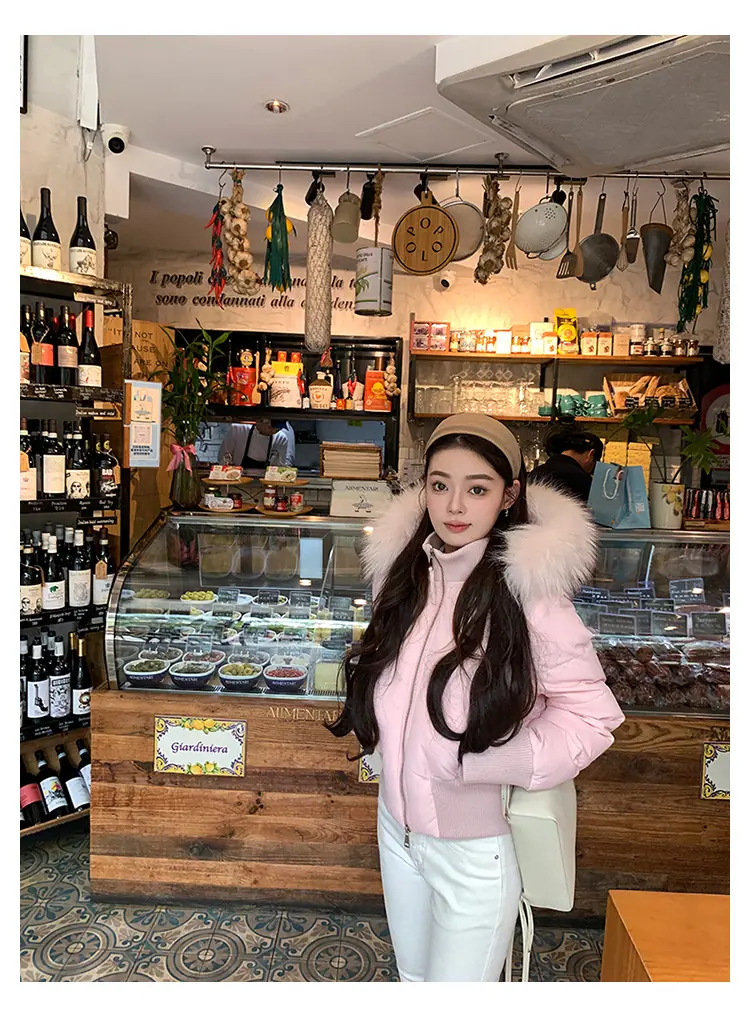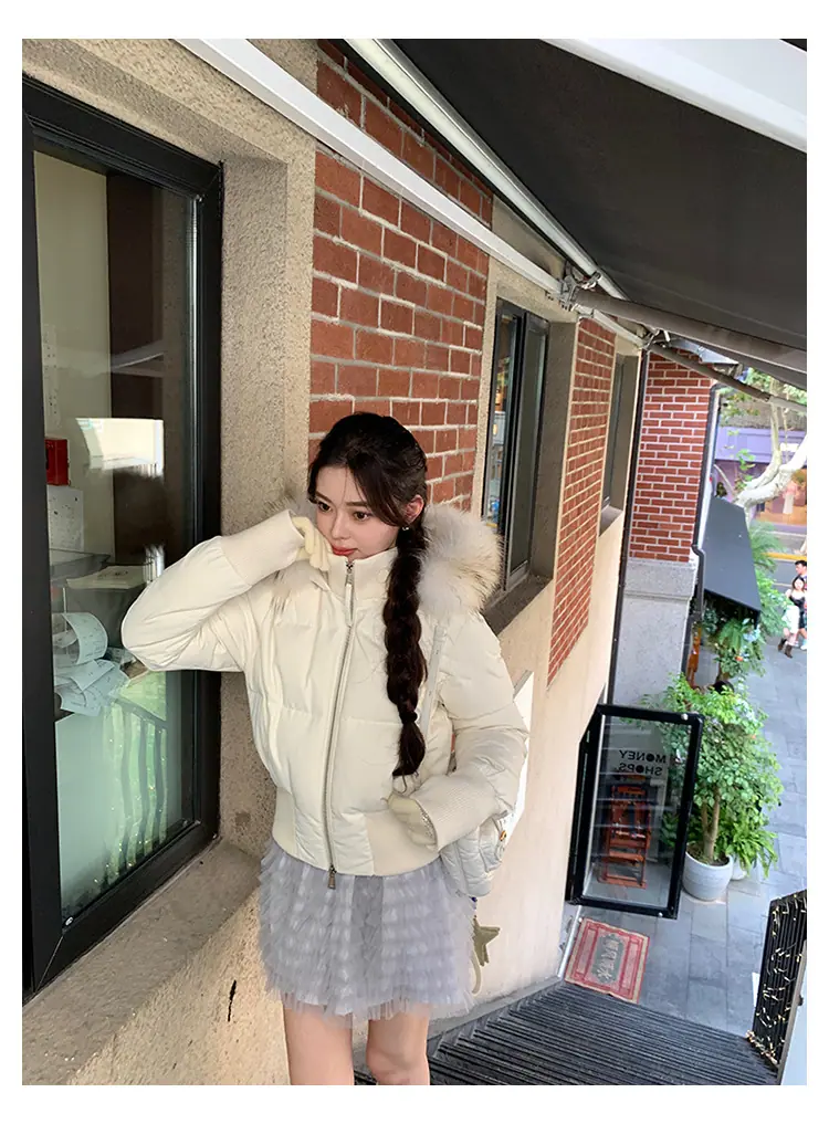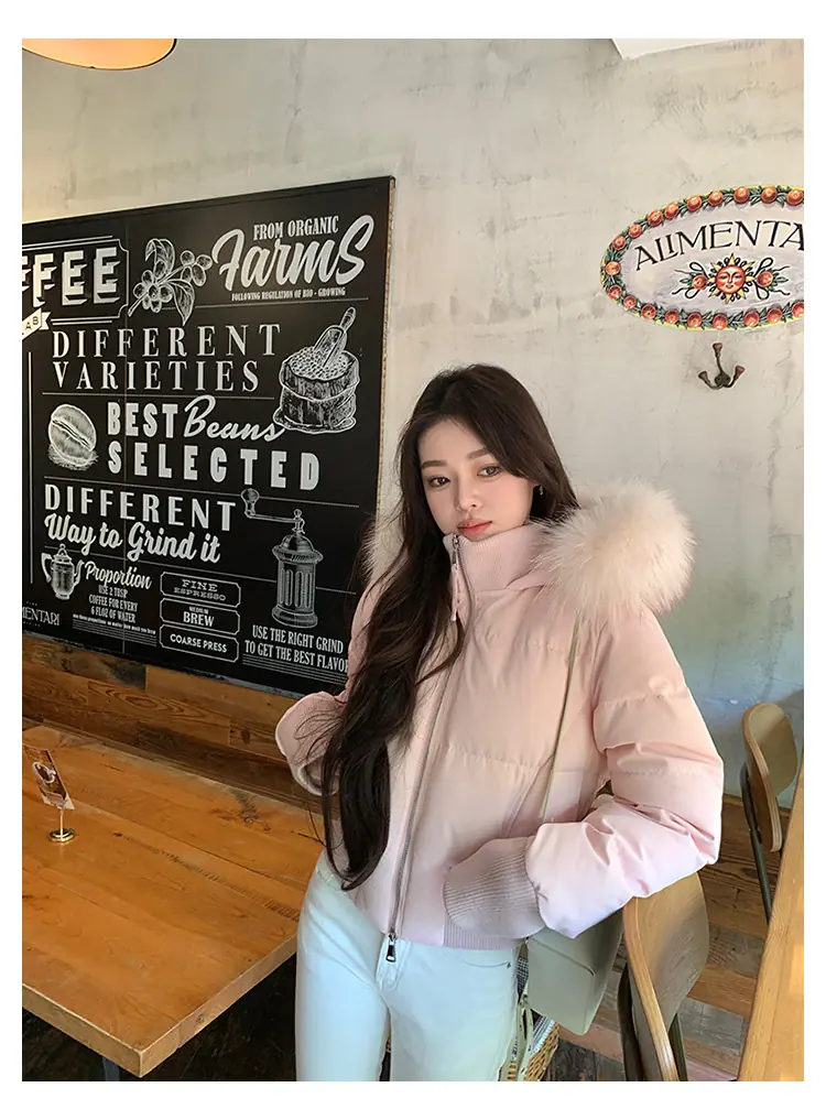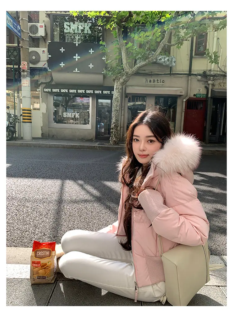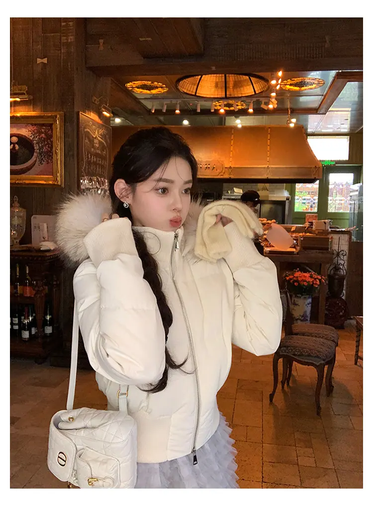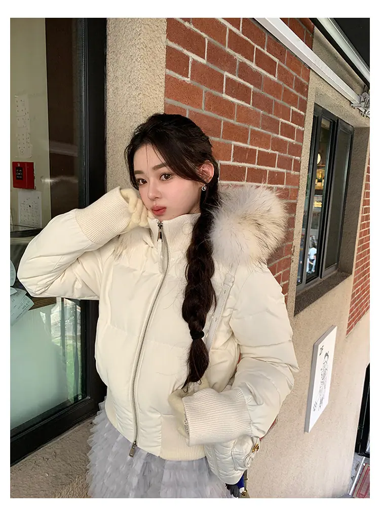 2025 Invierno Nuevo Chaqueta de Plumón Corta para Mujer con Cuello Grande de Piel Moda Americana Chica Picante Sentido de Alta Gama Abrigo Adelgazante de Cintura