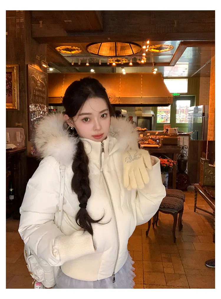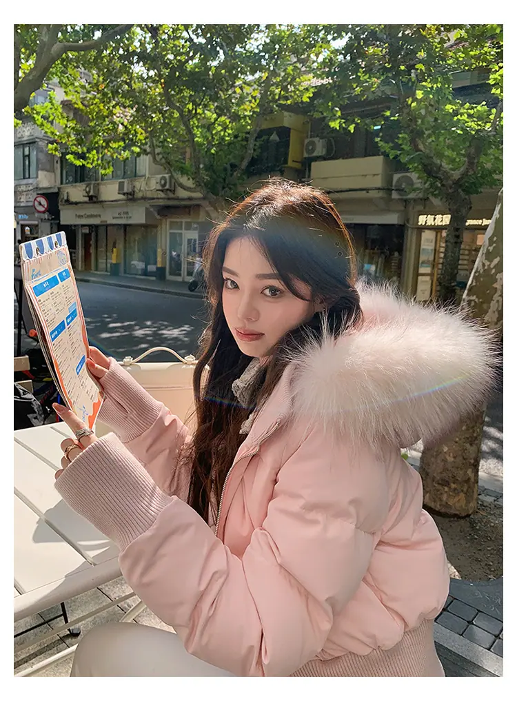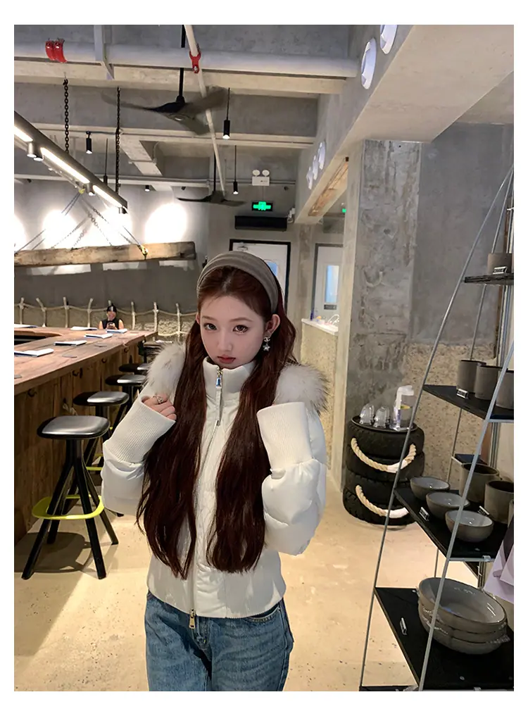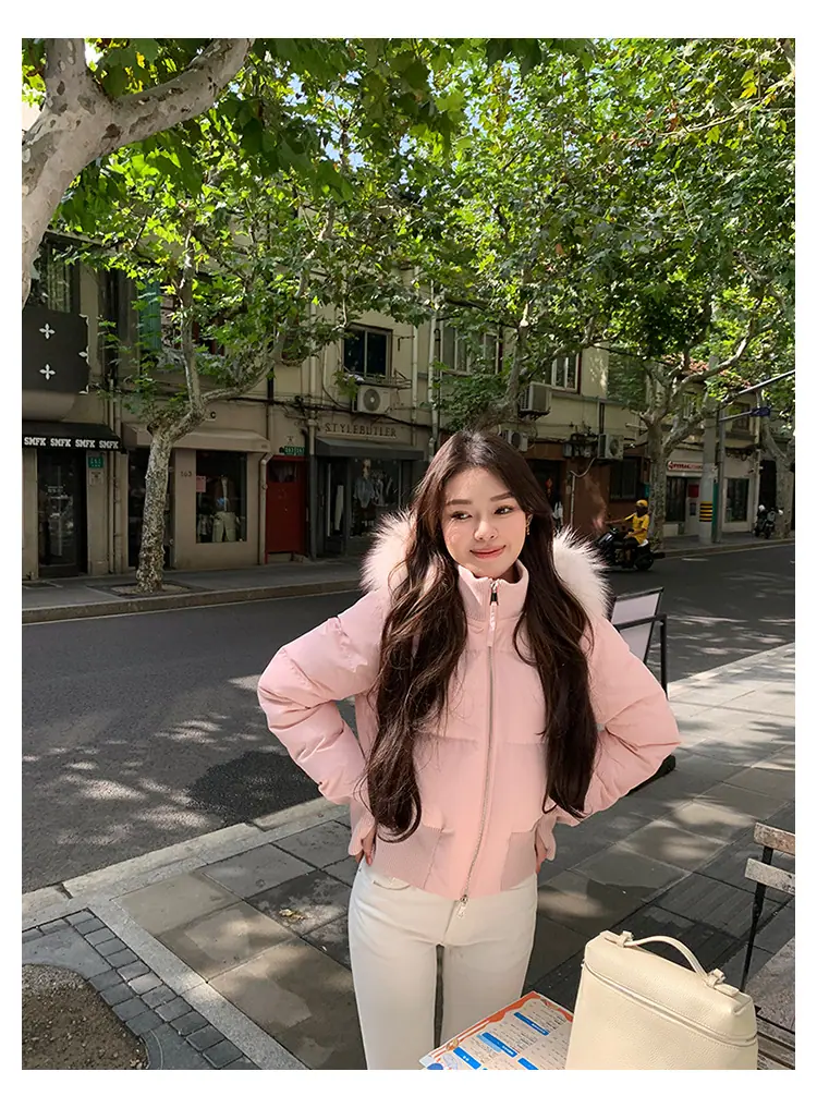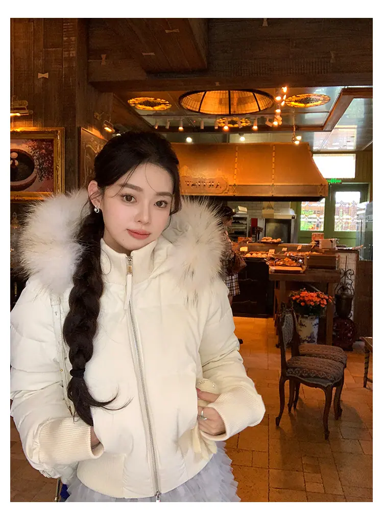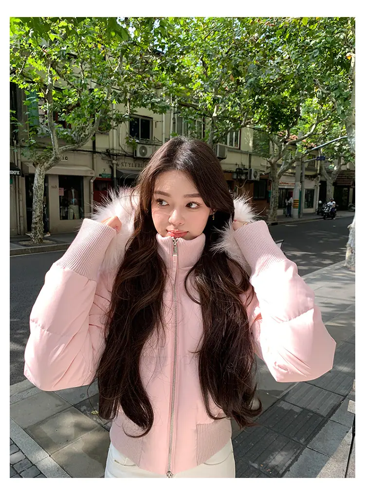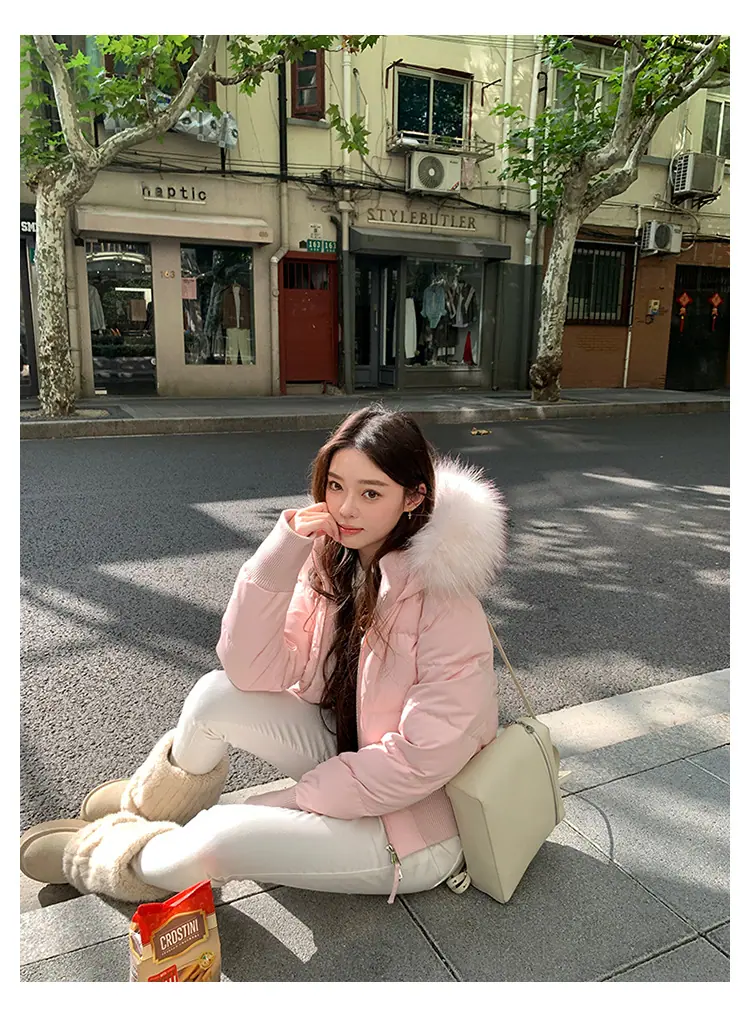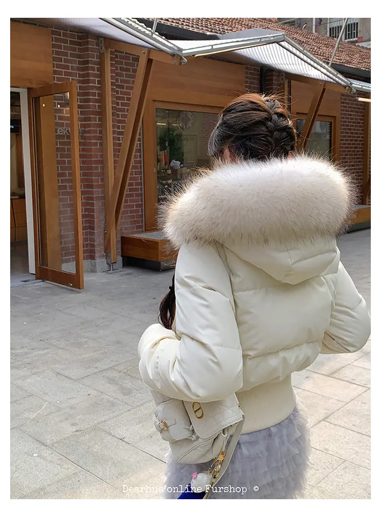 2025 Invierno Nuevo Chaqueta de Plumón Corta para Mujer con Cuello Grande de Piel Moda Americana Chica Picante Sentido de Alta Gama Abrigo Adelgazante de Cintura