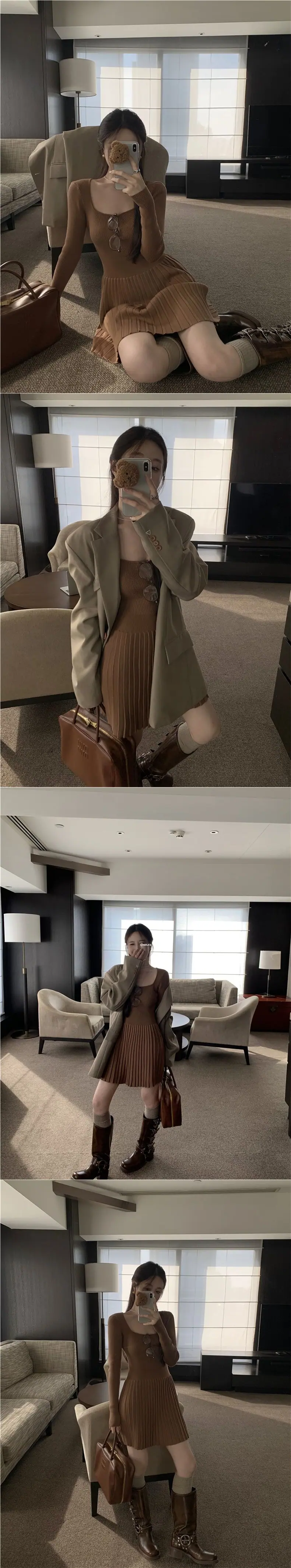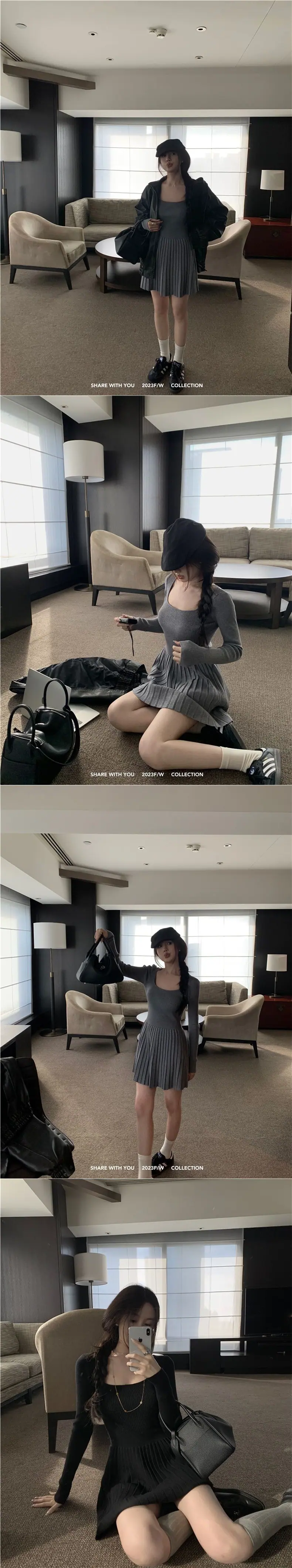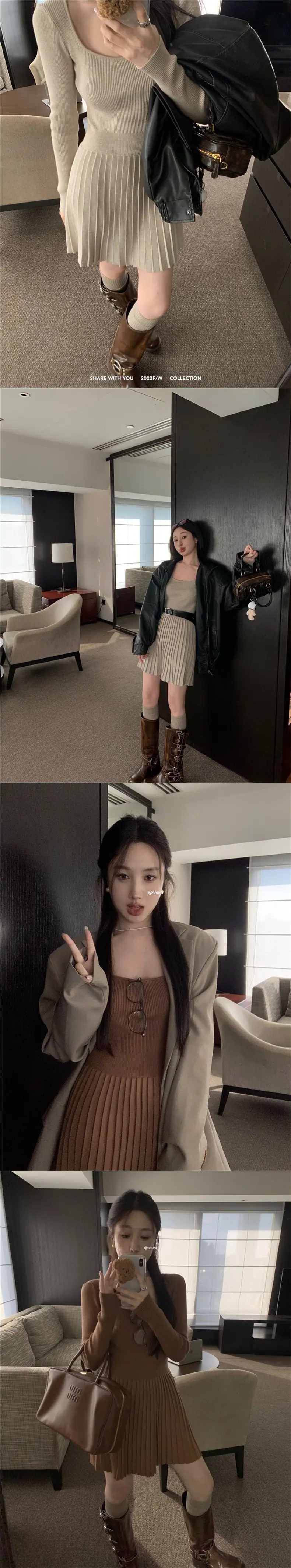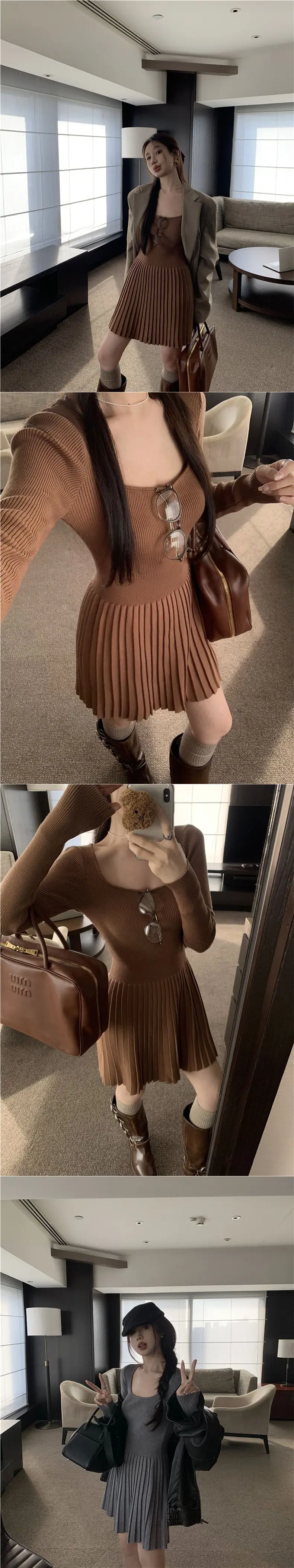 Vestido de Punto de Manga Larga Estilo Francés para Mujer en Otoño, Falda Plisada Slim con Falda Corta Debajo