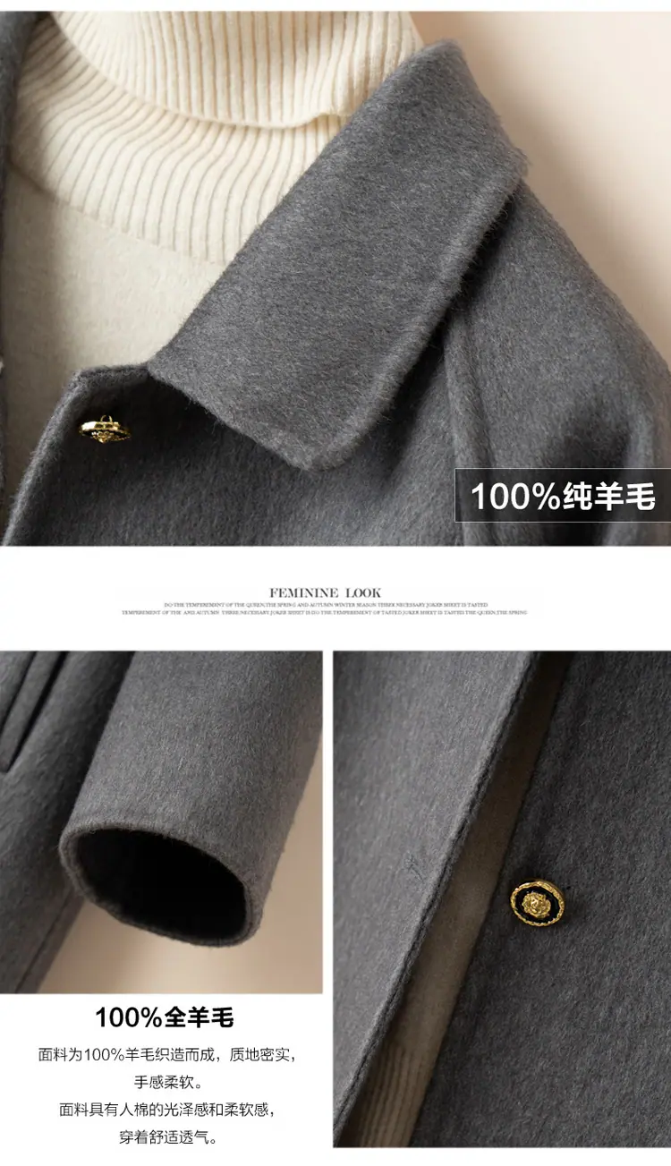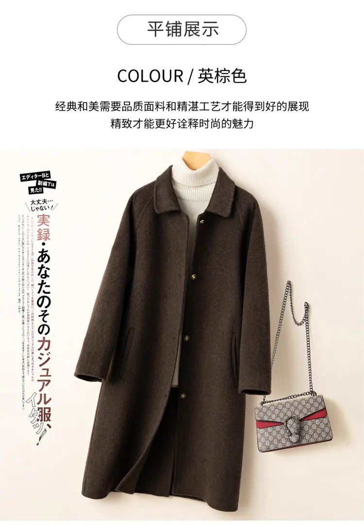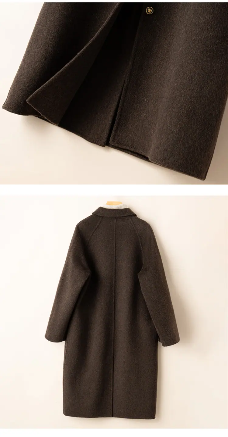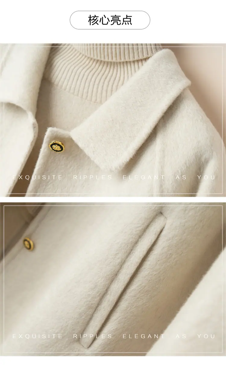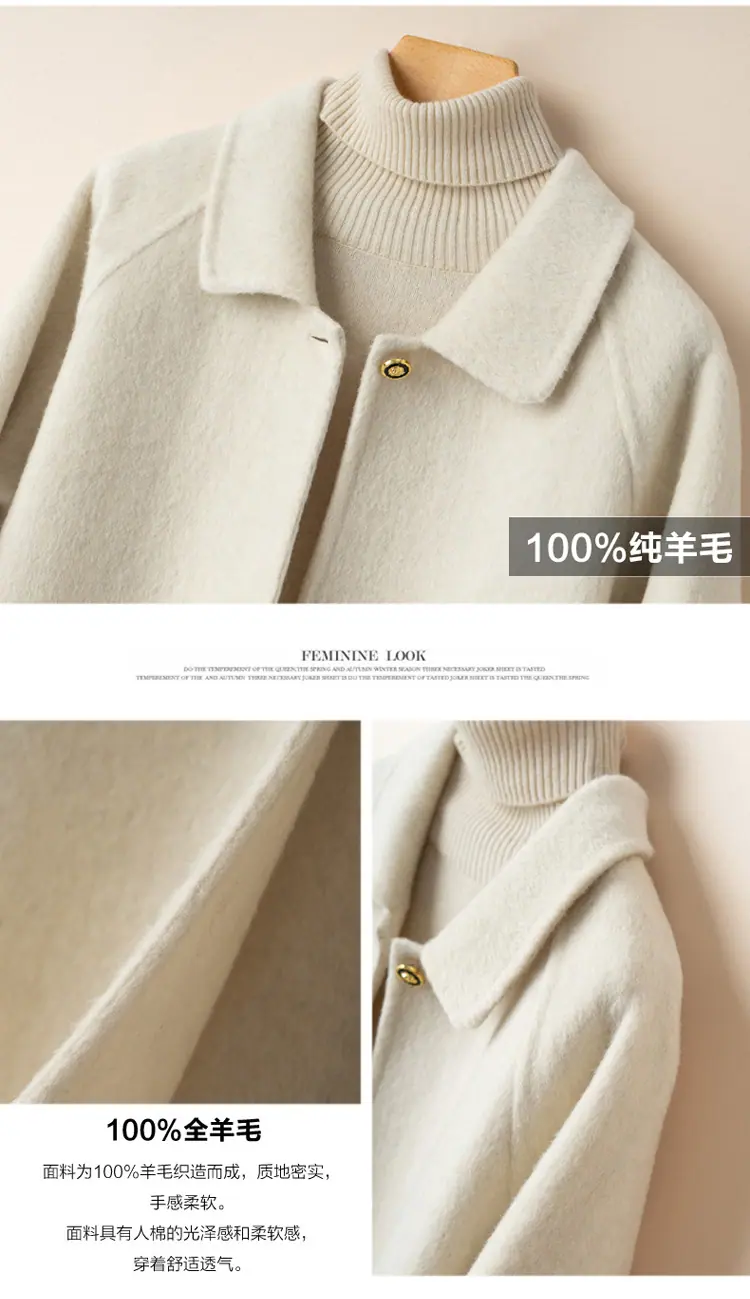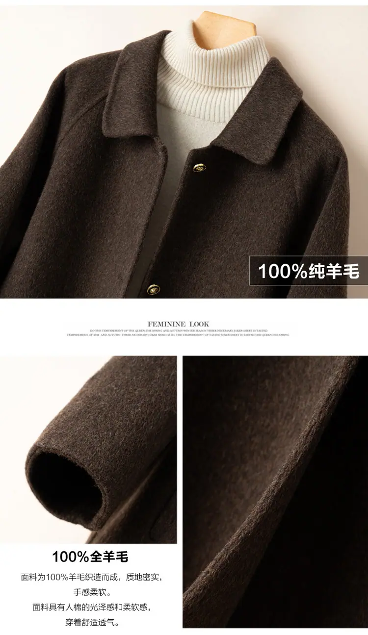 2024 Otoño e Invierno Nuevo Abrigo de Lana de Doble Cara para Mujer Largo Medio Raglán Suelto Chaqueta con Bolsillo