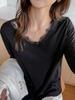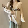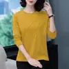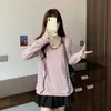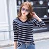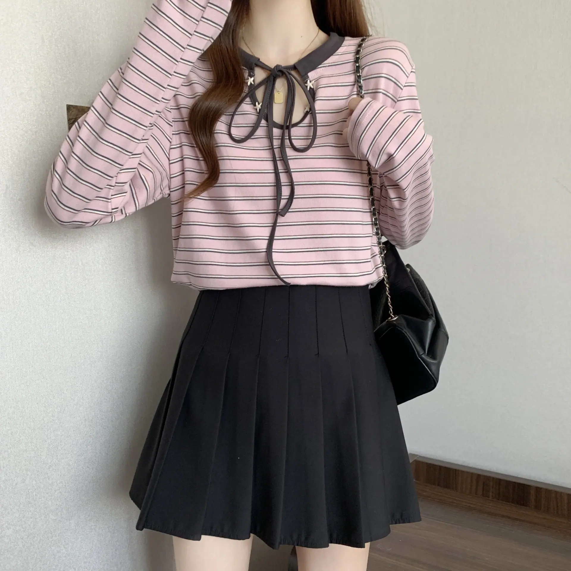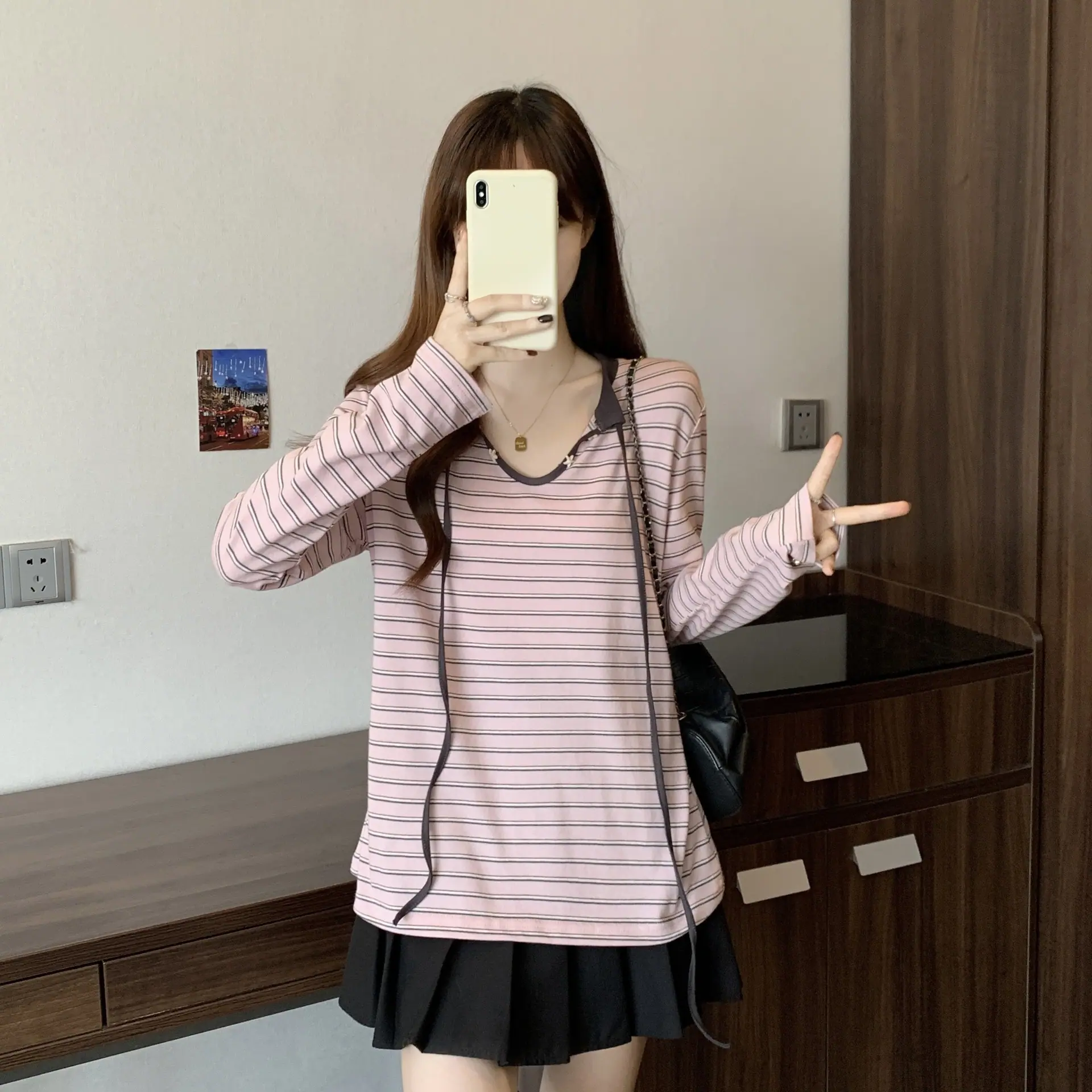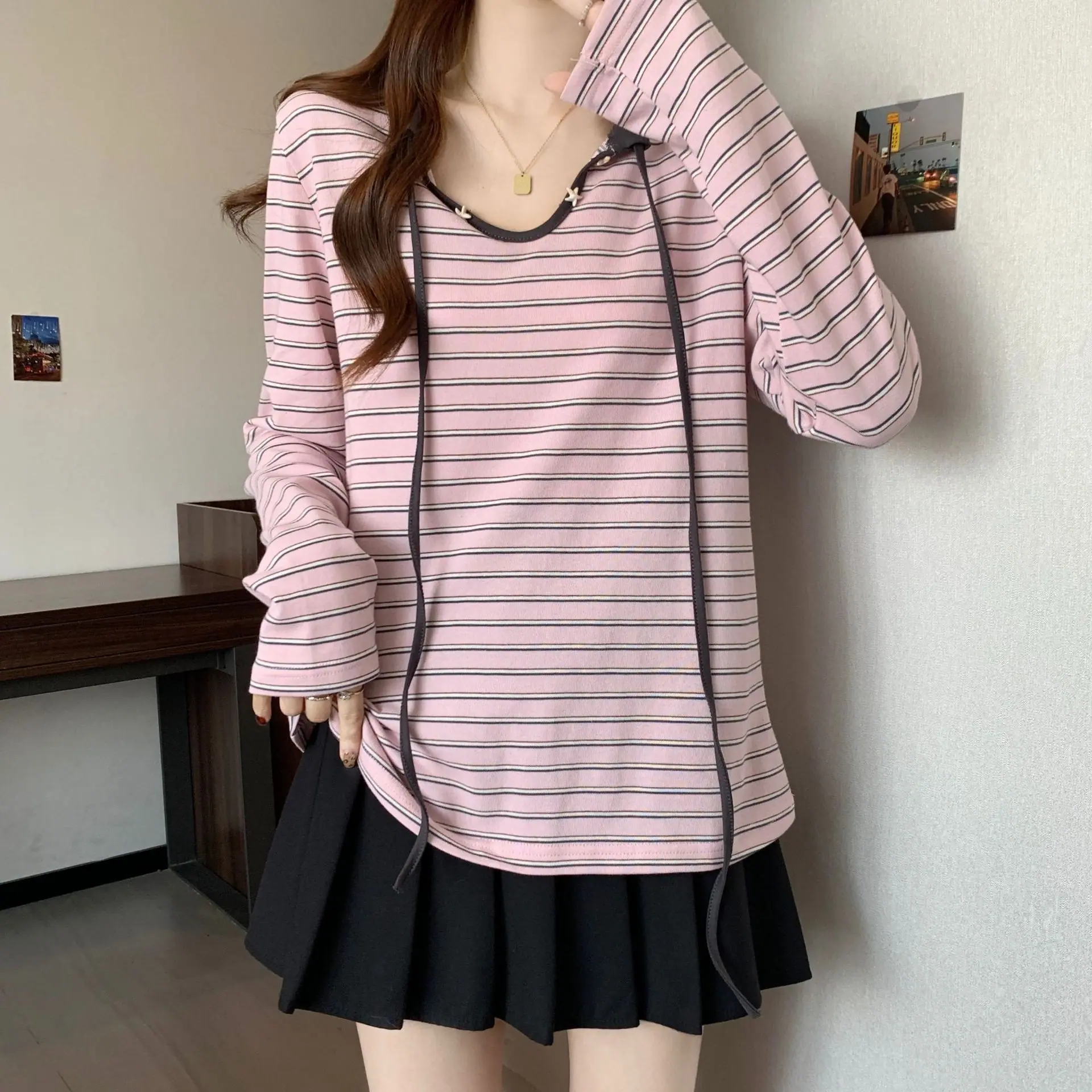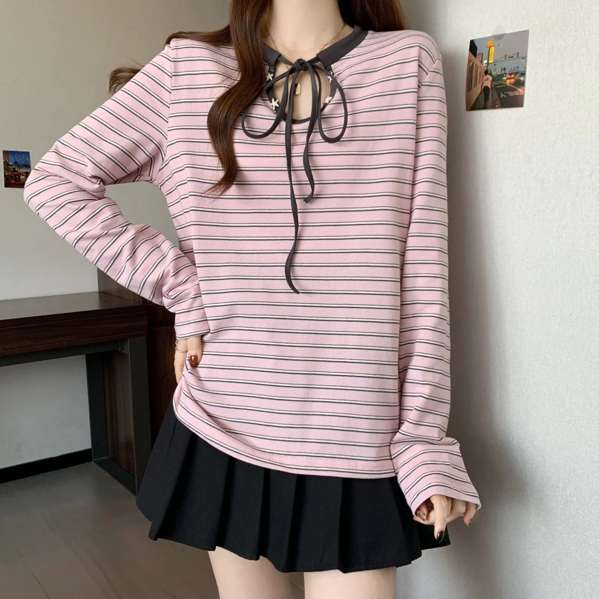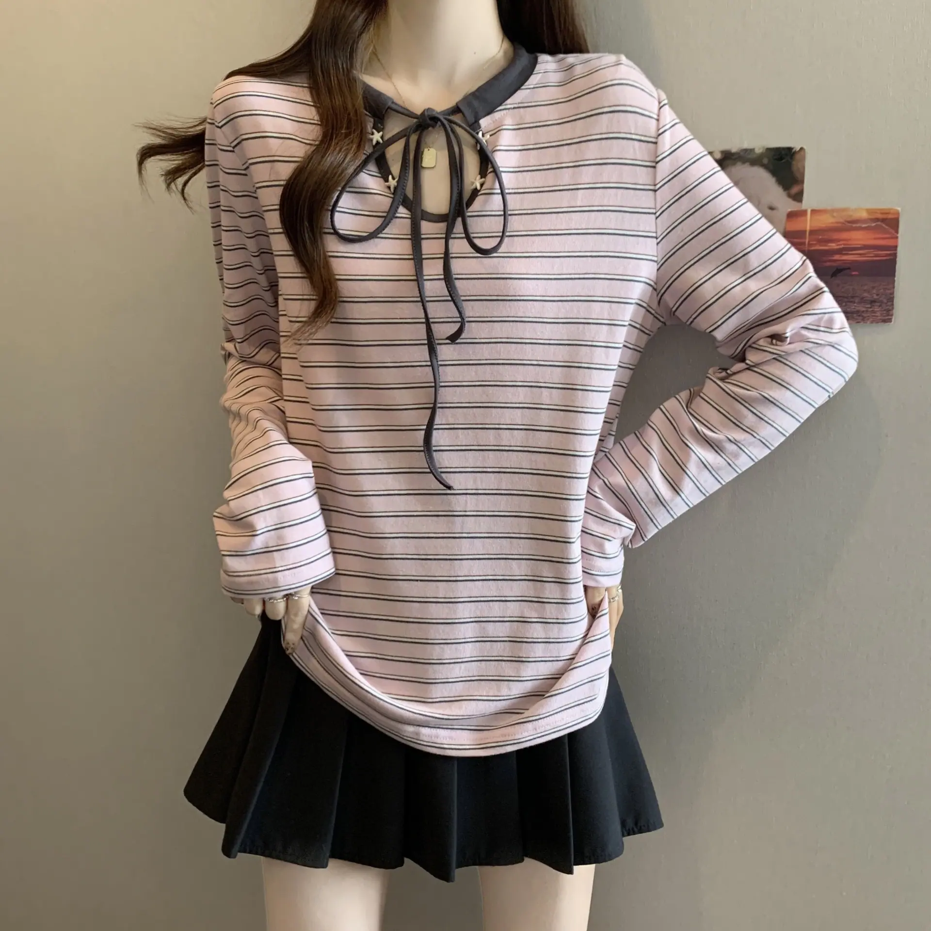Talla Grande Camiseta Rosa Rayada Cuello Redondo Anudar Mujer Otoño Temperamento Suelta Casual Adelgazante Manga Larga Capa Interior Top