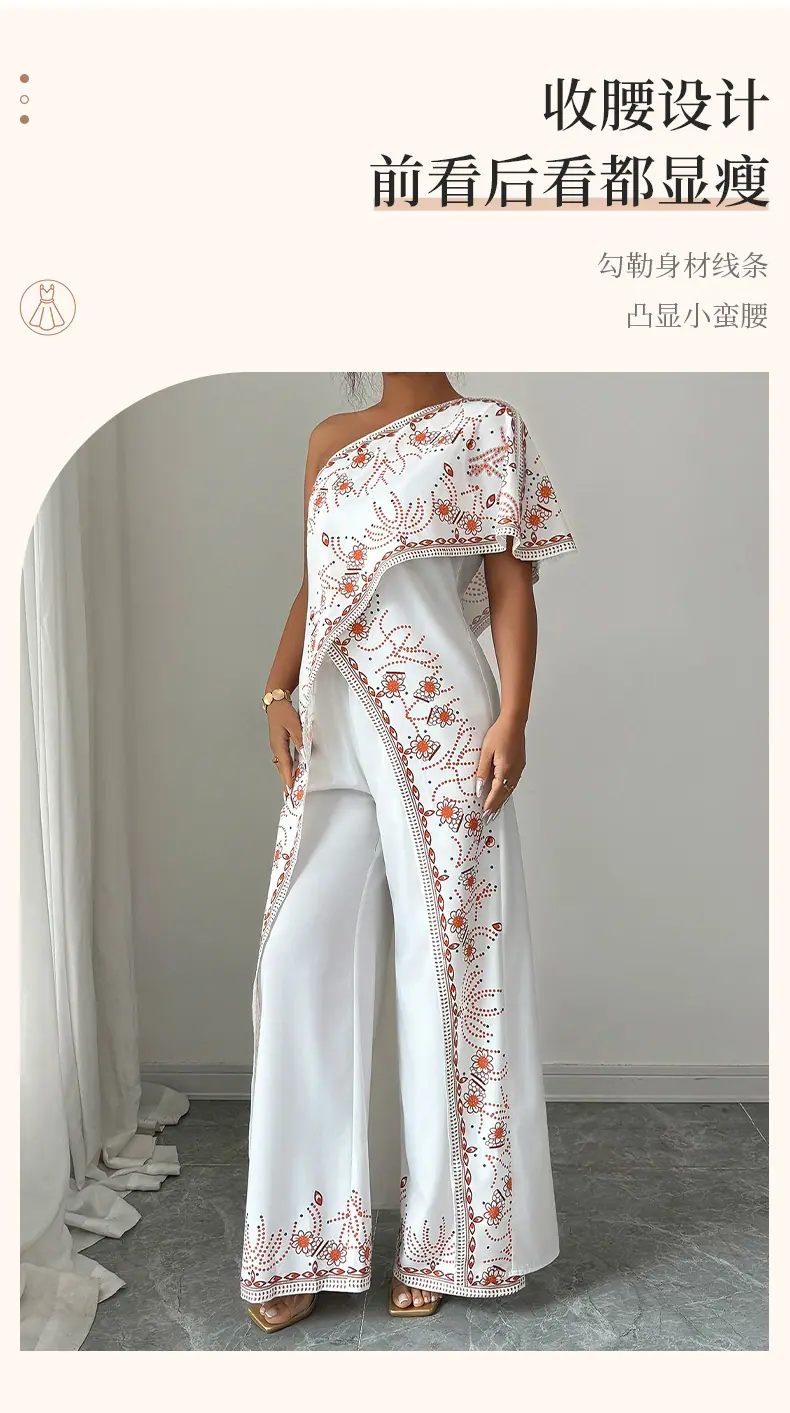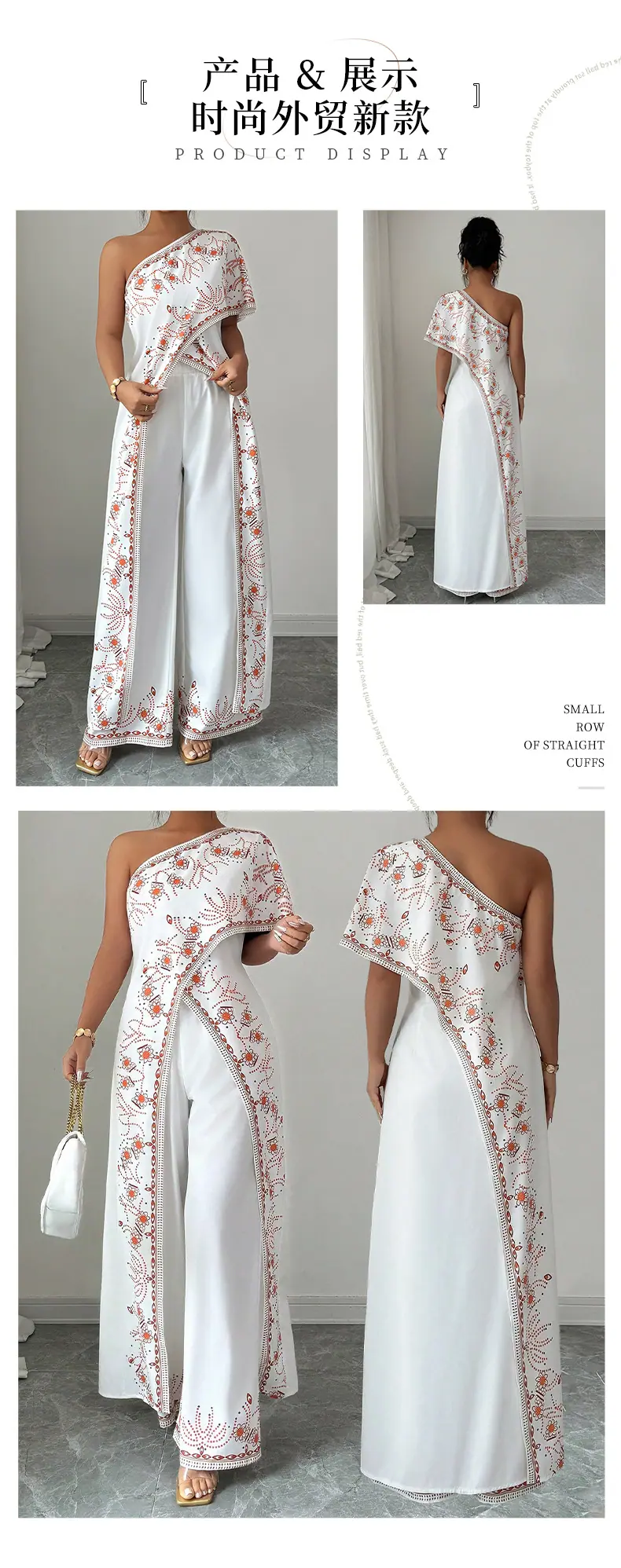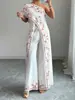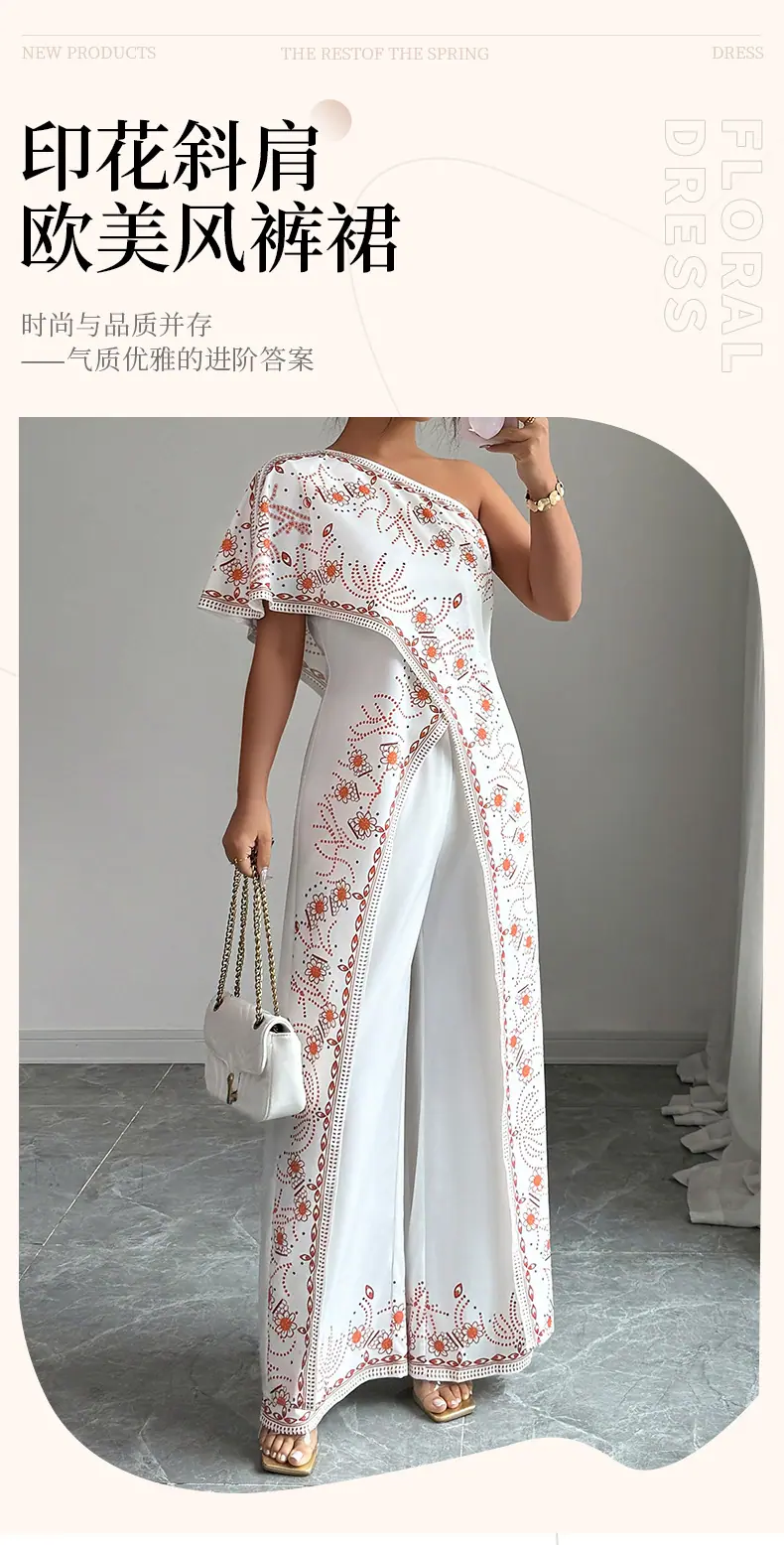 Moda Europea y Americana 2025 Verano Nuevo Estampado Hombro Descubierto Pierna Ancha Mono Falda Temperamento Elegante Body de Cintura Alta