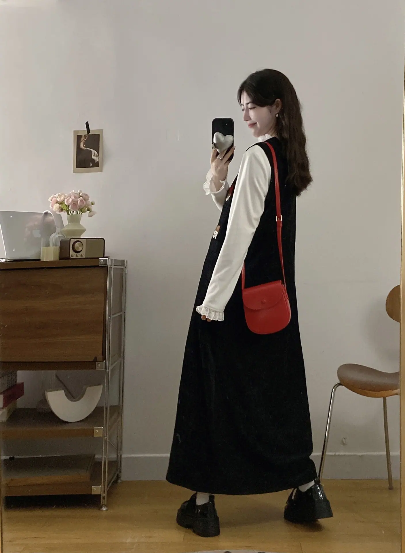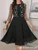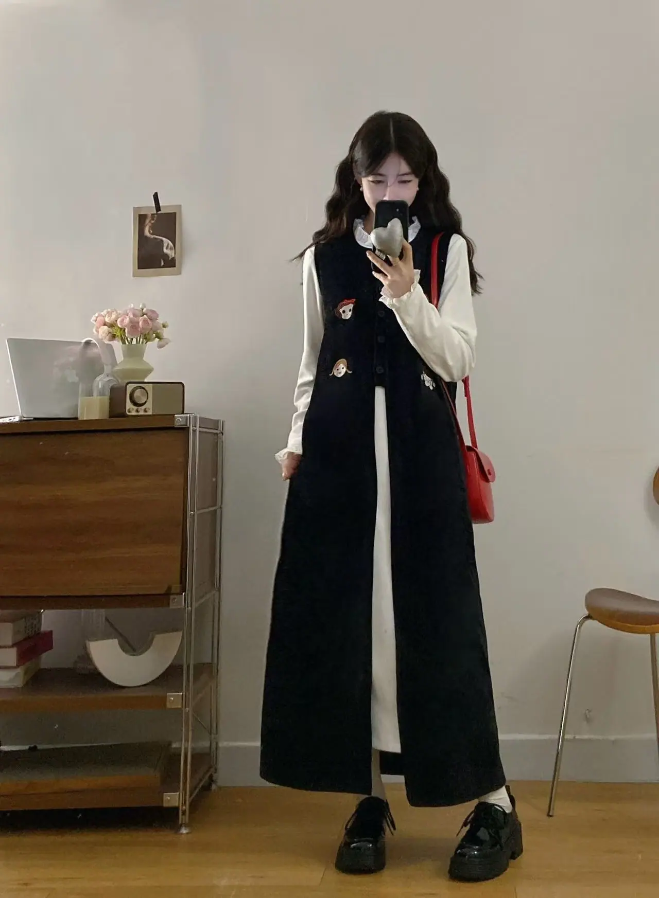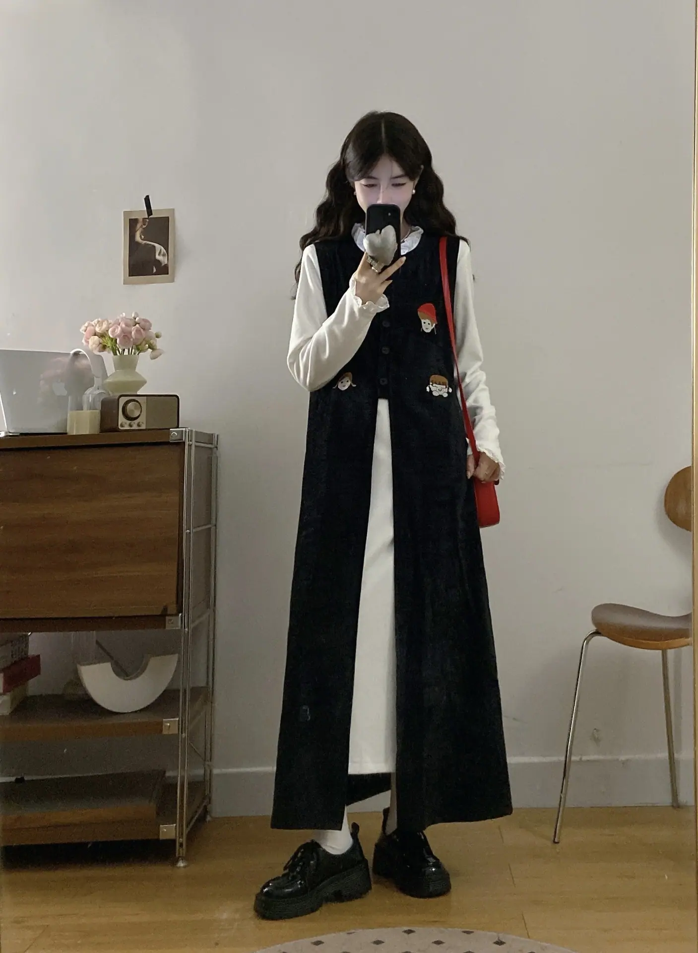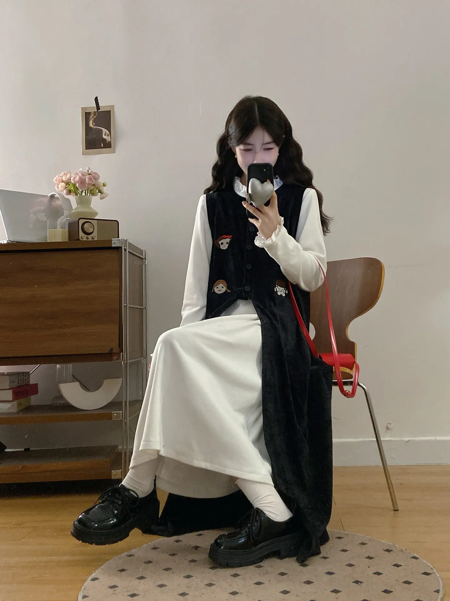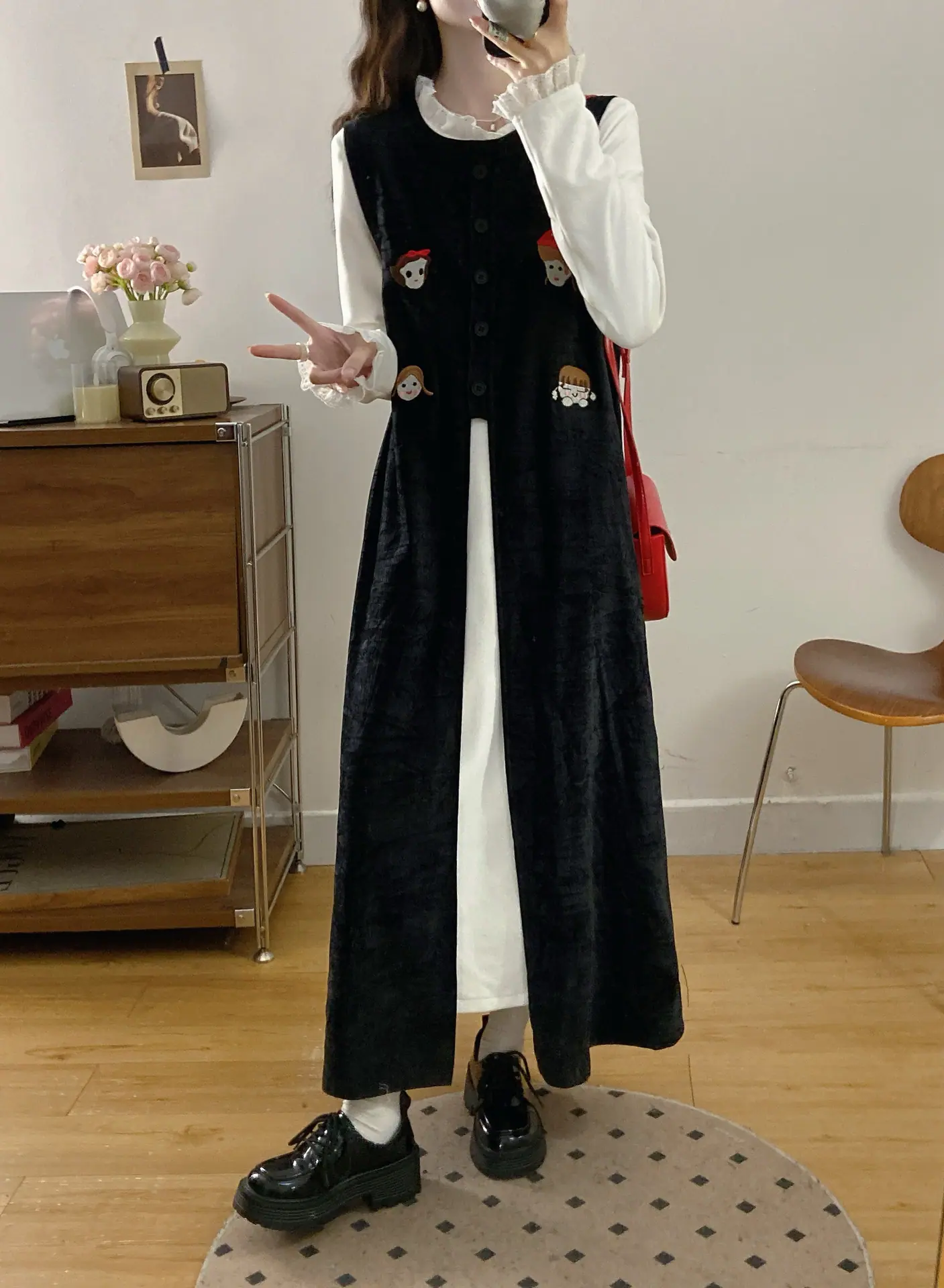 Conjunto Adelgazante de Talla Grande Vestido de Manga Larga en Capas con Chaleco Bordado Conjunto de Dos Piezas Atuendo Completo para Mujer Otoño/Invierno que Reduce la Edad