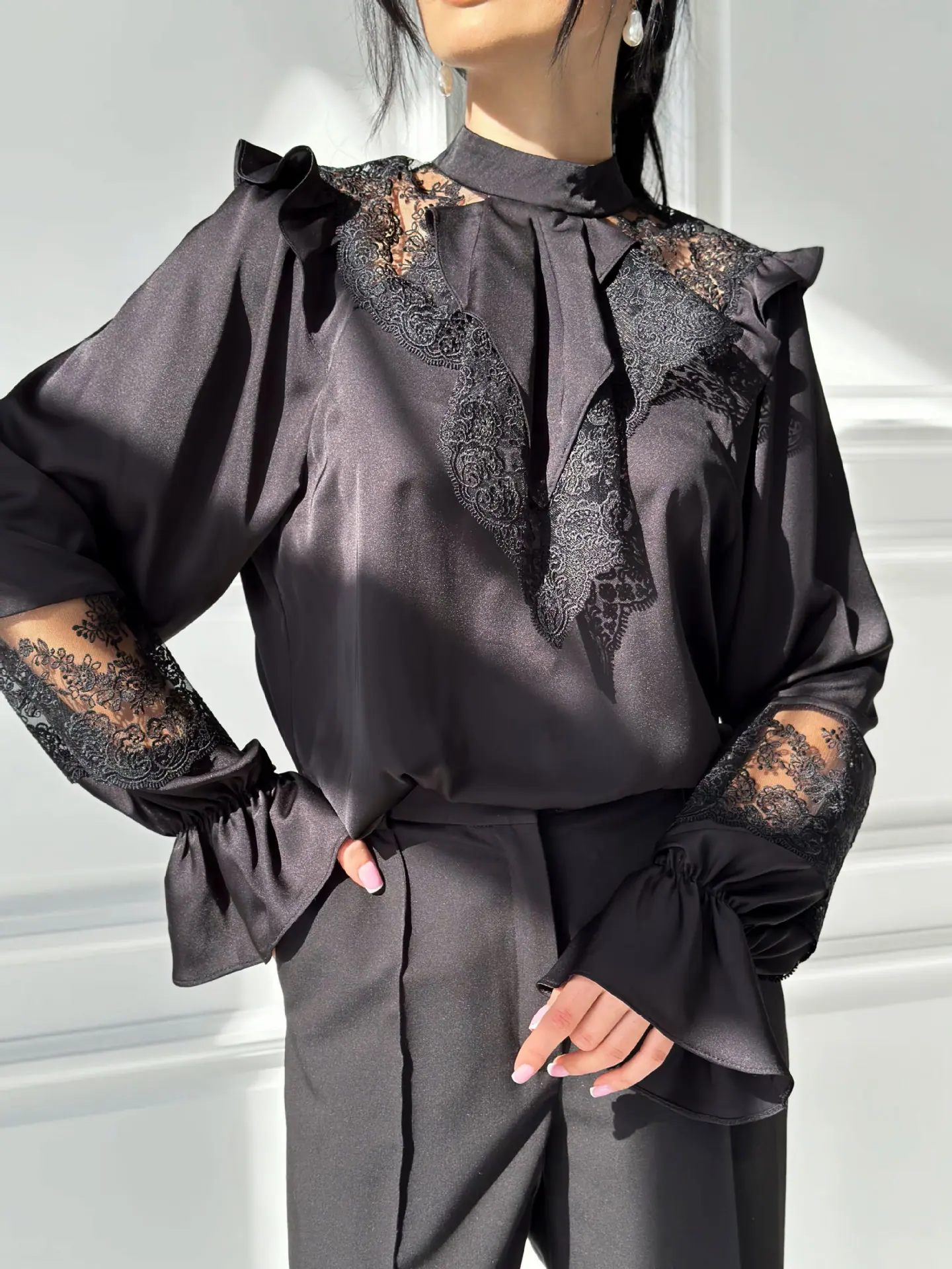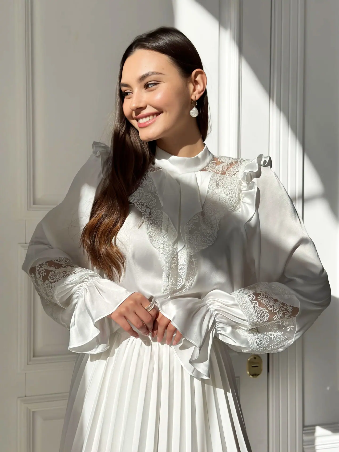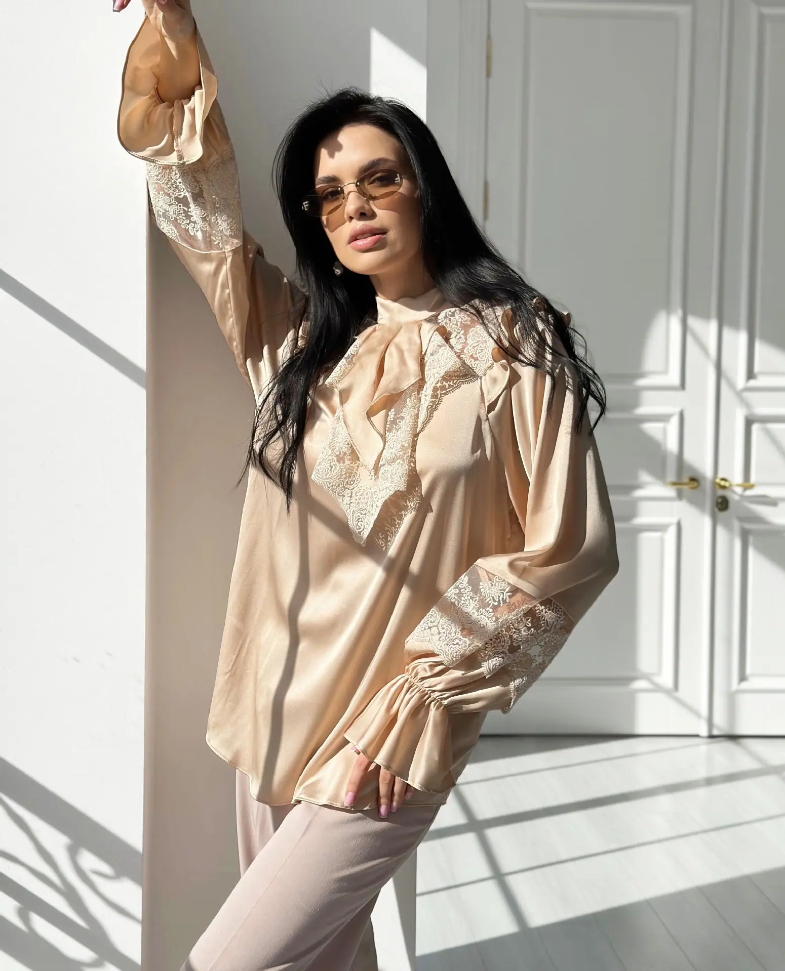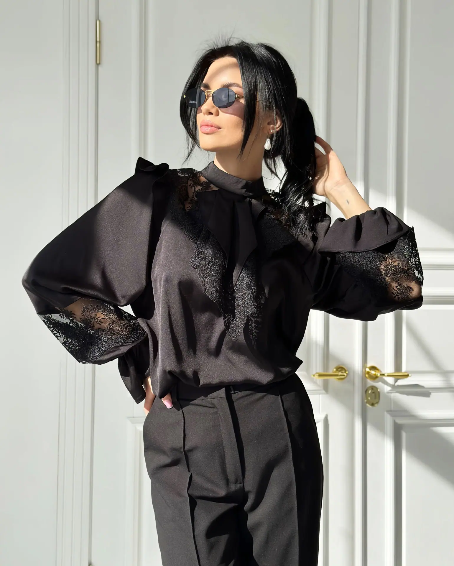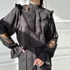 Nueva Blusa de Satén Francés con Volantes Otoño/Invierno Camisa de Encaje Patchwork Sentido del Diseño Temperamento Moda 2025 Transfronteriza