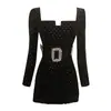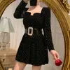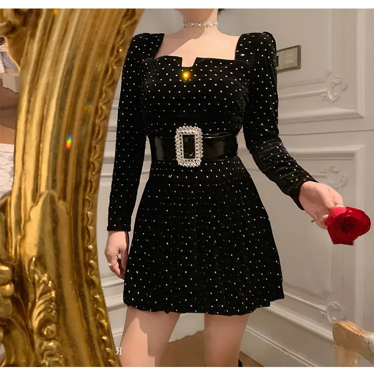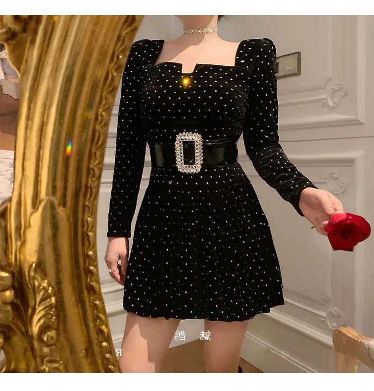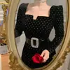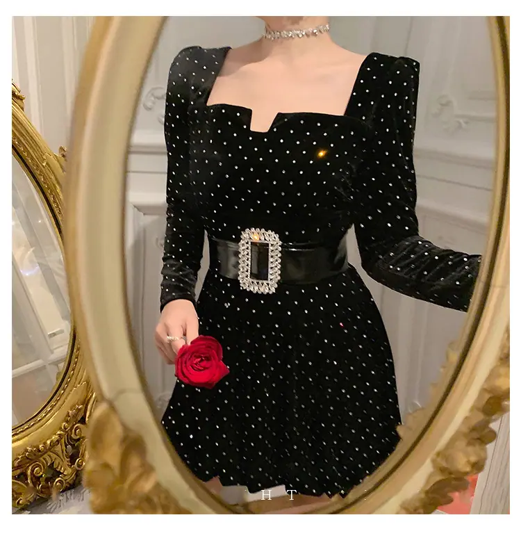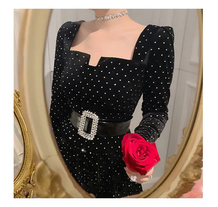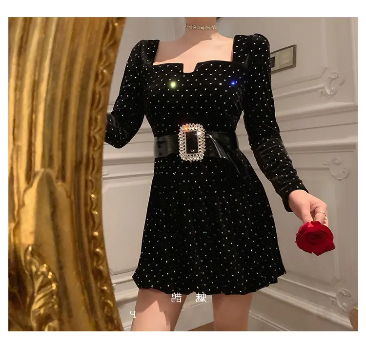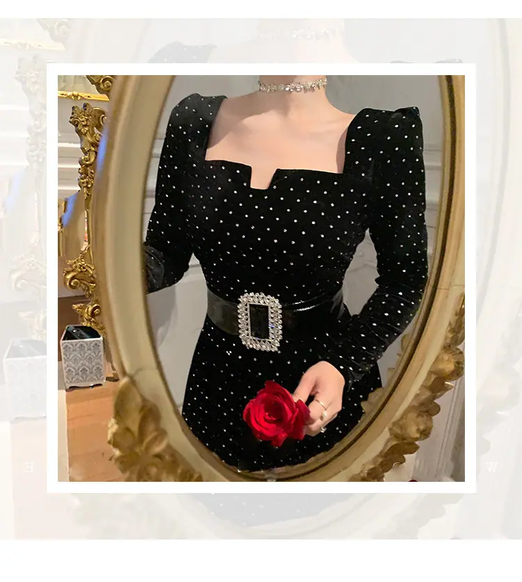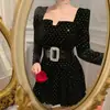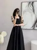 Nuevo Vestido Negro Corto Retro Francés Estilo Estrella Cuello Cuadrado Cintura Ajustada Adelgazante Elegante Vestido de Fiesta Reunión Anual