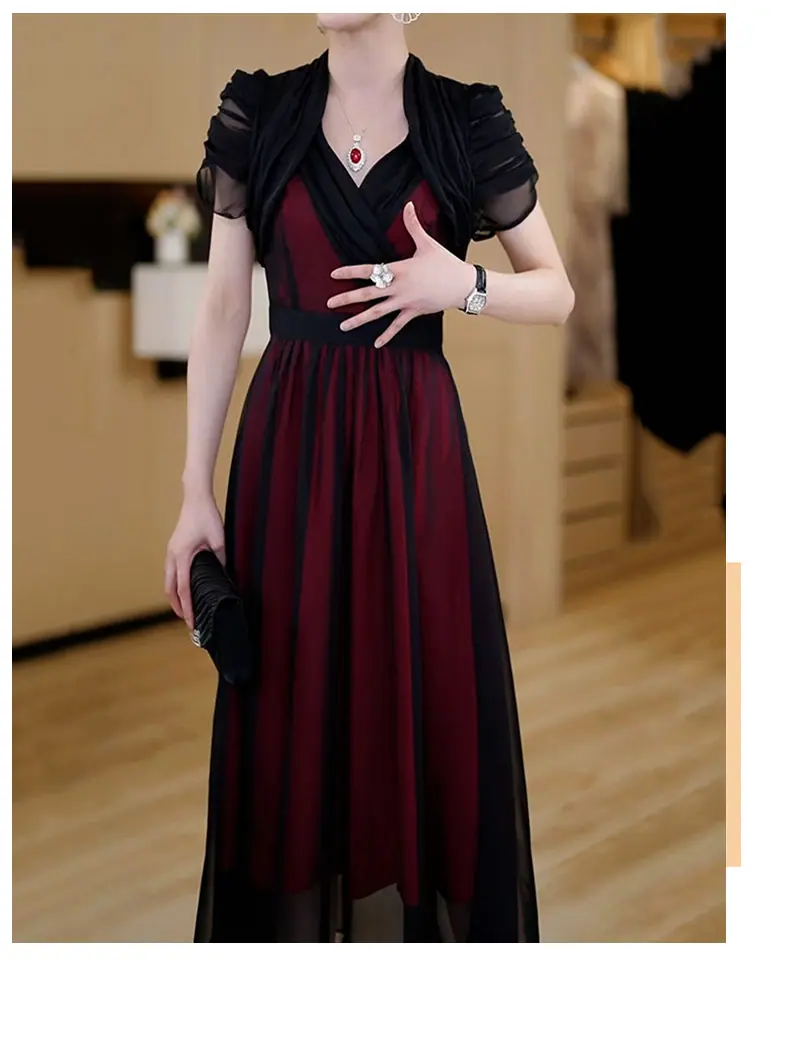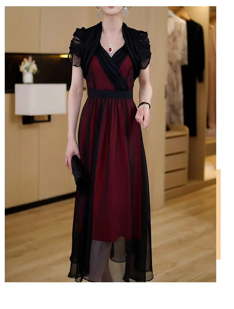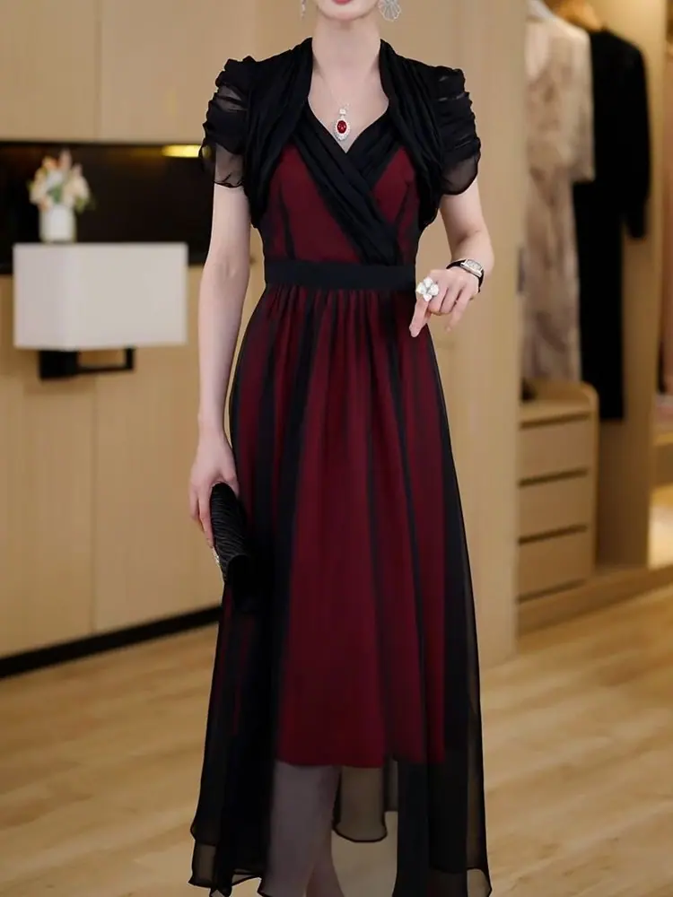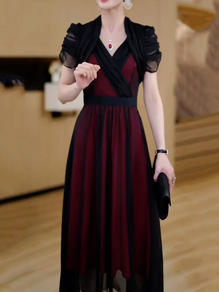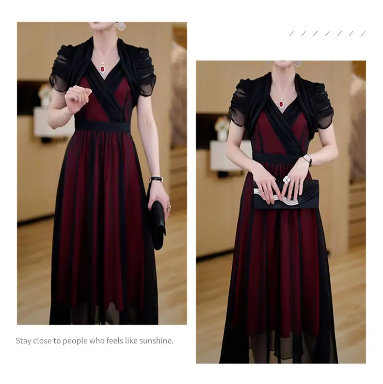 Falda para Mujer Vestido de Lujo Ligero Empalmado con Cuello en V Vestido Largo de Verano para Mujer Nuevo Temperamento Falda Línea A de Moda Delgada de Manga Corta 7503