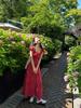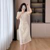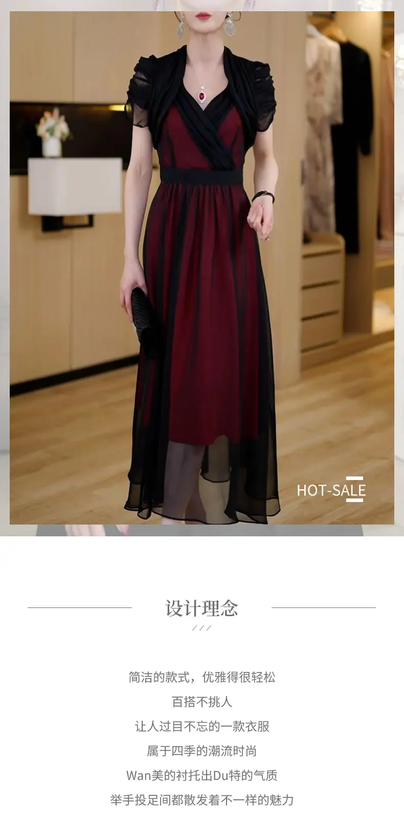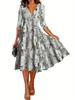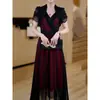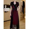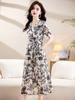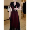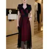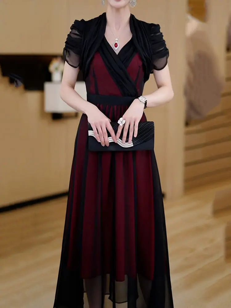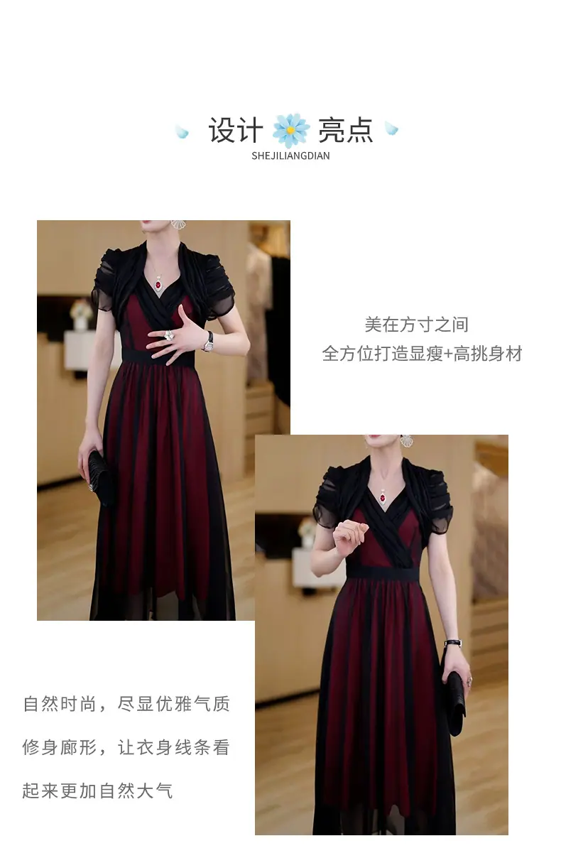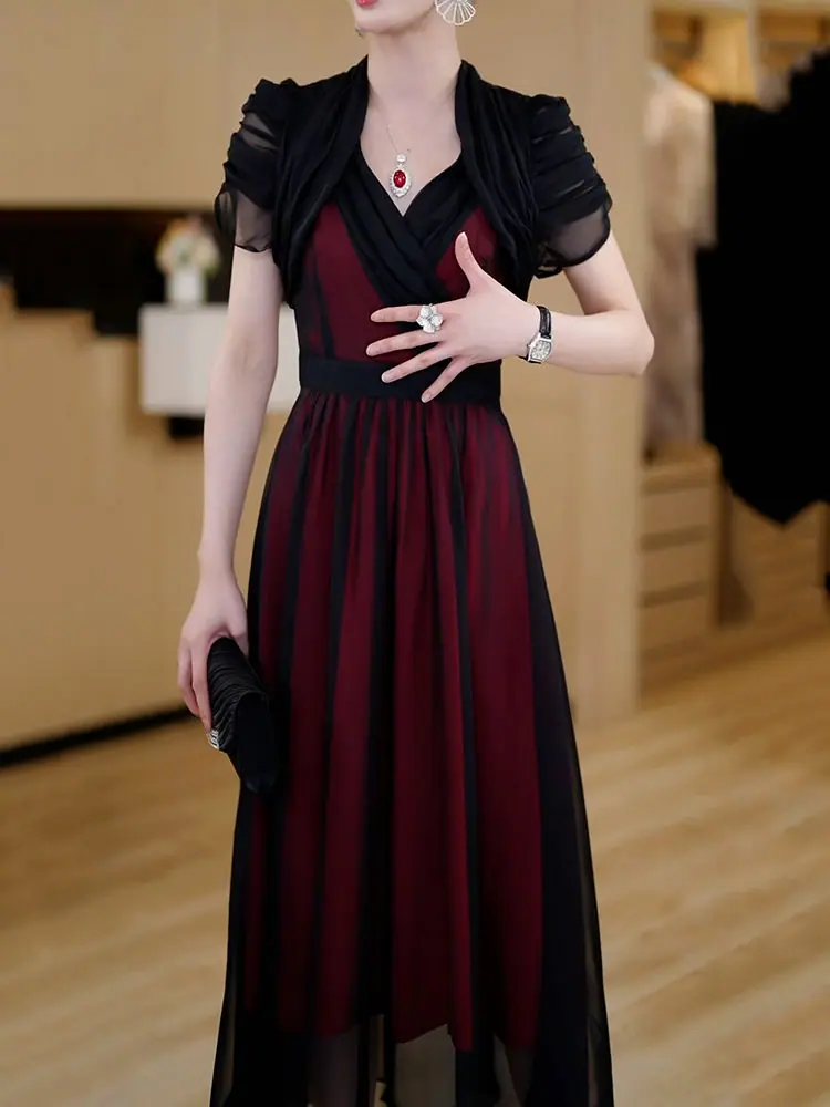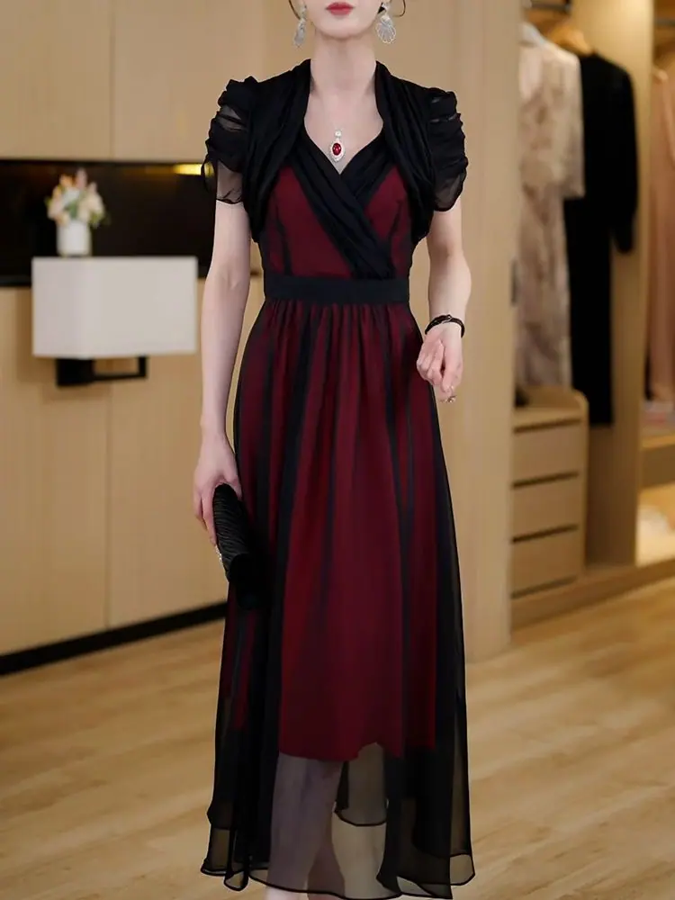 Falda para Mujer Vestido de Lujo Ligero Empalmado con Cuello en V Vestido Largo de Verano para Mujer Nuevo Temperamento Falda Línea A de Moda Delgada de Manga Corta 7503