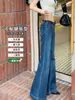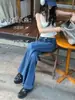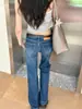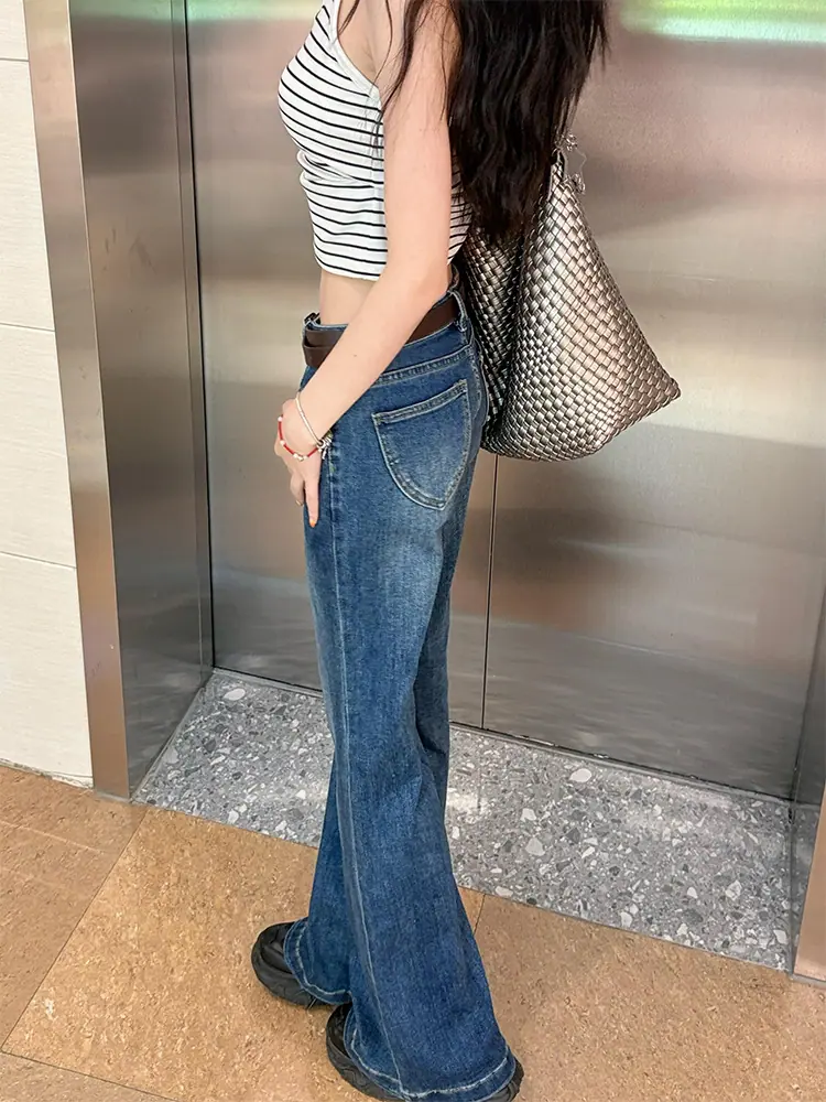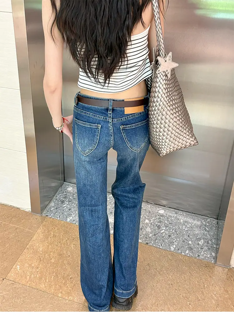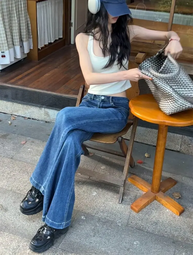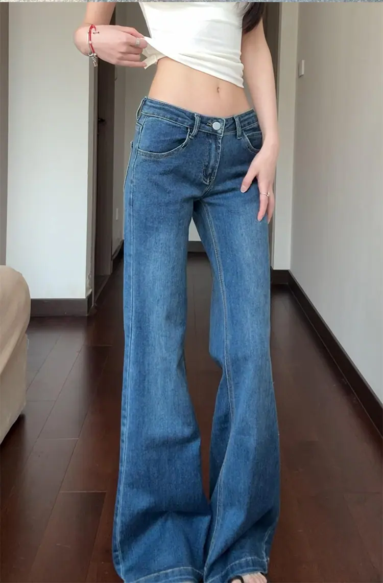 Compra Jeans microacampanados de tiro bajo azul oscuro para mujer otoño 2025 estilo americano elásticos no ajustados chica hot pierna recta acampanados al por mayor en Joom.pro