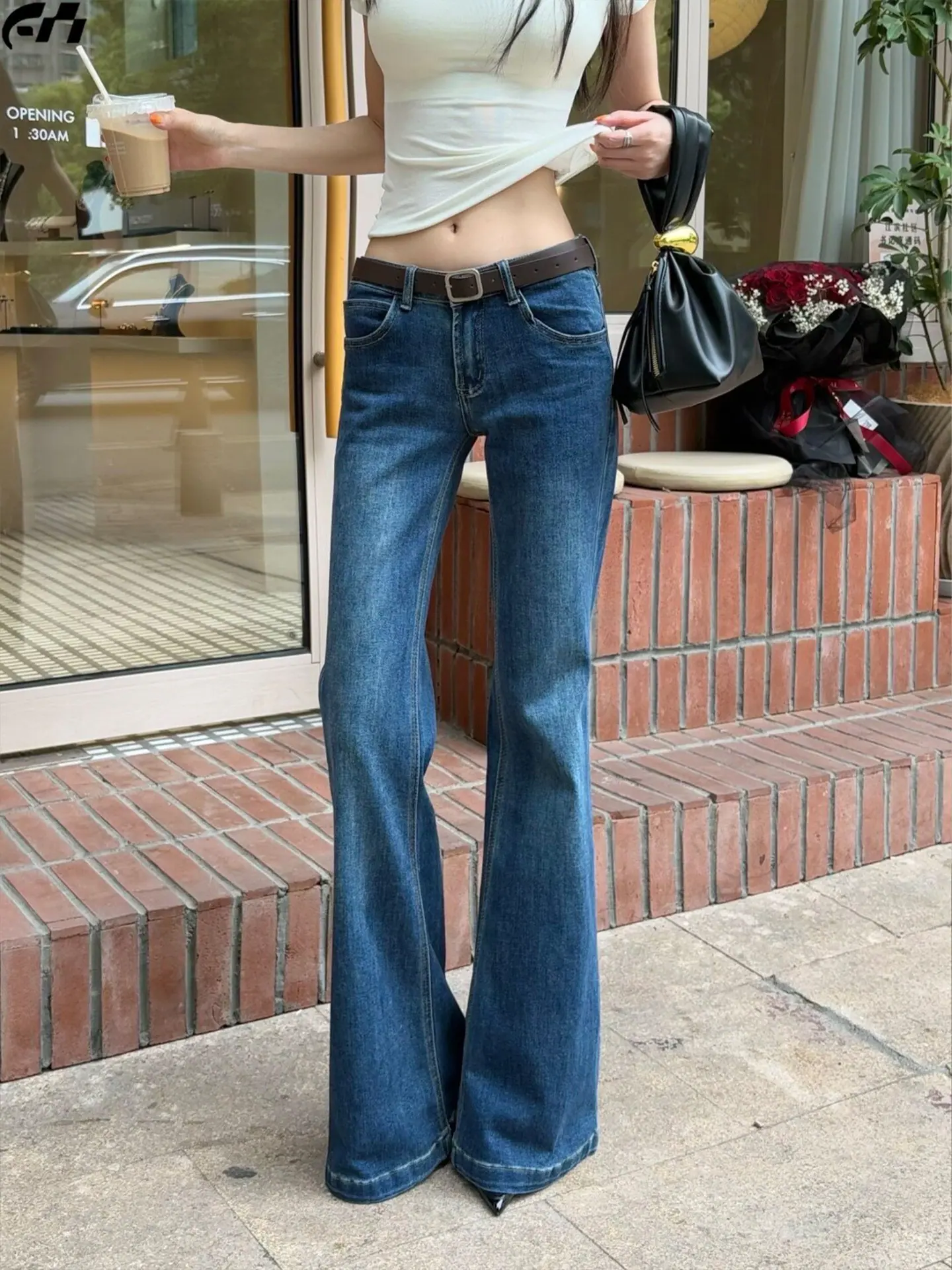 Jeans microacampanados de tiro bajo azul oscuro para mujer otoño 2025 estilo americano elásticos no ajustados chica hot pierna recta acampanados