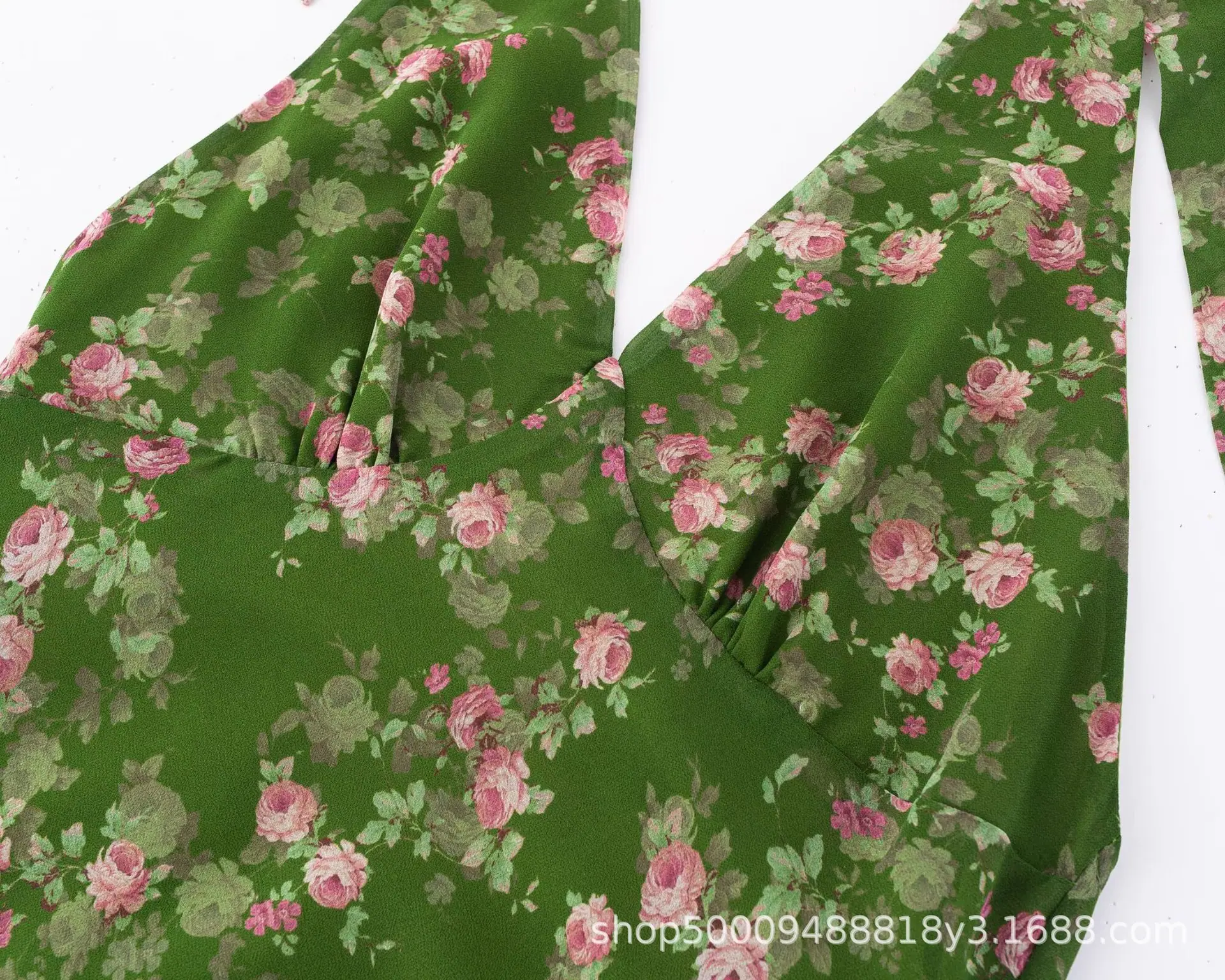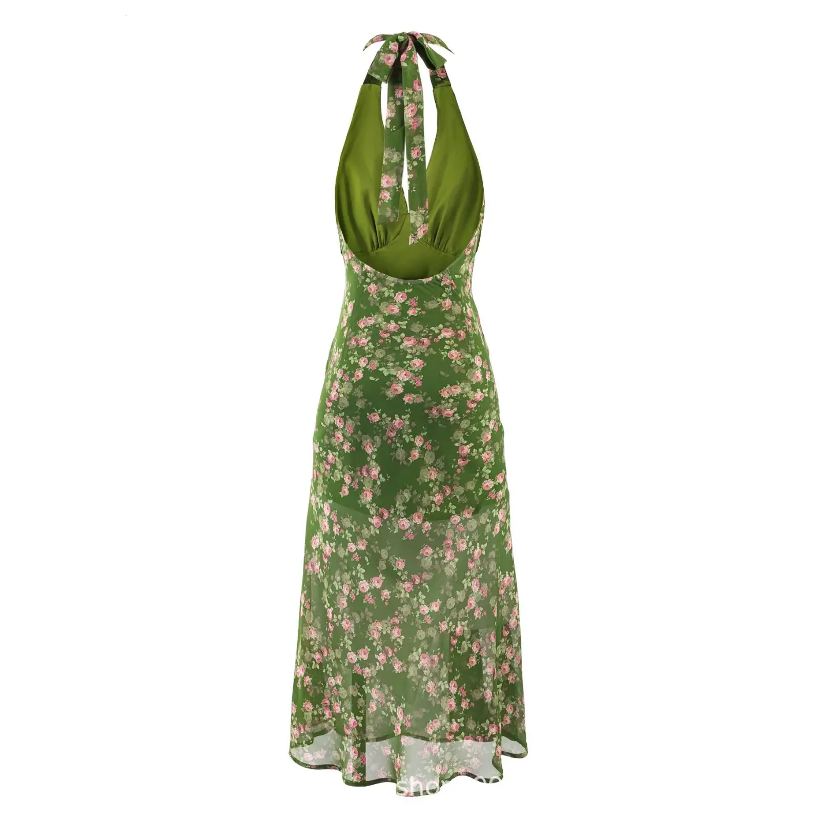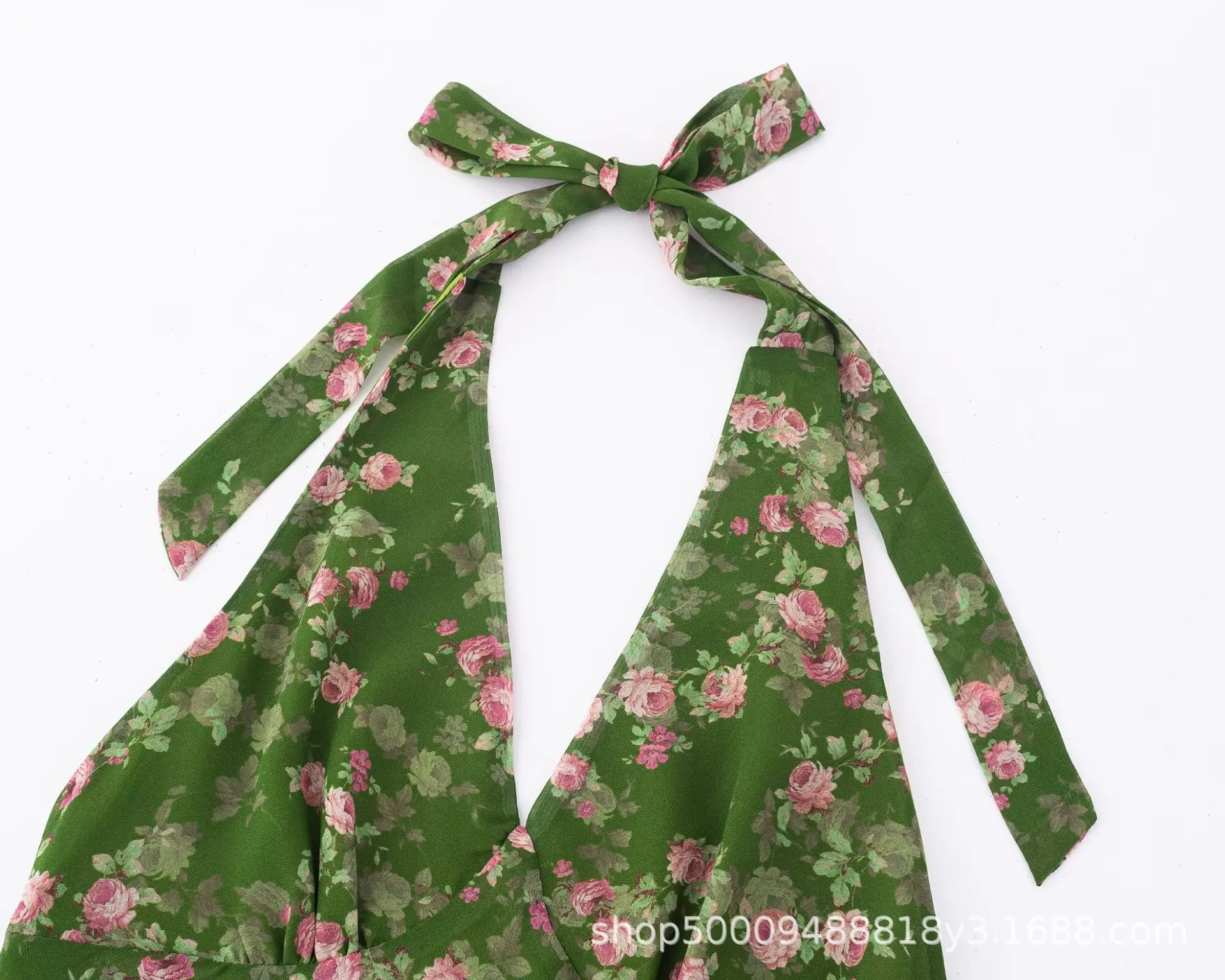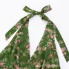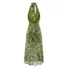 Vacaciones de Verano en la Playa Falda de Tirantes Floral Verde Verano para Mujer Francés Halter Cuello en V Sin Mangas con Tirantes Vestido Ajustado