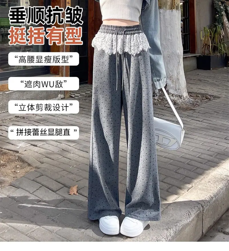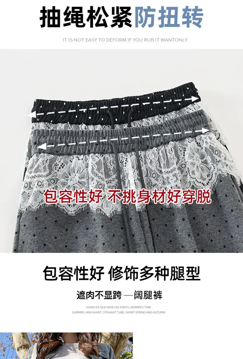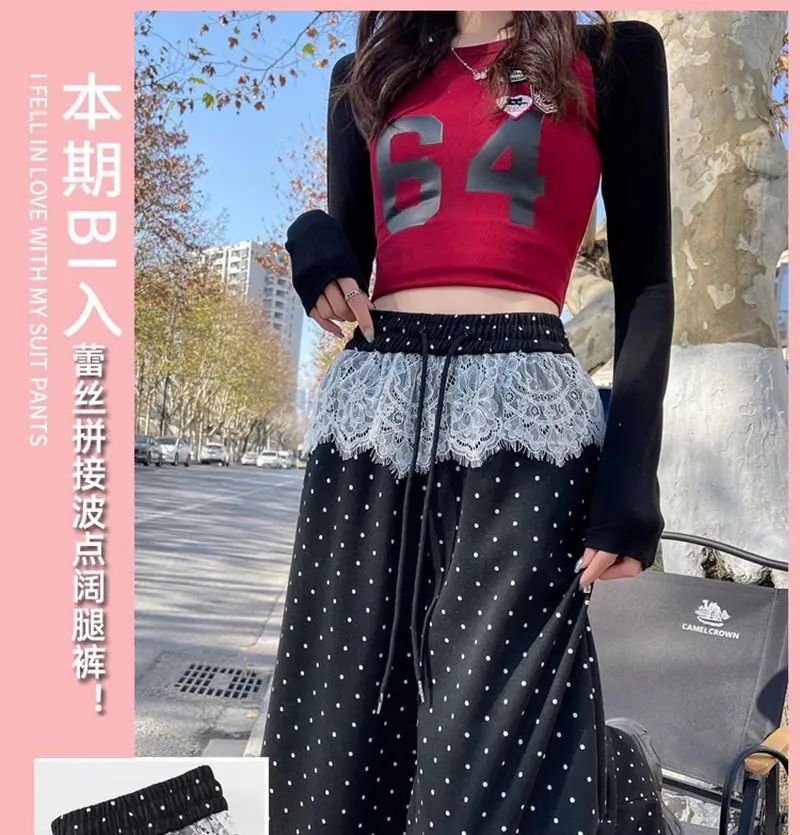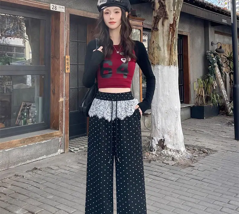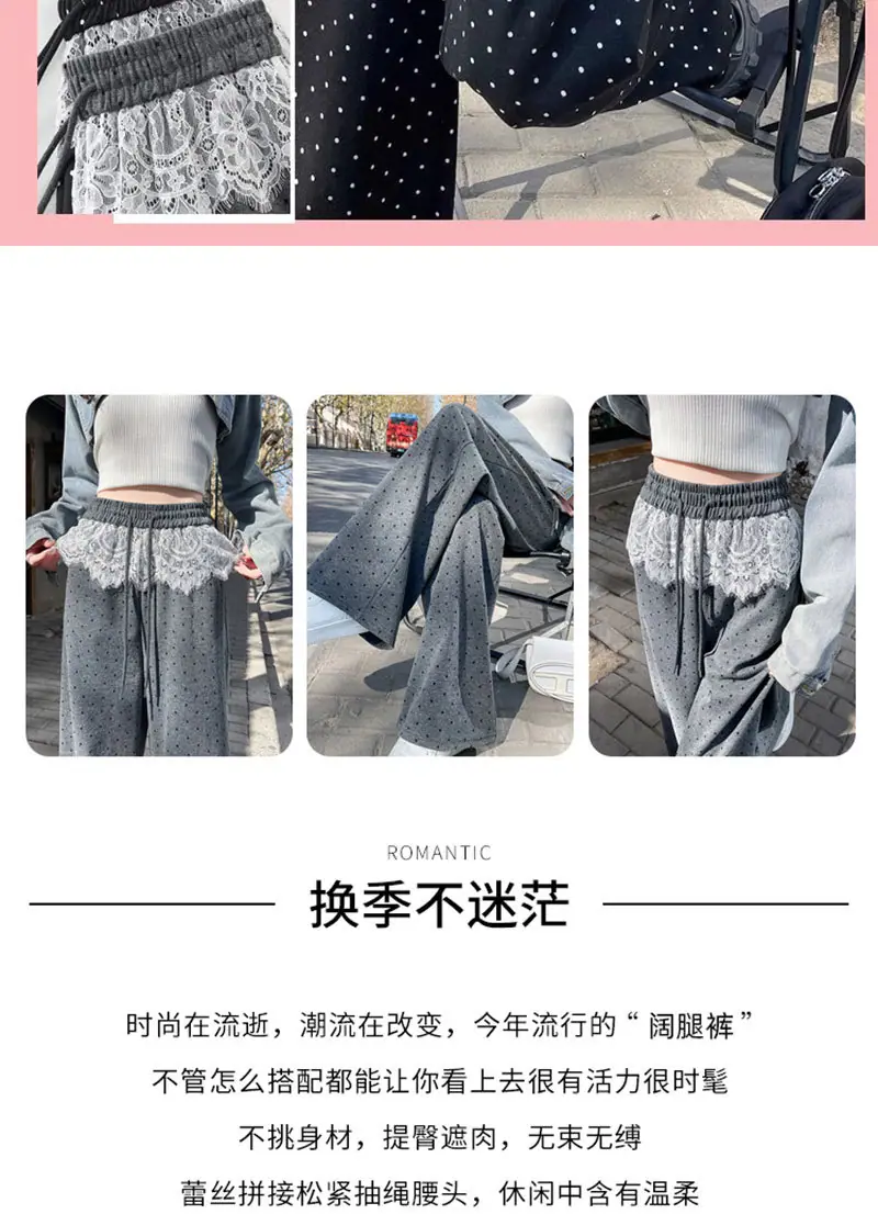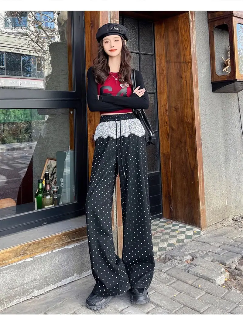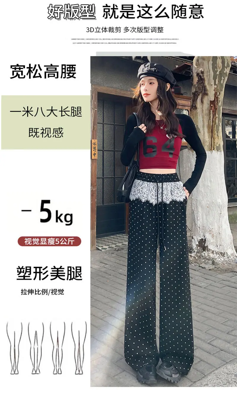 Compra Pantalones de Pierna Ancha con Costuras de Encaje Negro para Mujer Primavera Cintura Alta Adelgazantes Pierna Recta Combinan con Todo Holgados Lunares Ondulados Leggings con Cordón al por mayor en Joom.pro