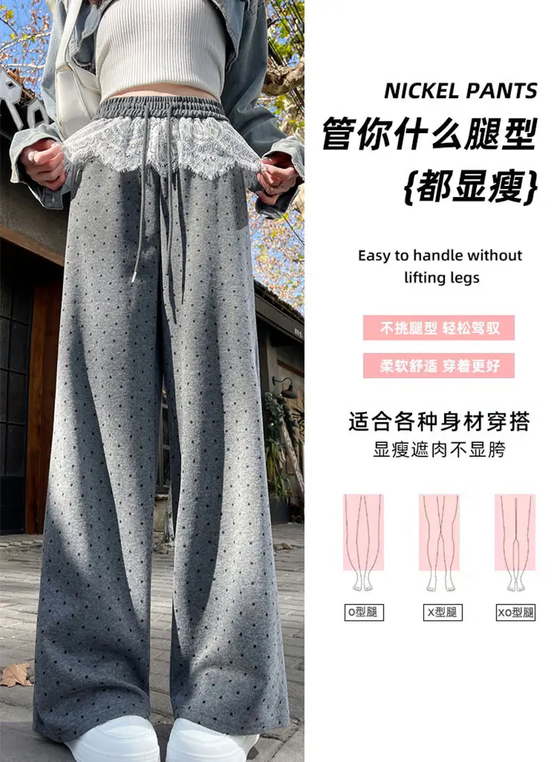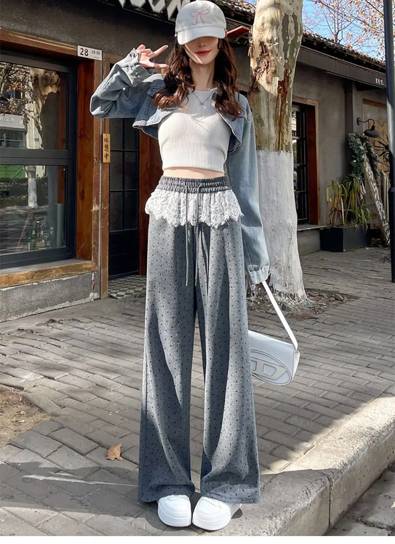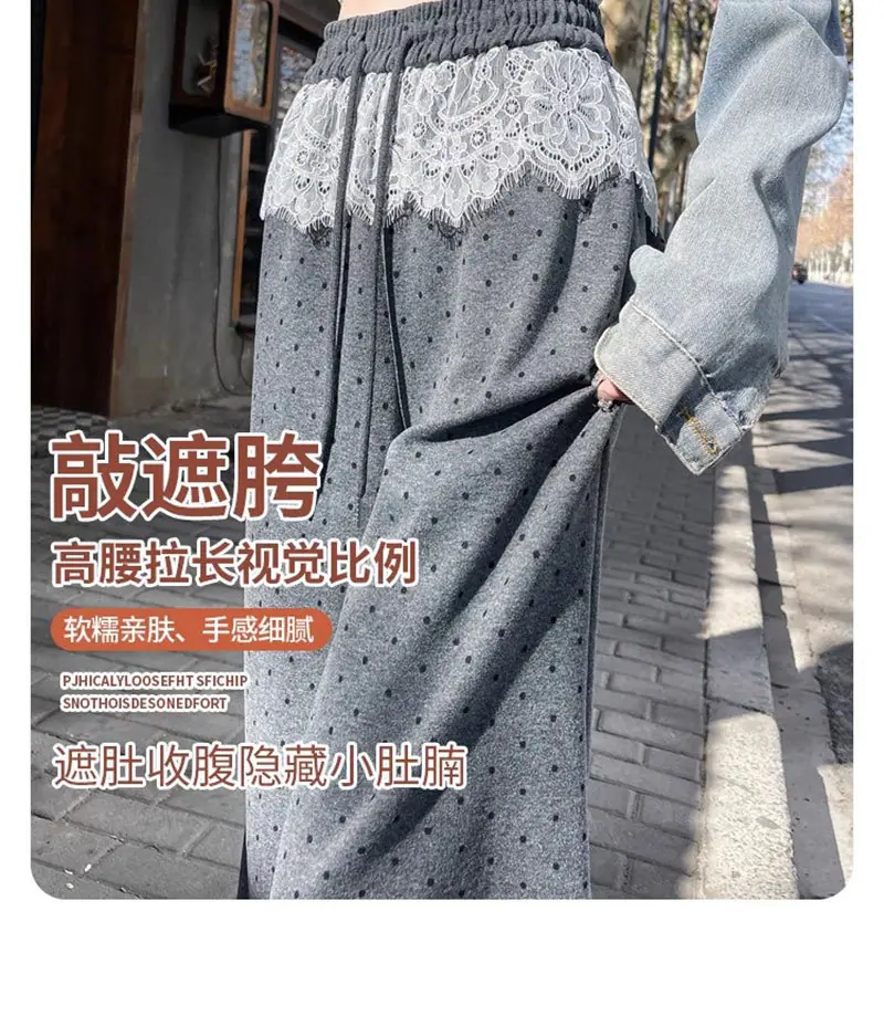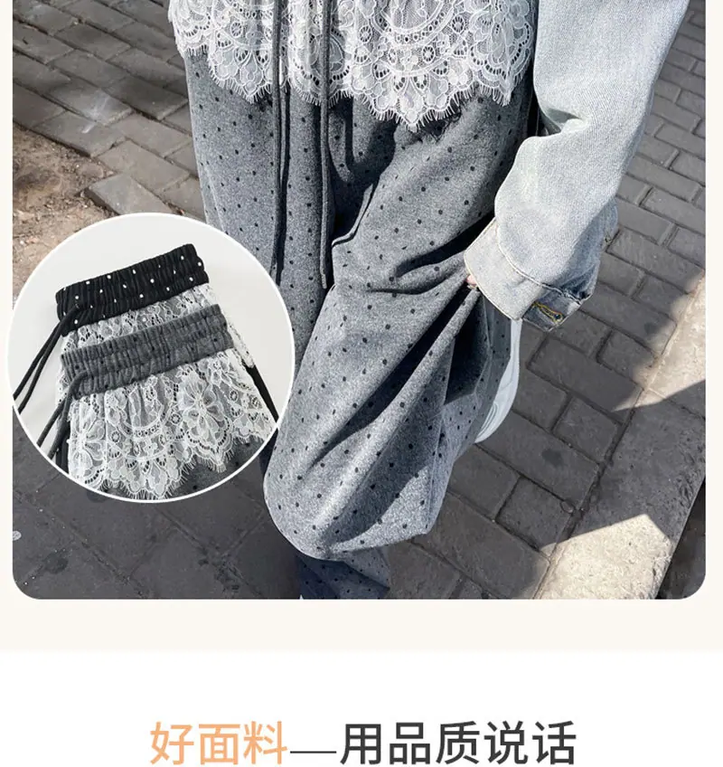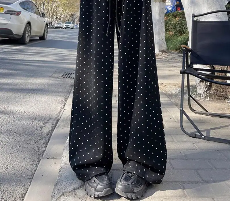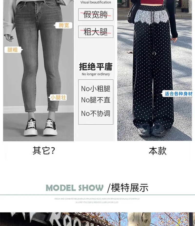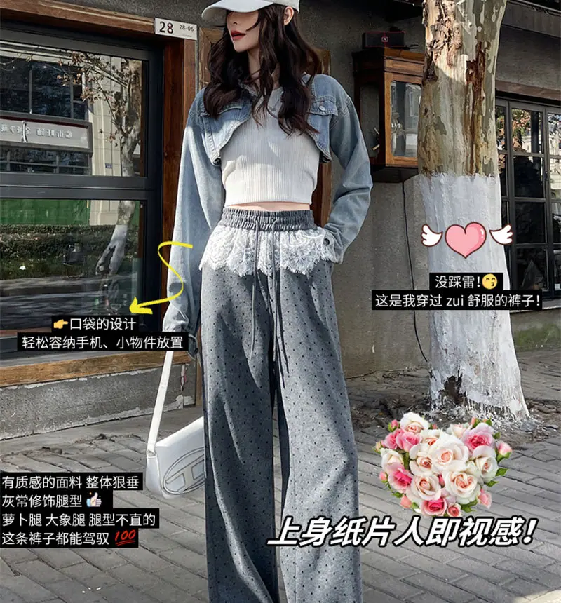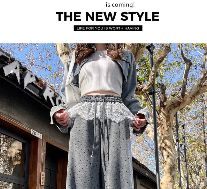 Compra Pantalones de Pierna Ancha con Costuras de Encaje Negro para Mujer Primavera Cintura Alta Adelgazantes Pierna Recta Combinan con Todo Holgados Lunares Ondulados Leggings con Cordón al por mayor en Joom.pro