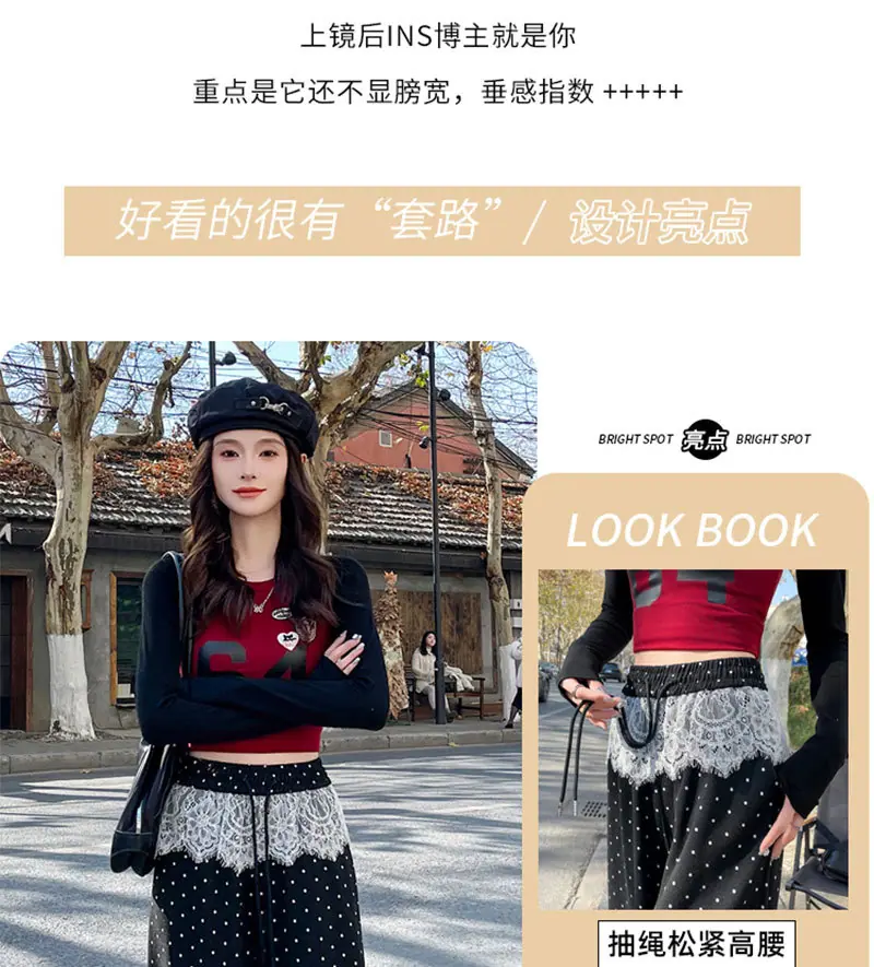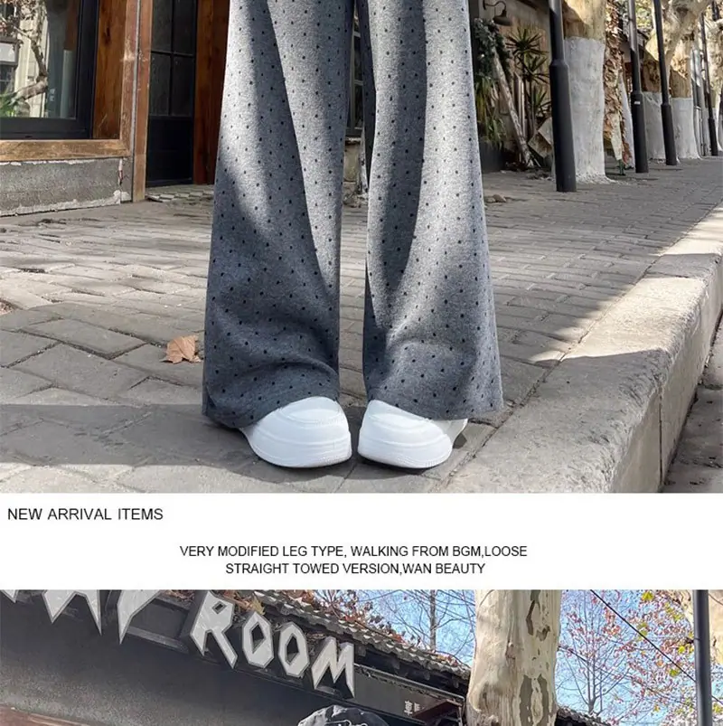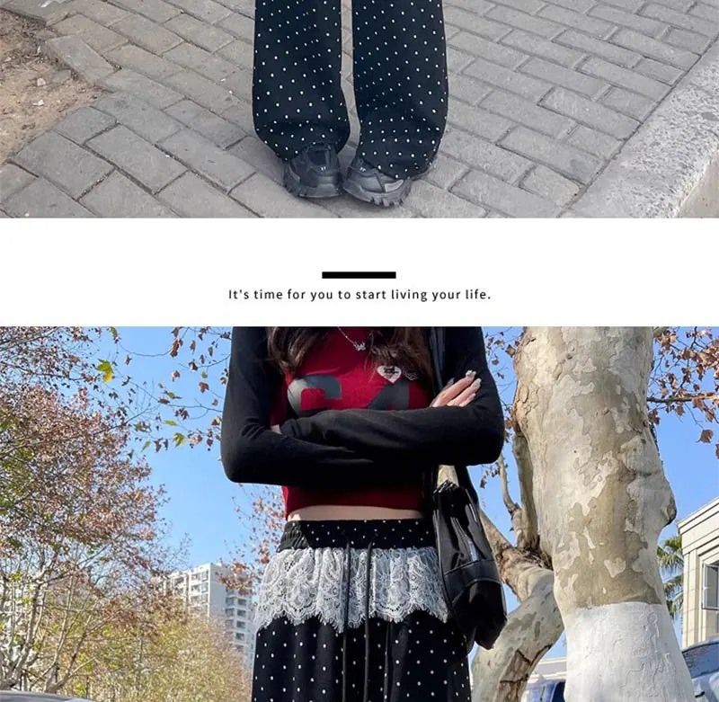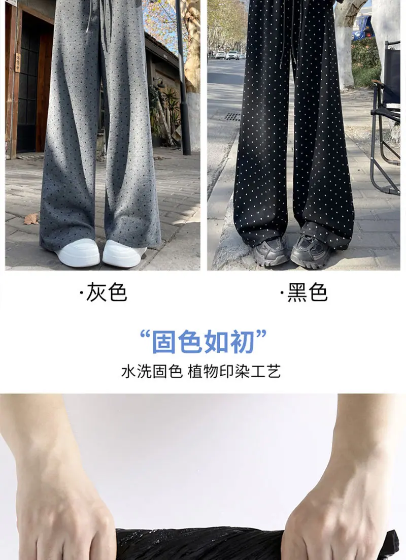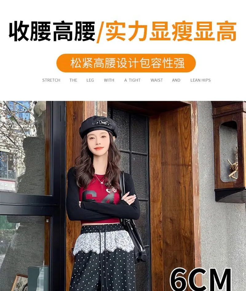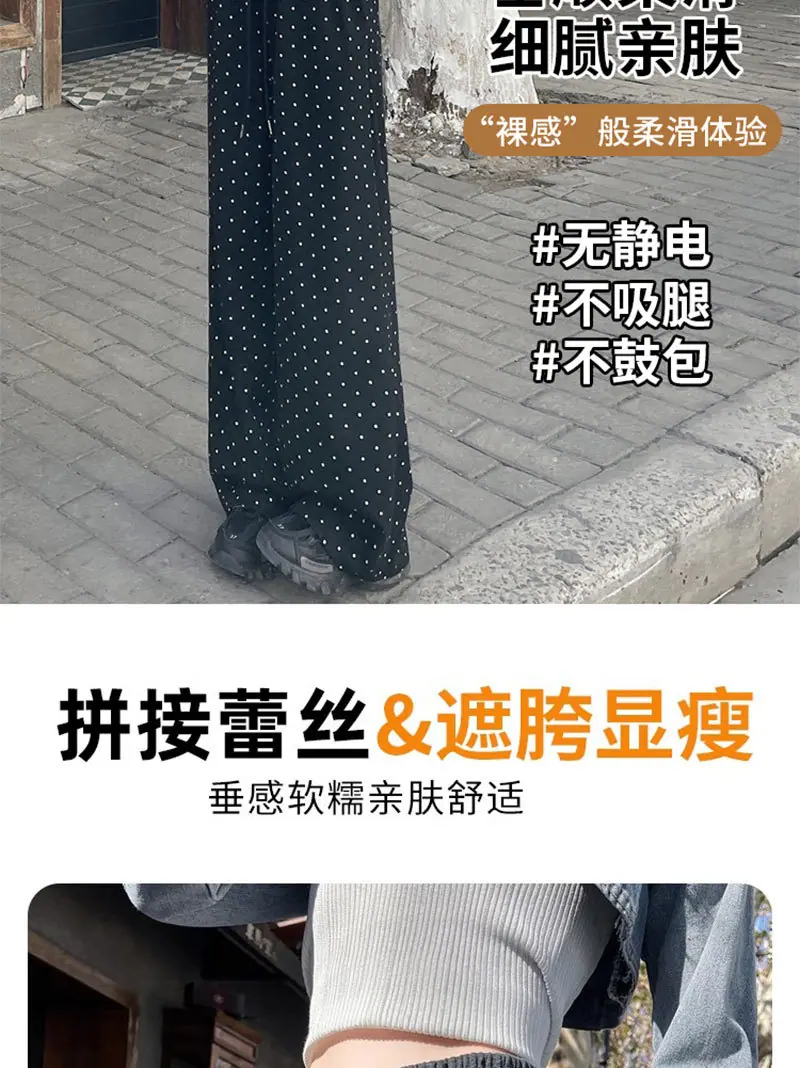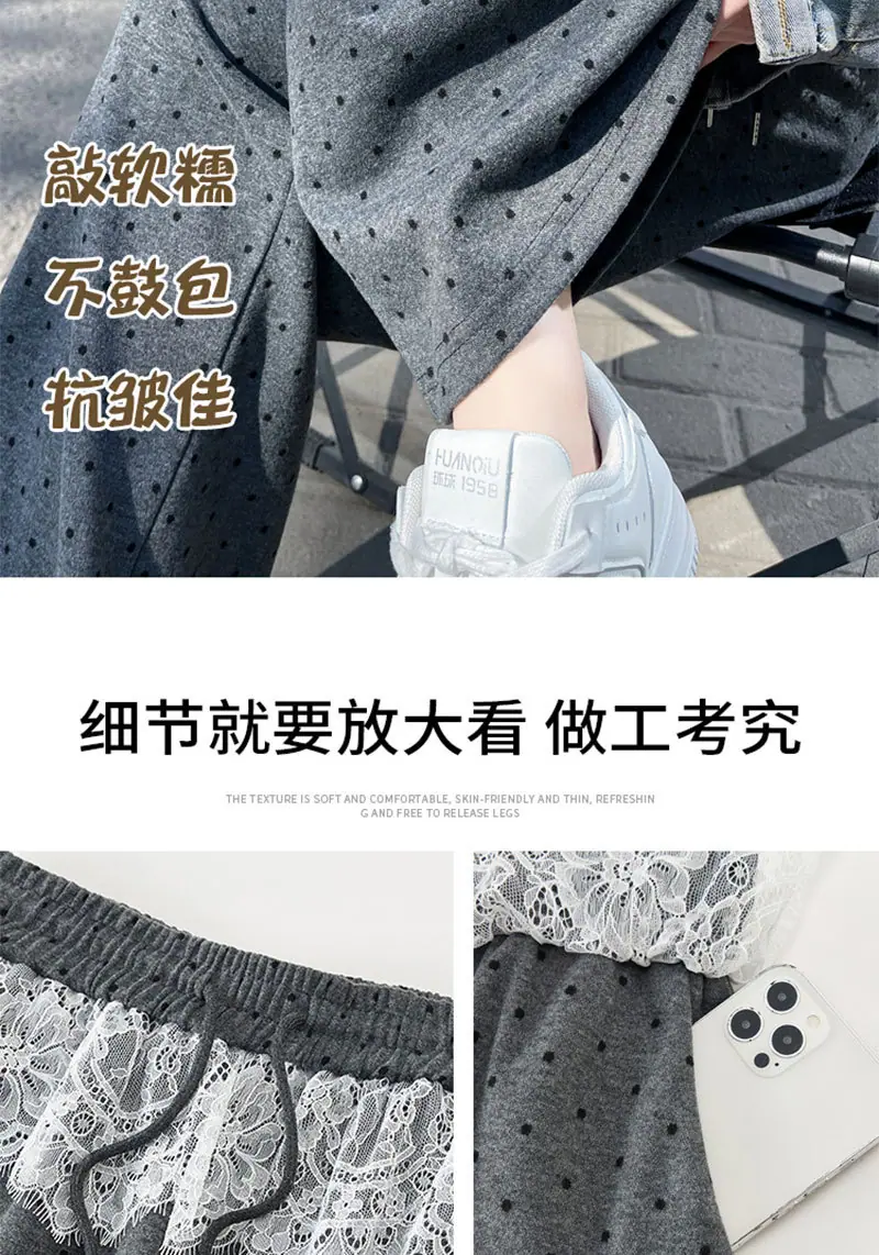 Compra Pantalones de Pierna Ancha con Costuras de Encaje Negro para Mujer Primavera Cintura Alta Adelgazantes Pierna Recta Combinan con Todo Holgados Lunares Ondulados Leggings con Cordón al por mayor en Joom.pro