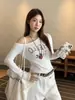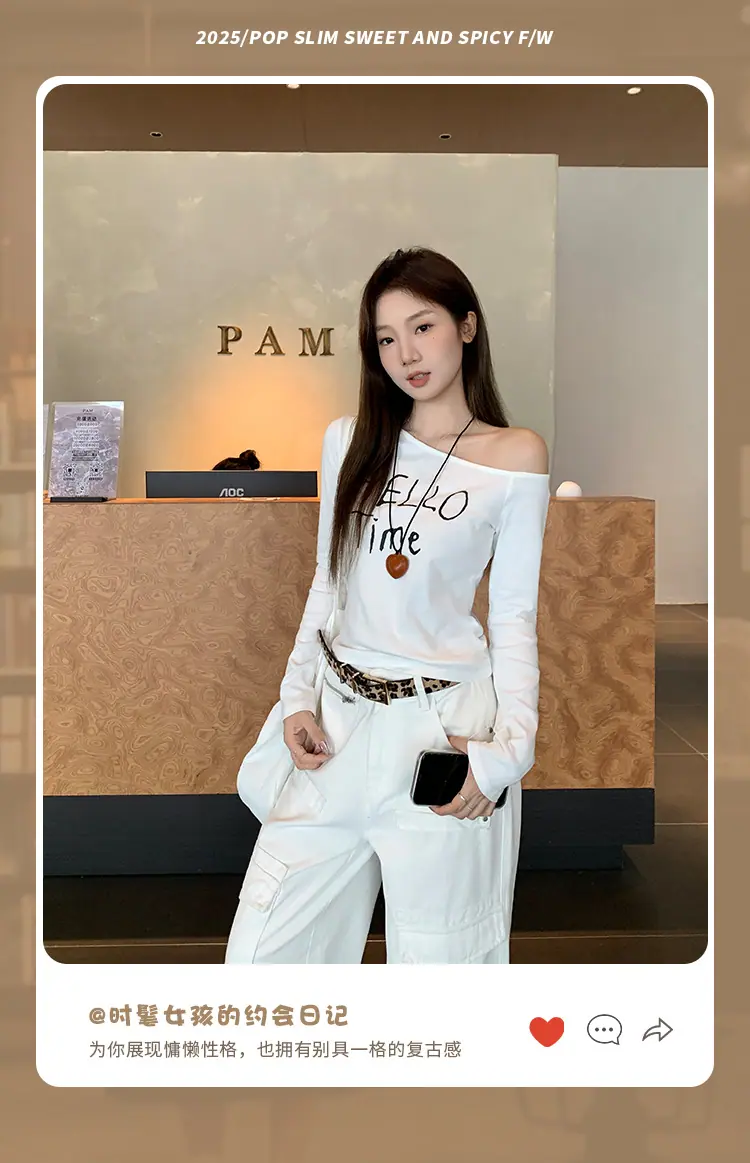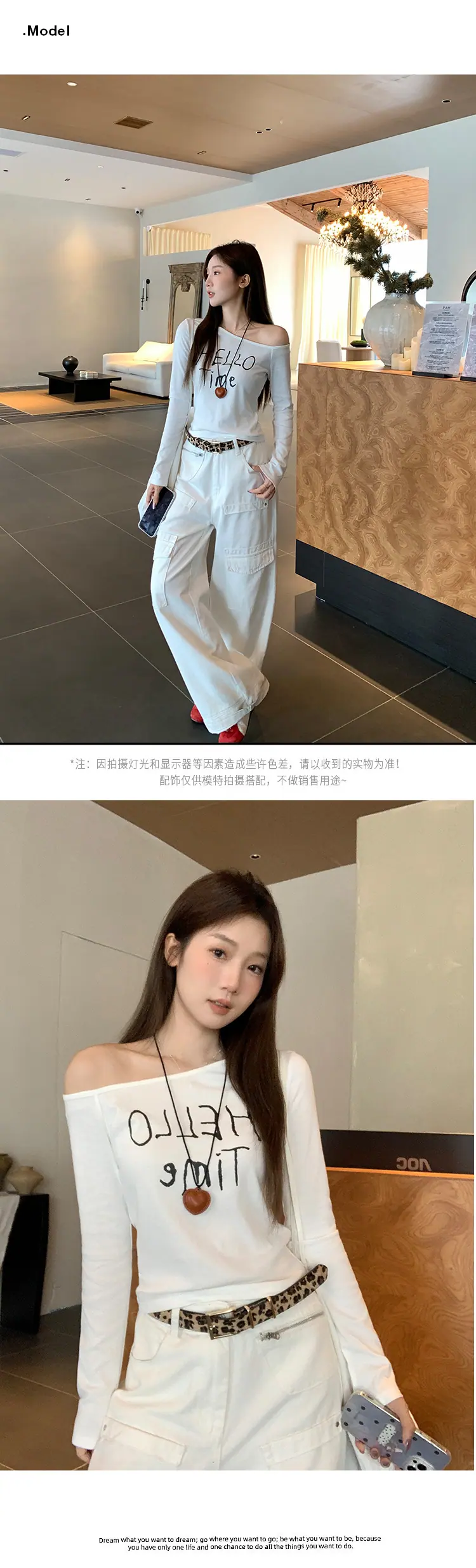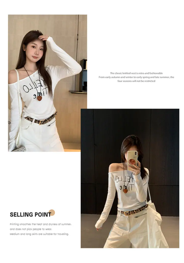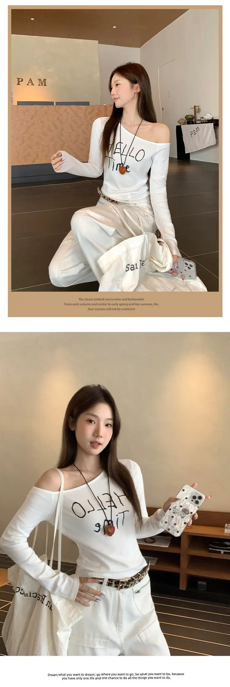 Compra Playera de Manga Larga para Mujer con Diseño de Letras en Hombro Inclinado Blanco, Sentido del Diseño, Nuevo Otoño Temprano 2025, Adelgazante y Favorecedor de la Figura, Top con Hombros Descubiertos al por mayor en Joom.pro