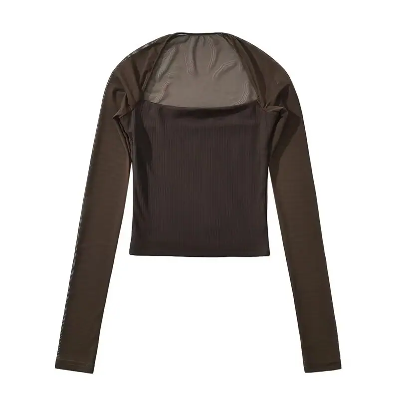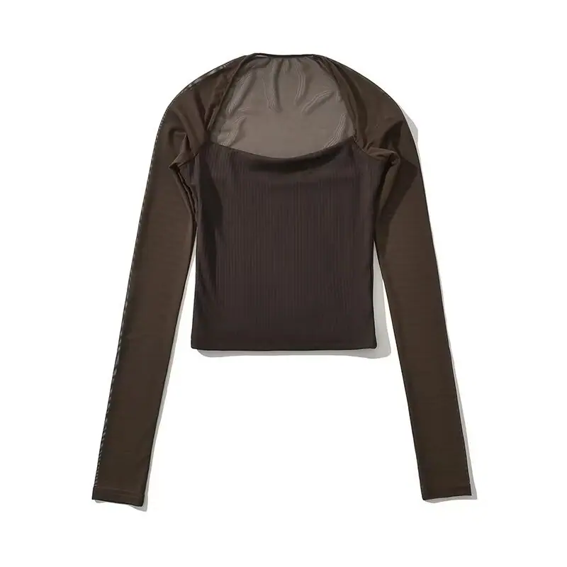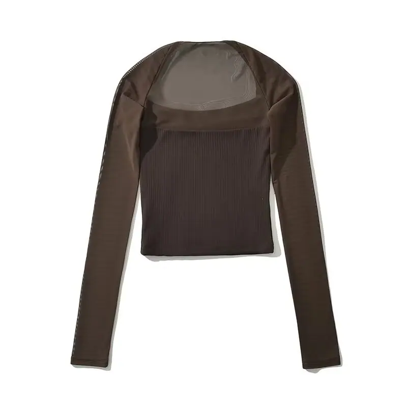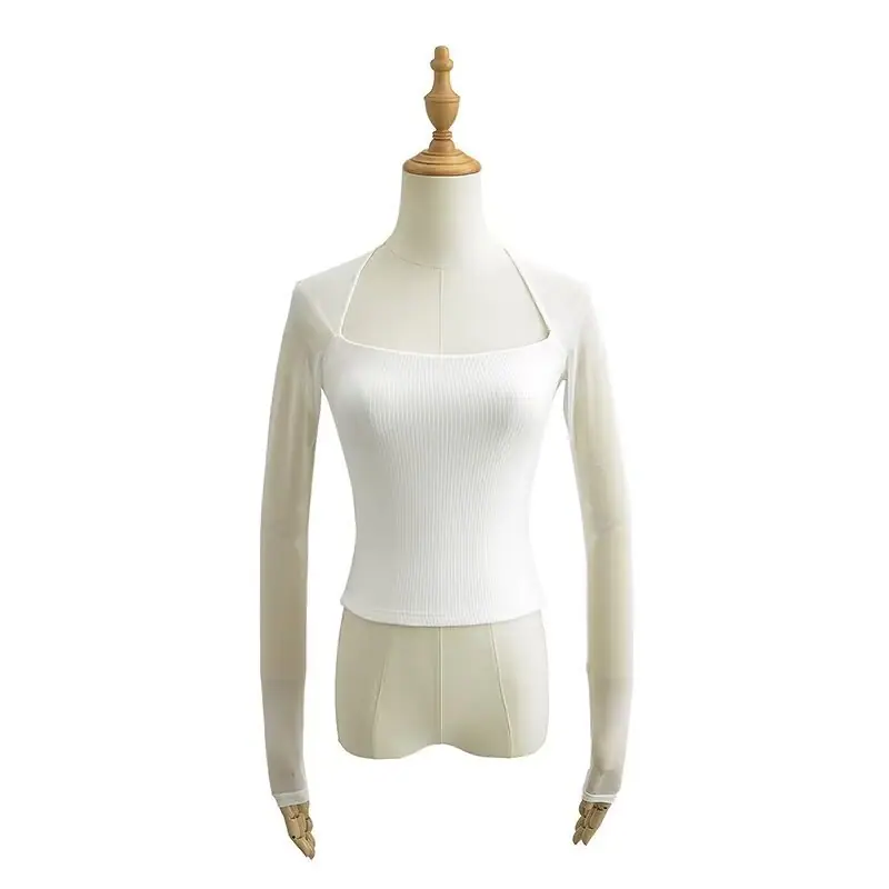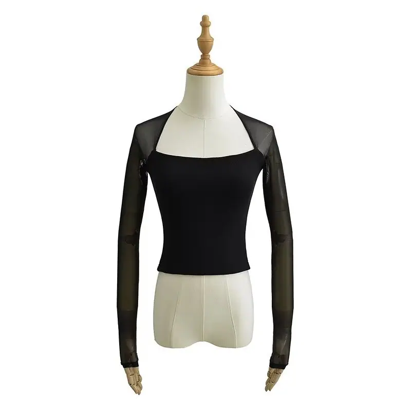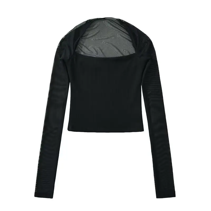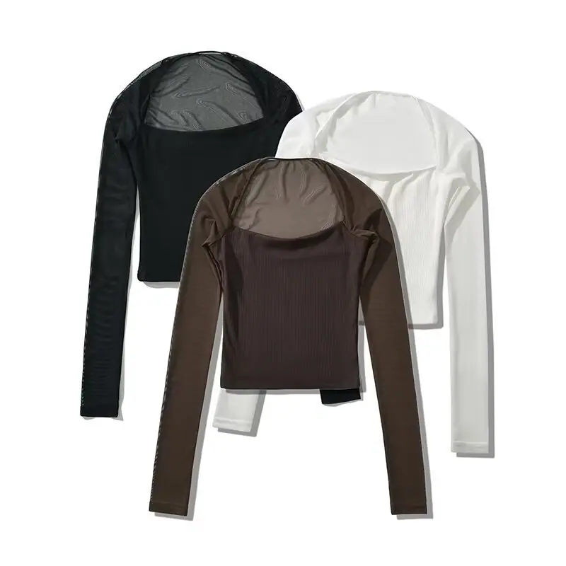 Compra Estilo Americano Retro Sexy Costuras de Malla Ajustada Camiseta Corta para Mujer Spice Girl Cuello Cuadrado Perspectiva Color Sólido Base Top Deseo Puro al por mayor en Joom.pro
