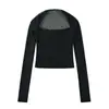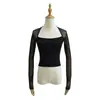 Estilo Americano Retro Sexy Costuras de Malla Ajustada Camiseta Corta para Mujer Spice Girl Cuello Cuadrado Perspectiva Color Sólido Base Top Deseo Puro
