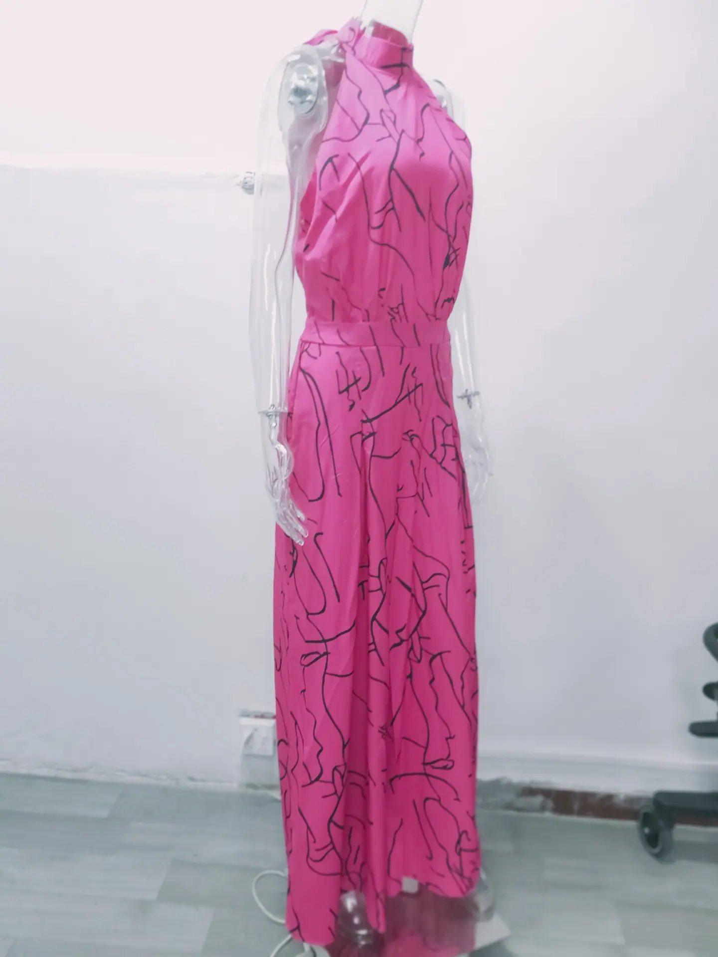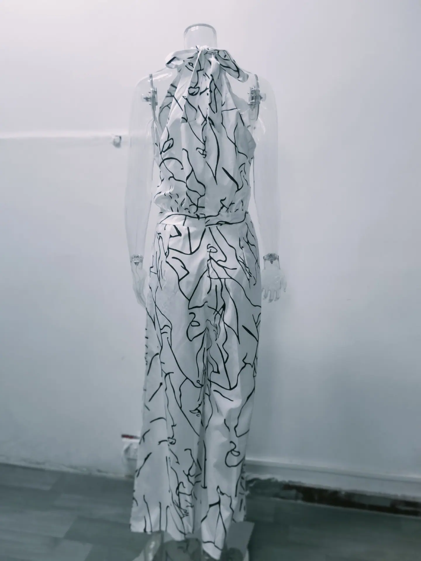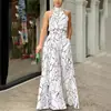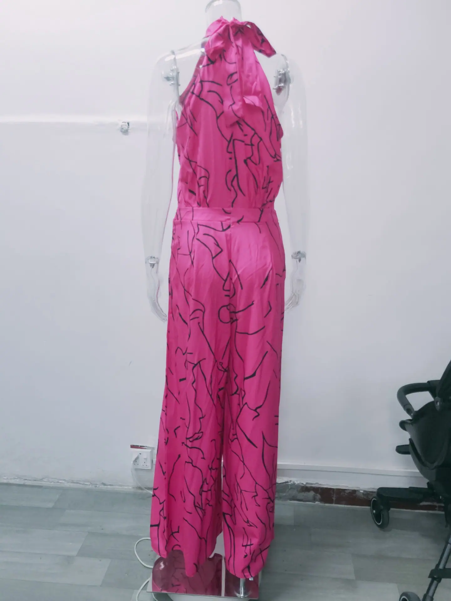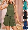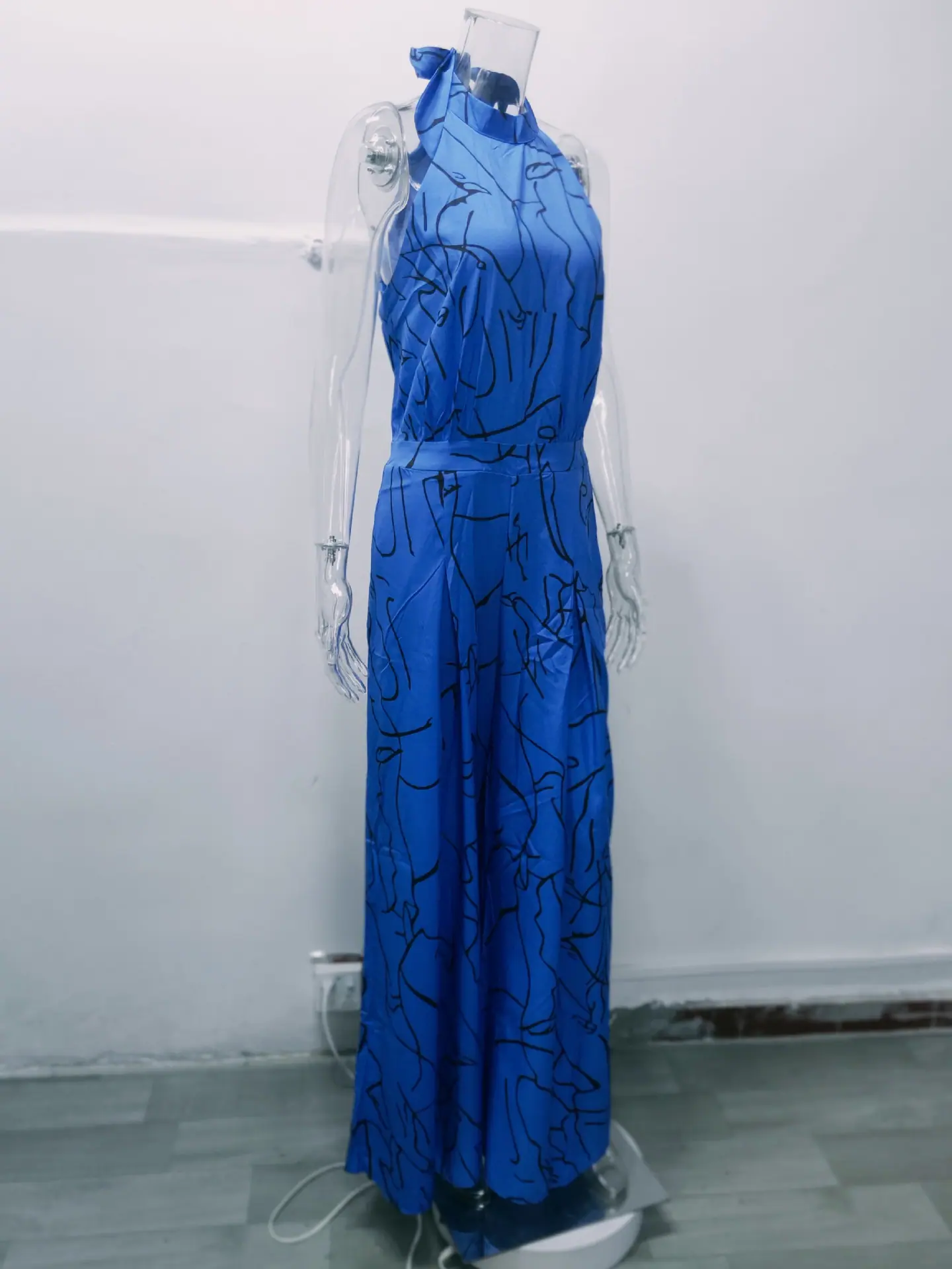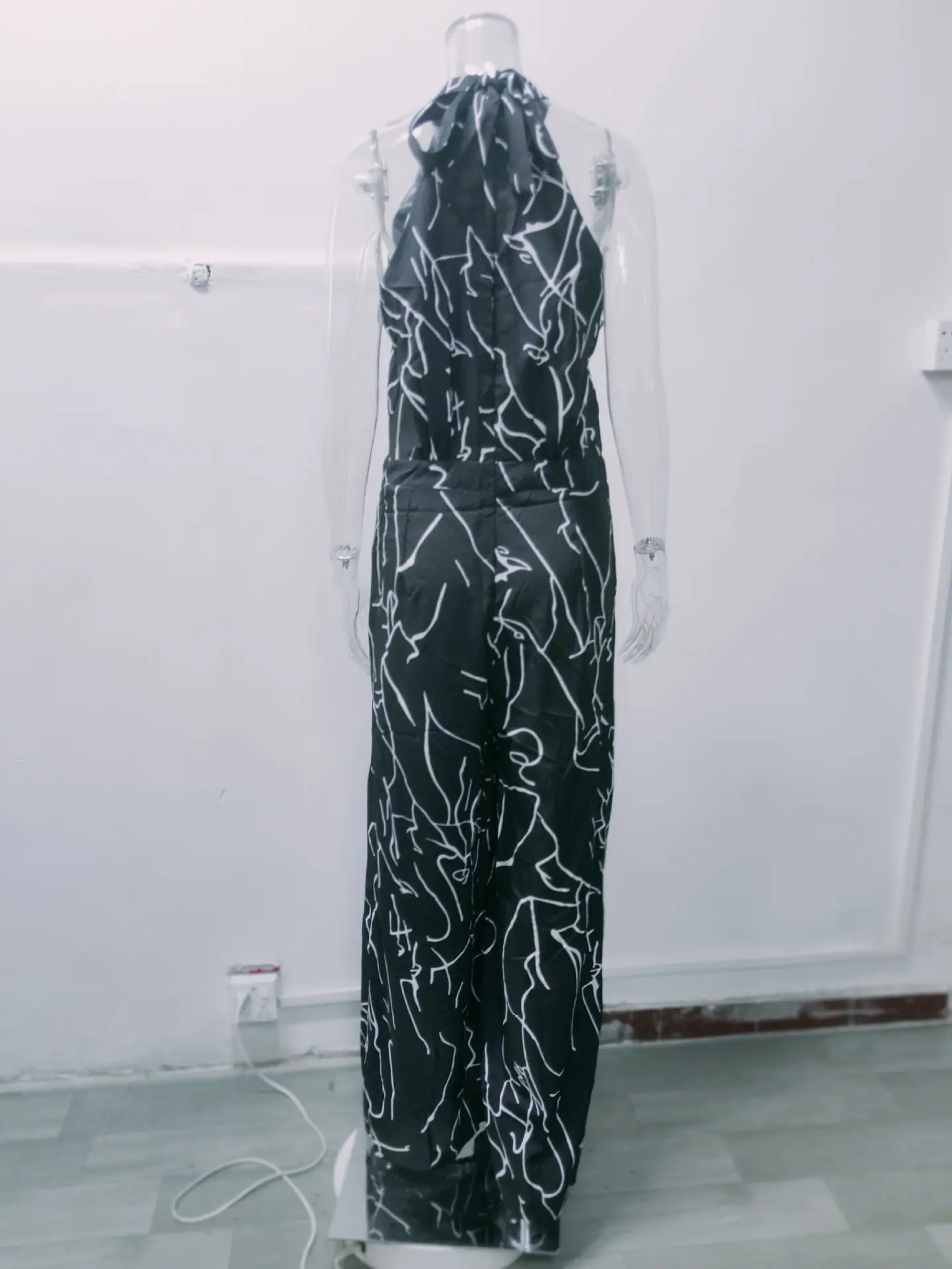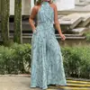 Ropa de Verano para Mujer Europea y Americana 2023 Amazon Elegante Cinturón Anudado Sin Mangas Cuello Halter Pantalón Largo Estampado Mono