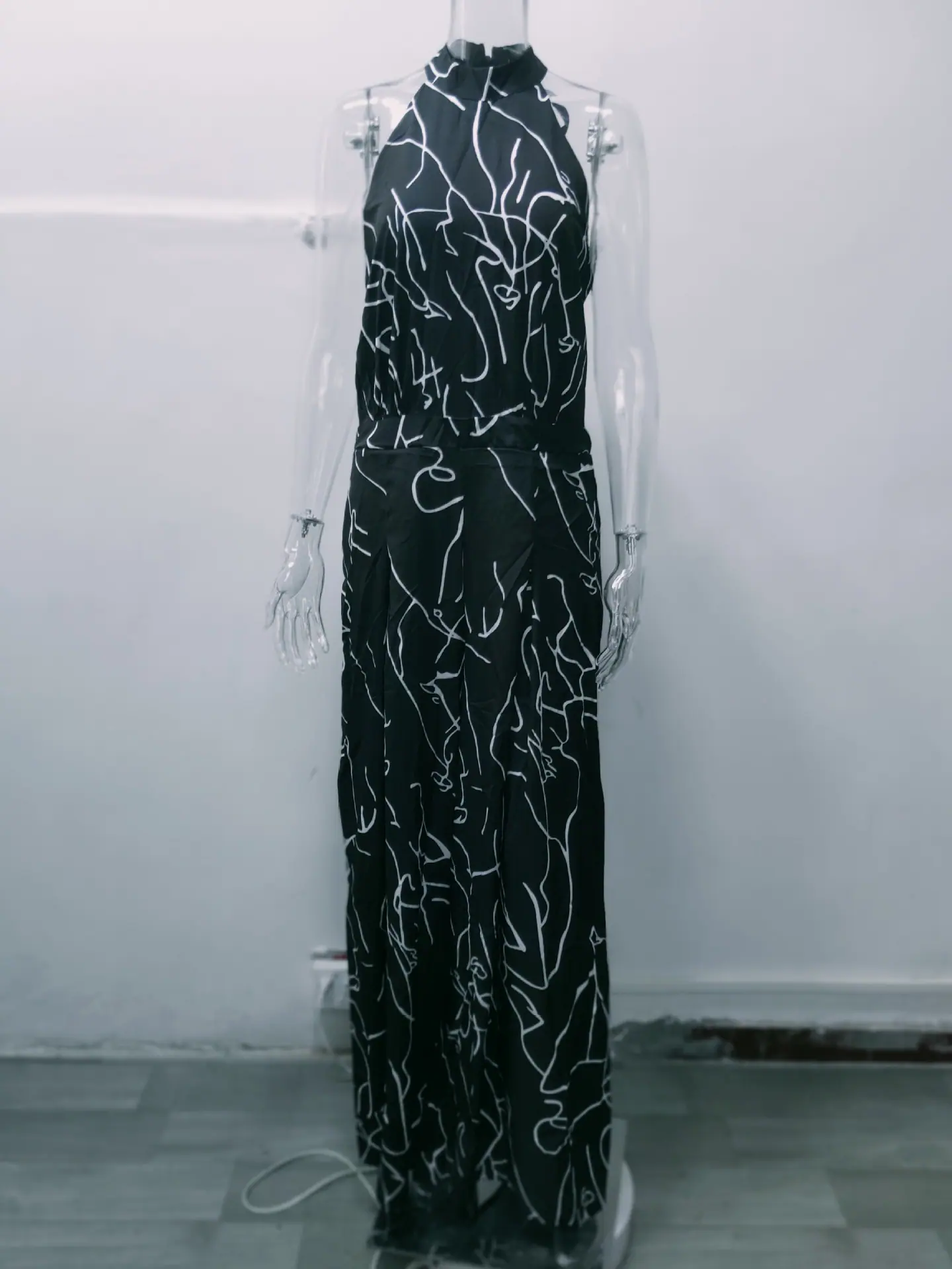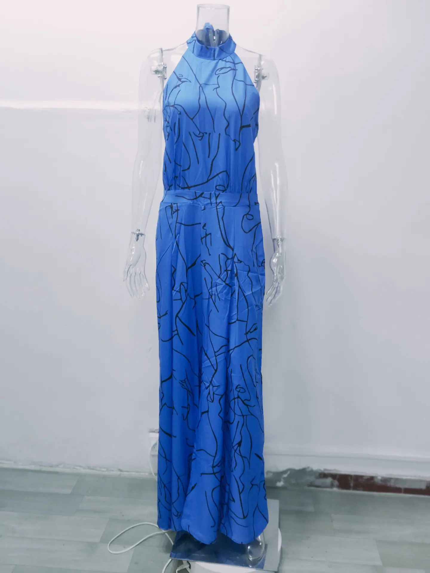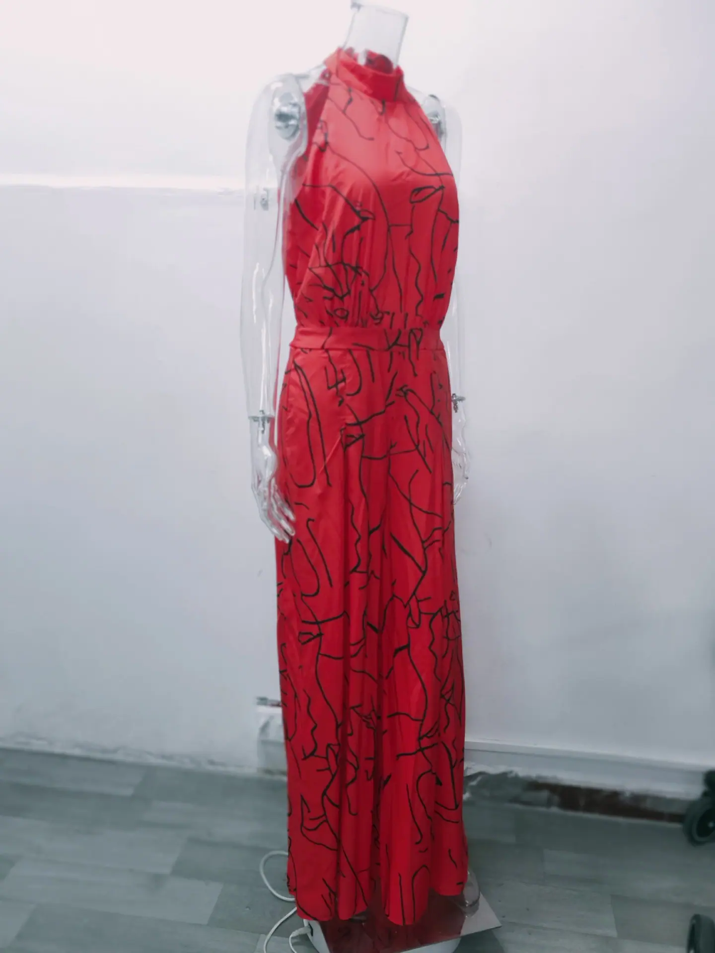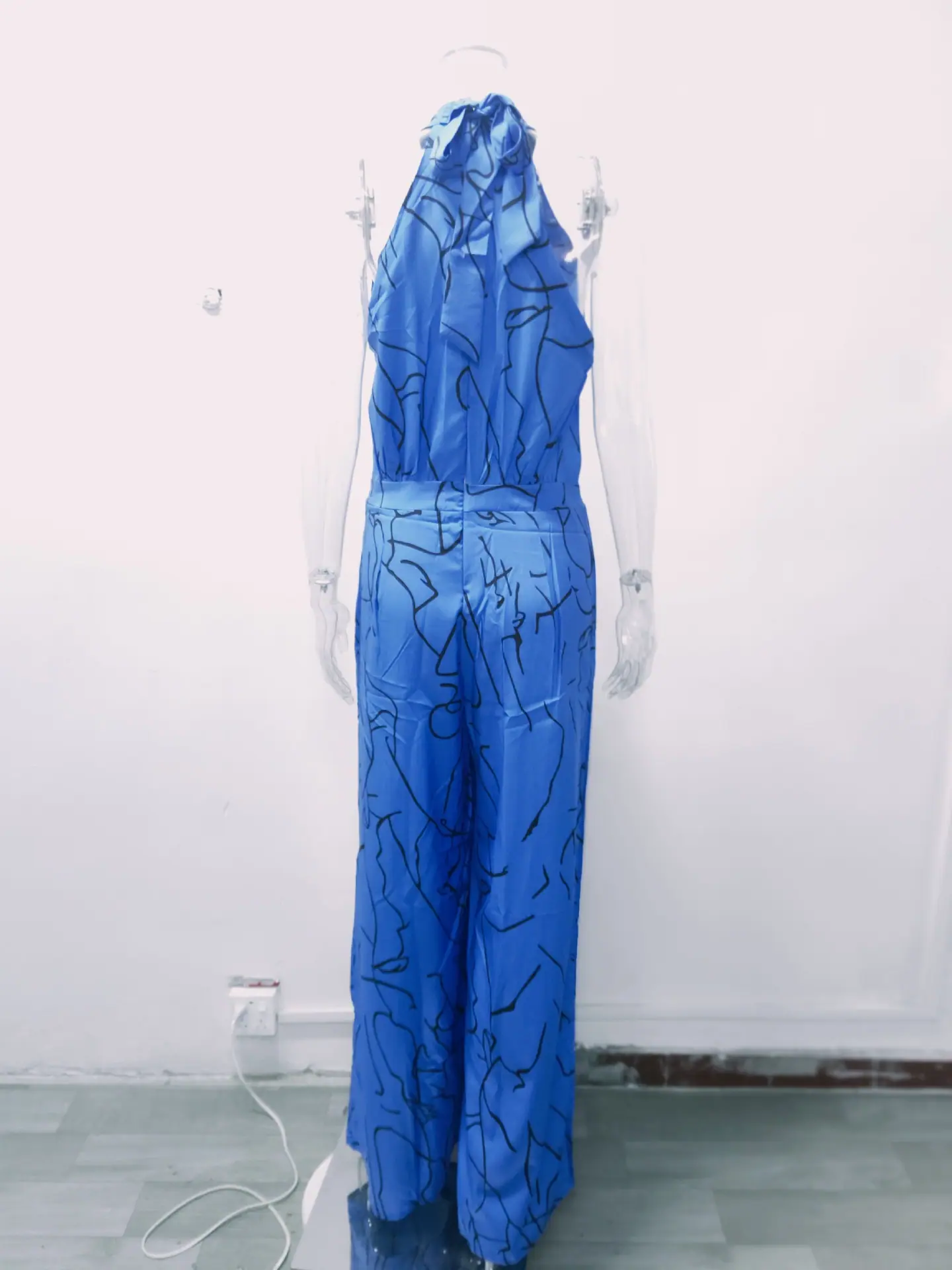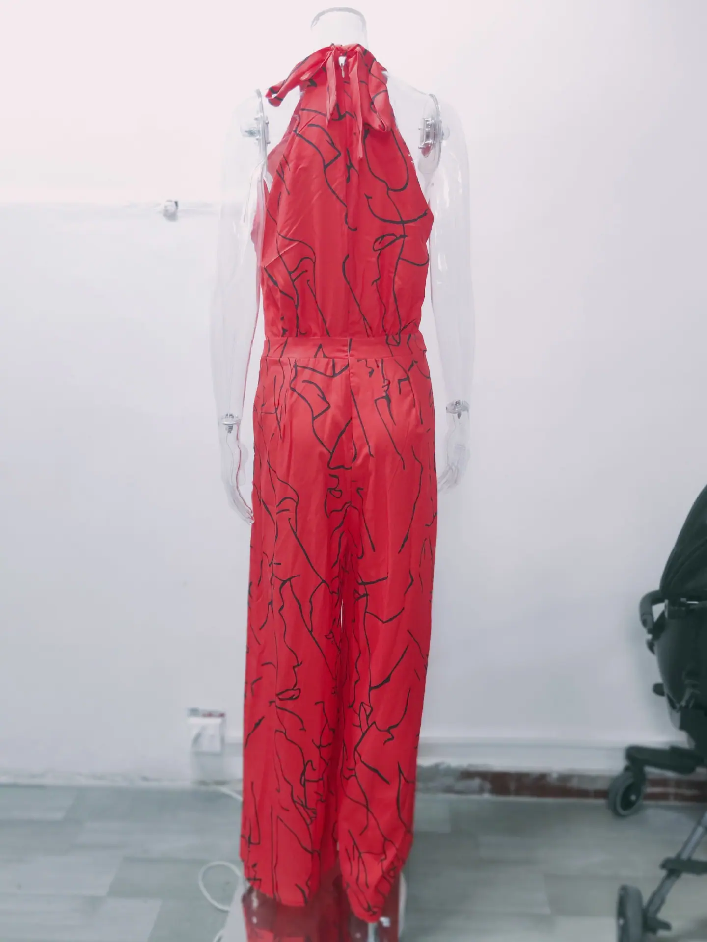 Ropa de Verano para Mujer Europea y Americana 2023 Amazon Elegante Cinturón Anudado Sin Mangas Cuello Halter Pantalón Largo Estampado Mono