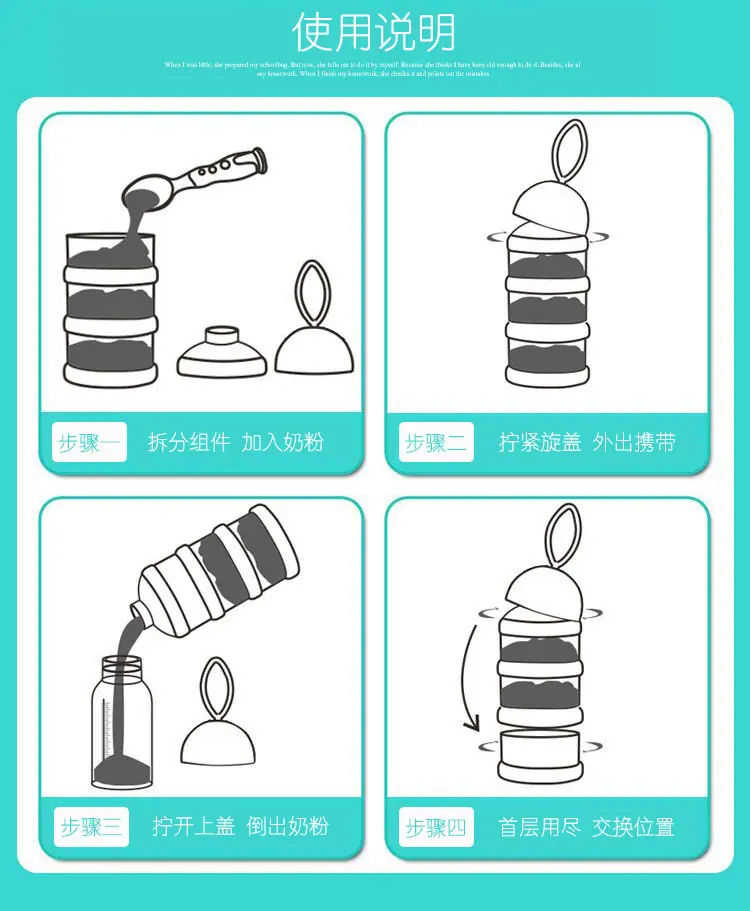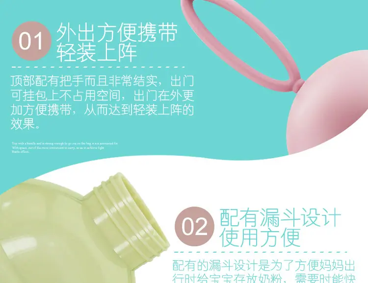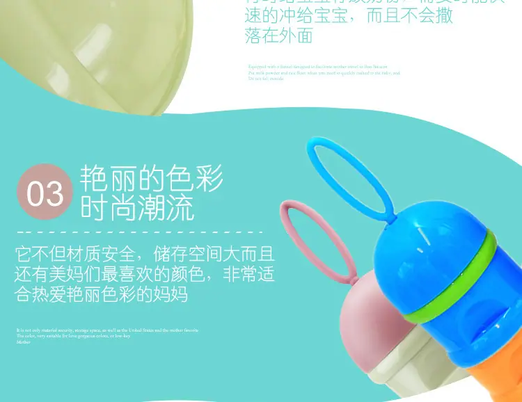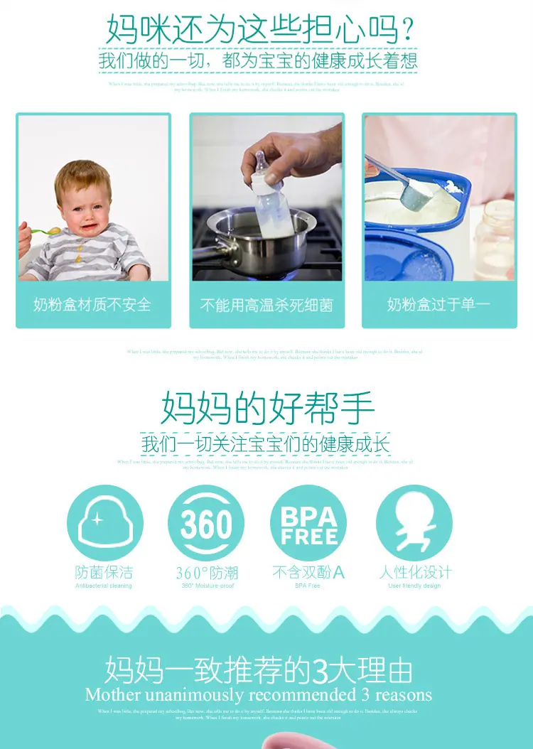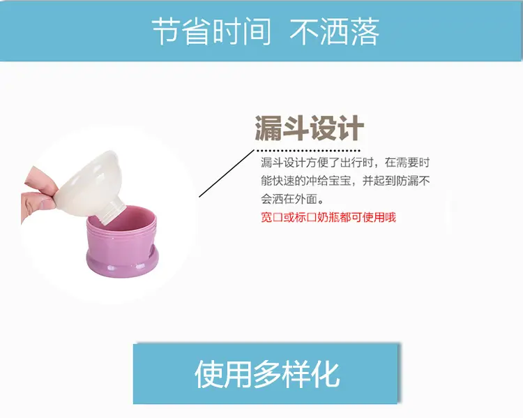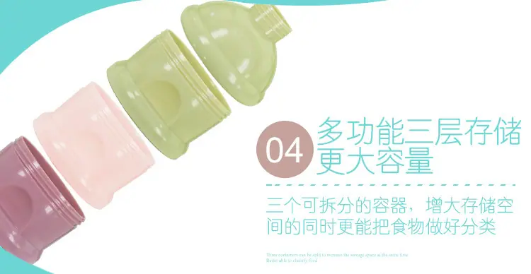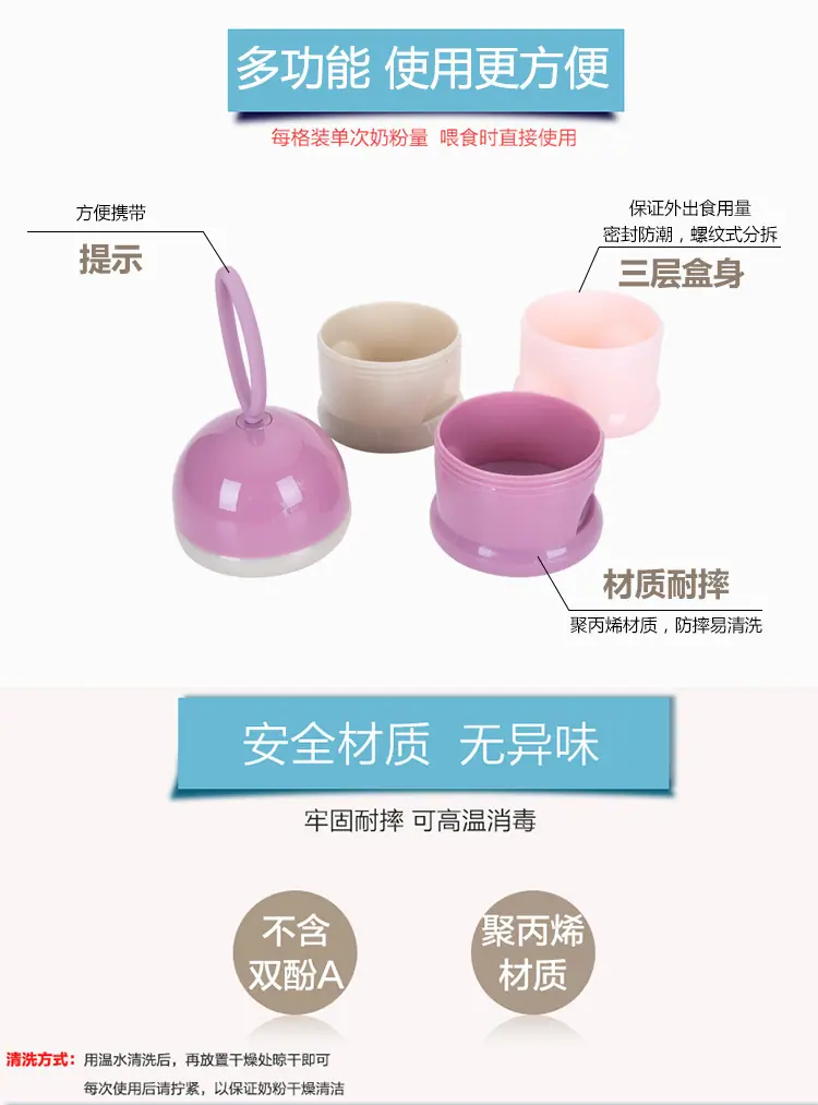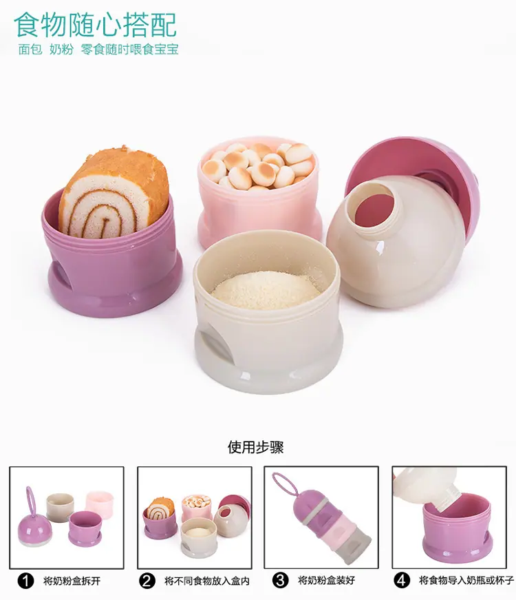 3) Puede contener simultáneamente leche en polvo, cereal de arroz, cereal de trigo u otros alimentos complementarios, satisfaciendo las diversas necesidades del bebé. Características del producto: Buen sellado, no propenso a la humedad;