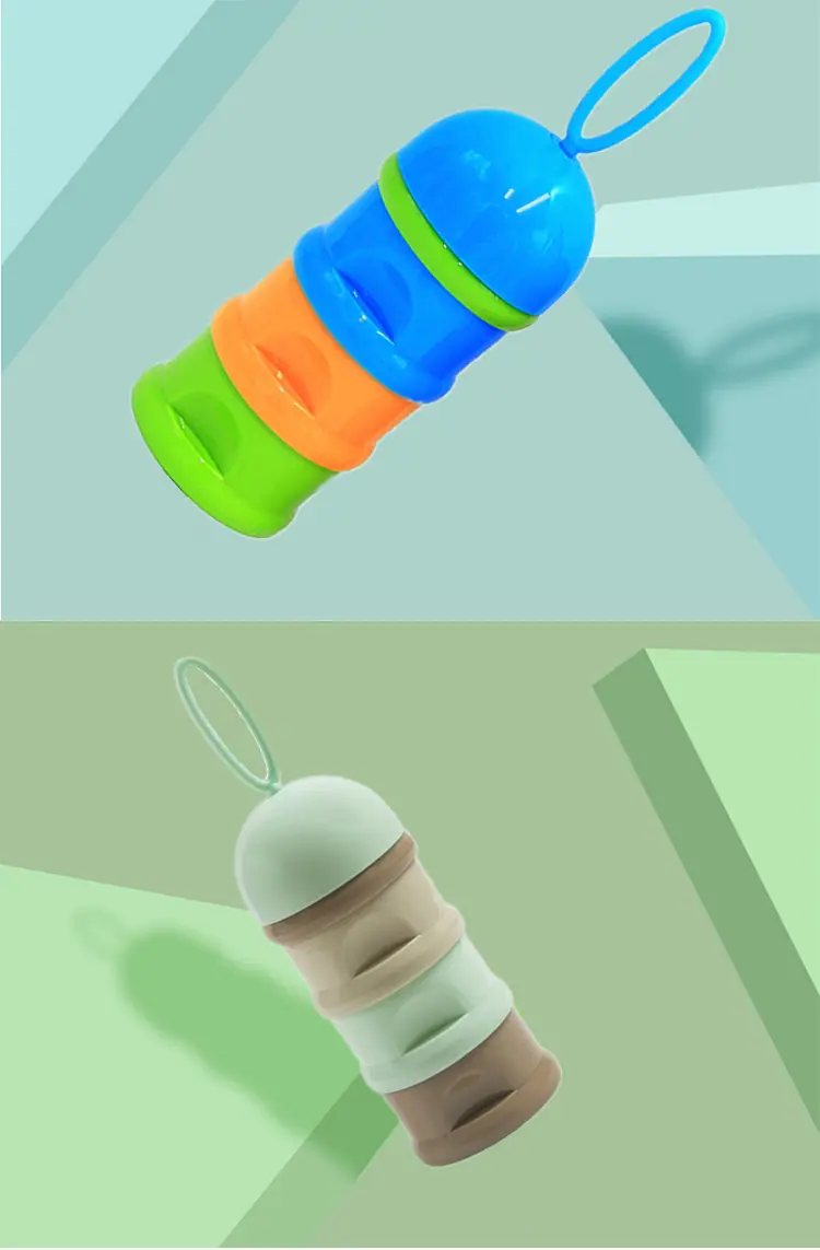 1) Contenedor de plástico de tres capas para fórmula, cada capa contiene la cantidad de fórmula para una toma, conveniente para llevar;