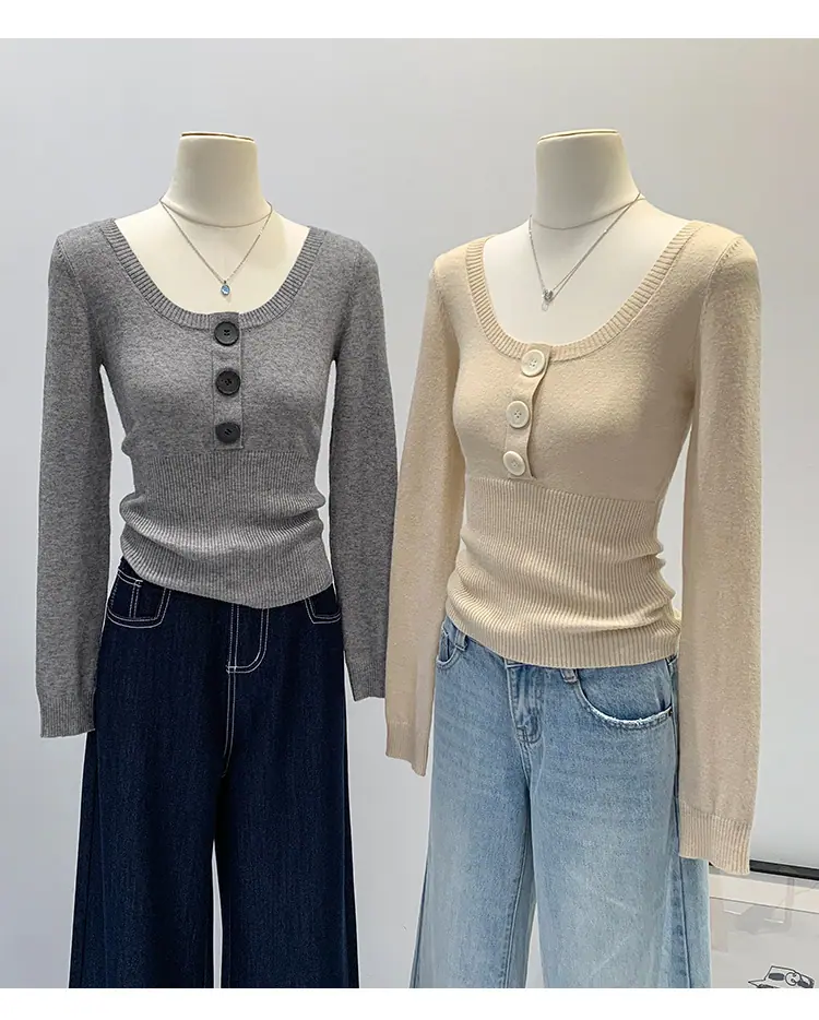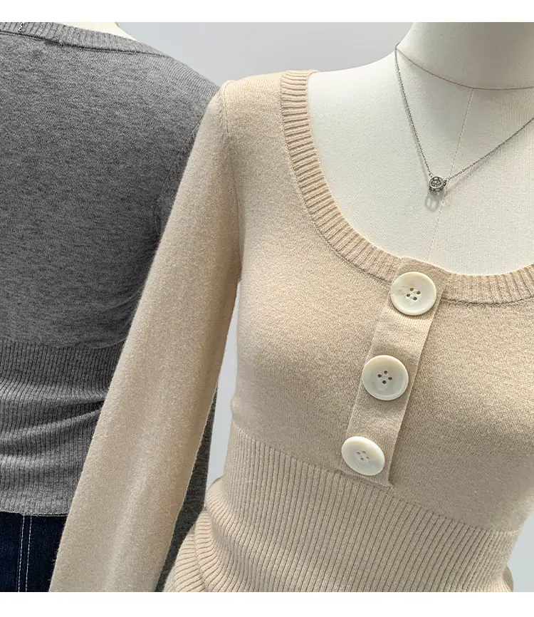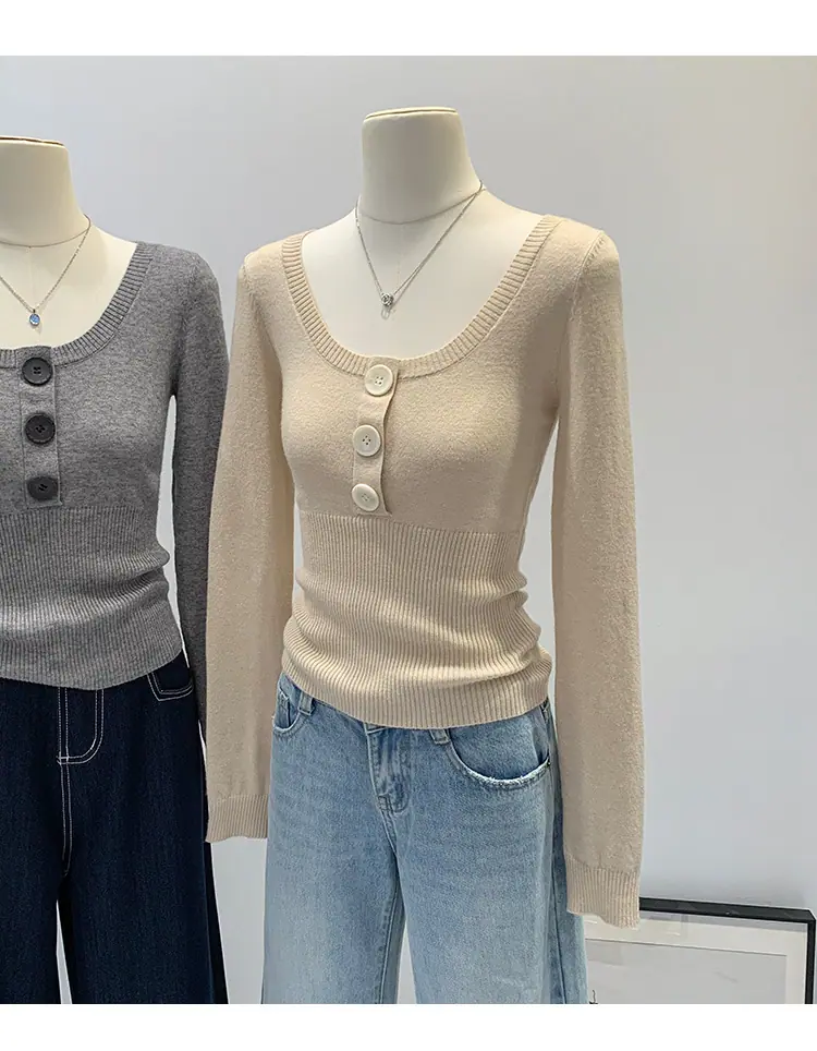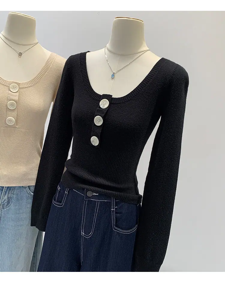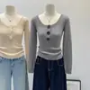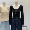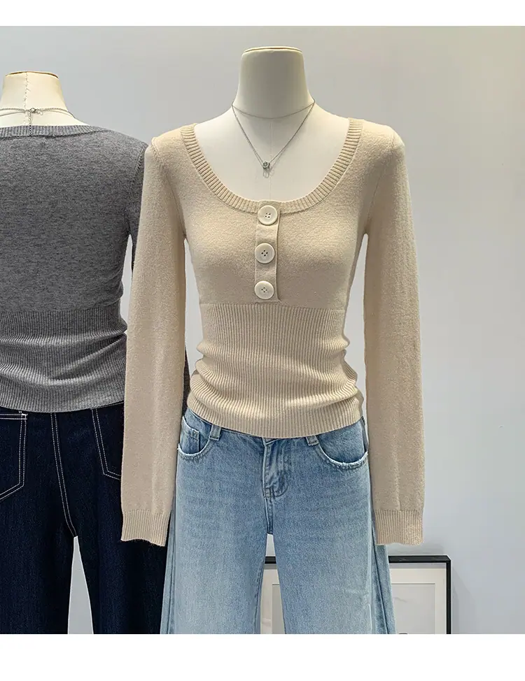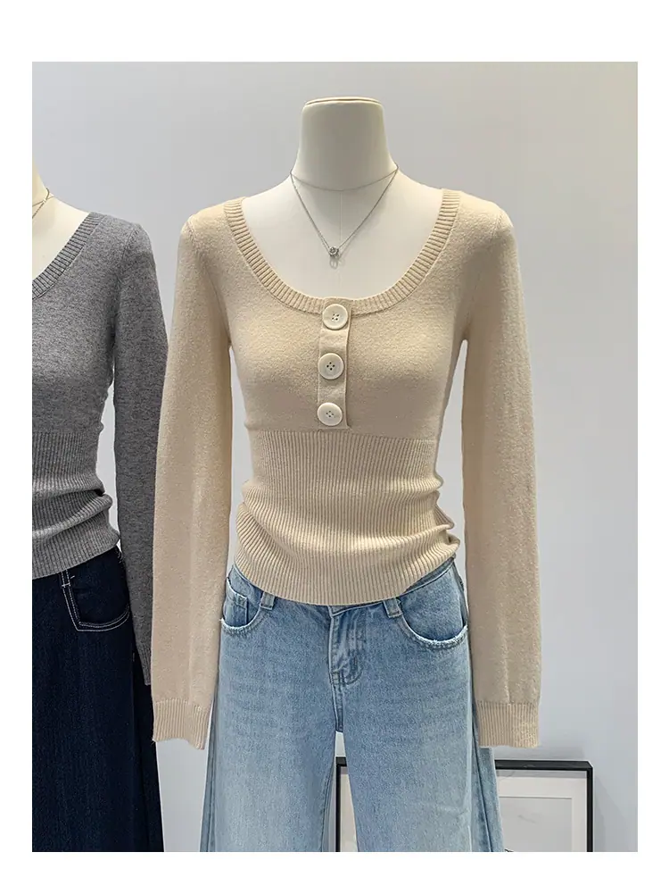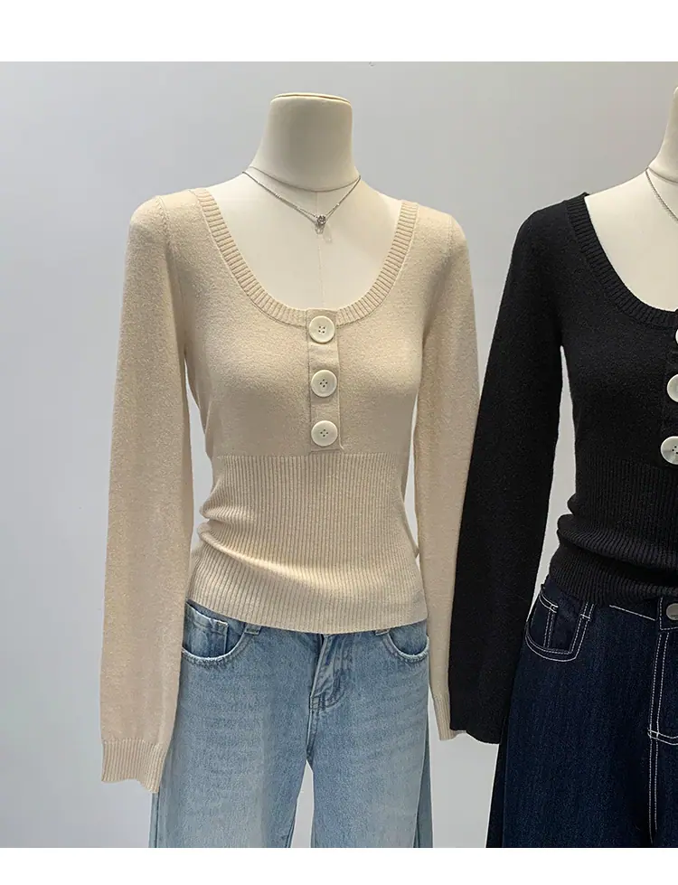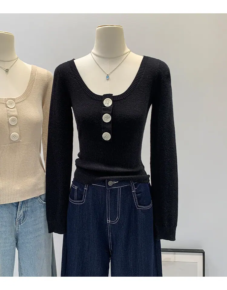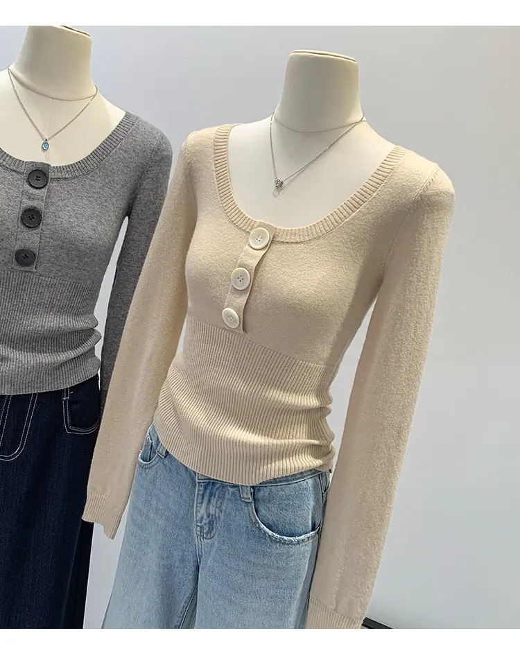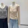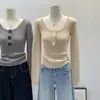Camiseta Base de Punto con Botones Estilo Francés Cuello U Otoño/Invierno 2025 Nuevo Diseño Coreano Ajustado Top Interior