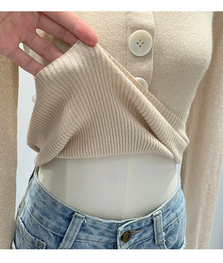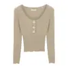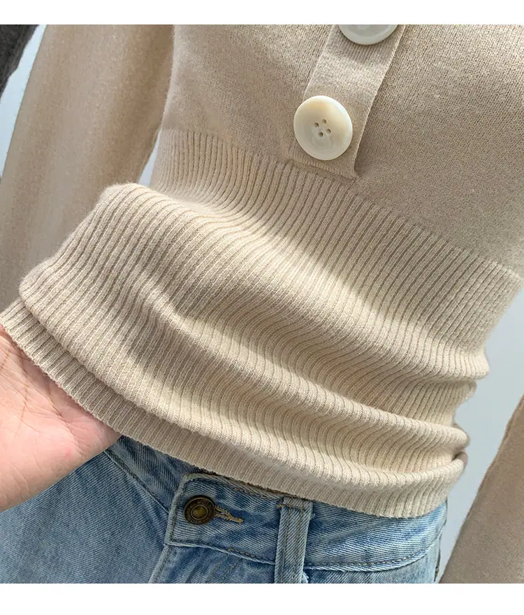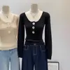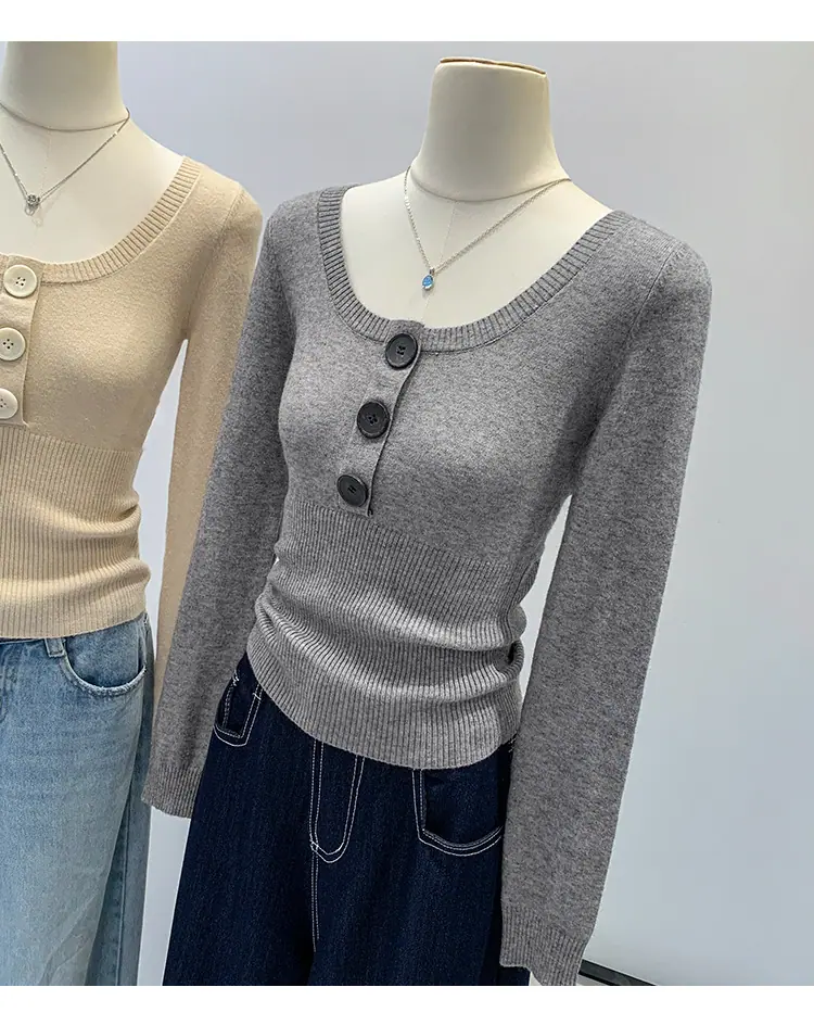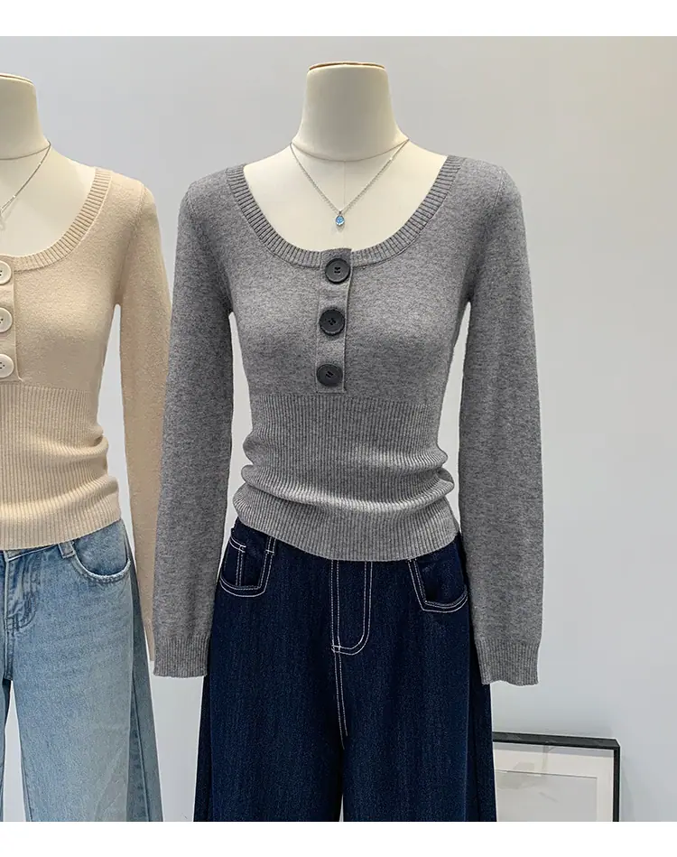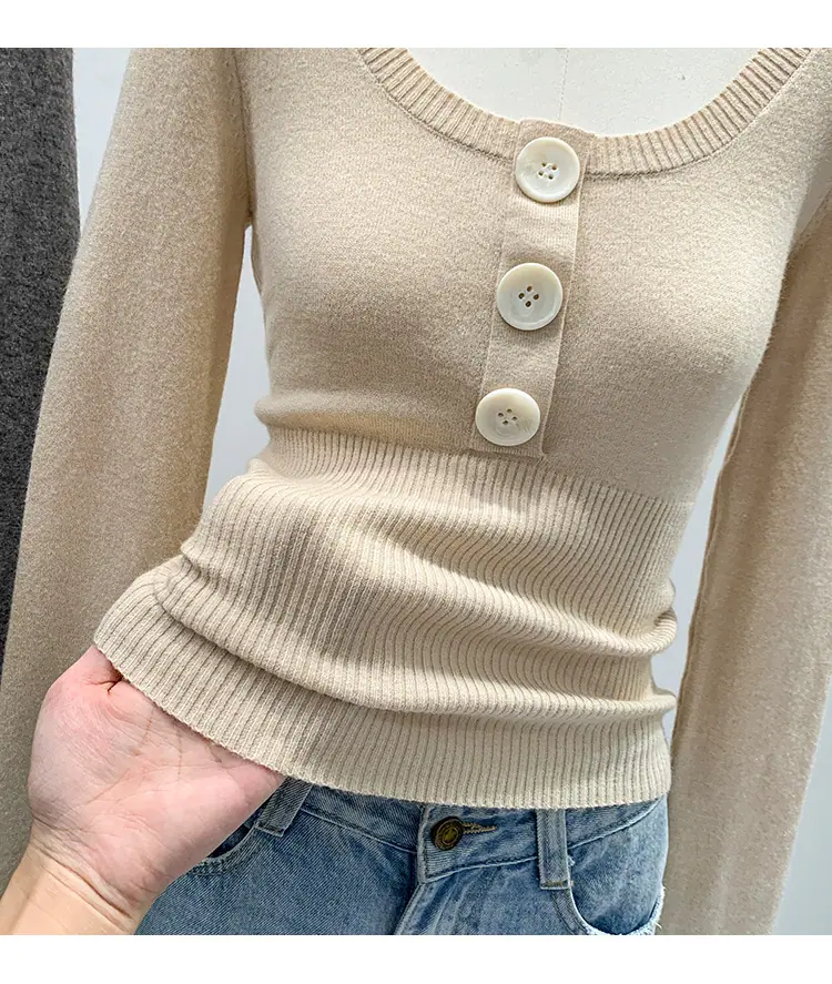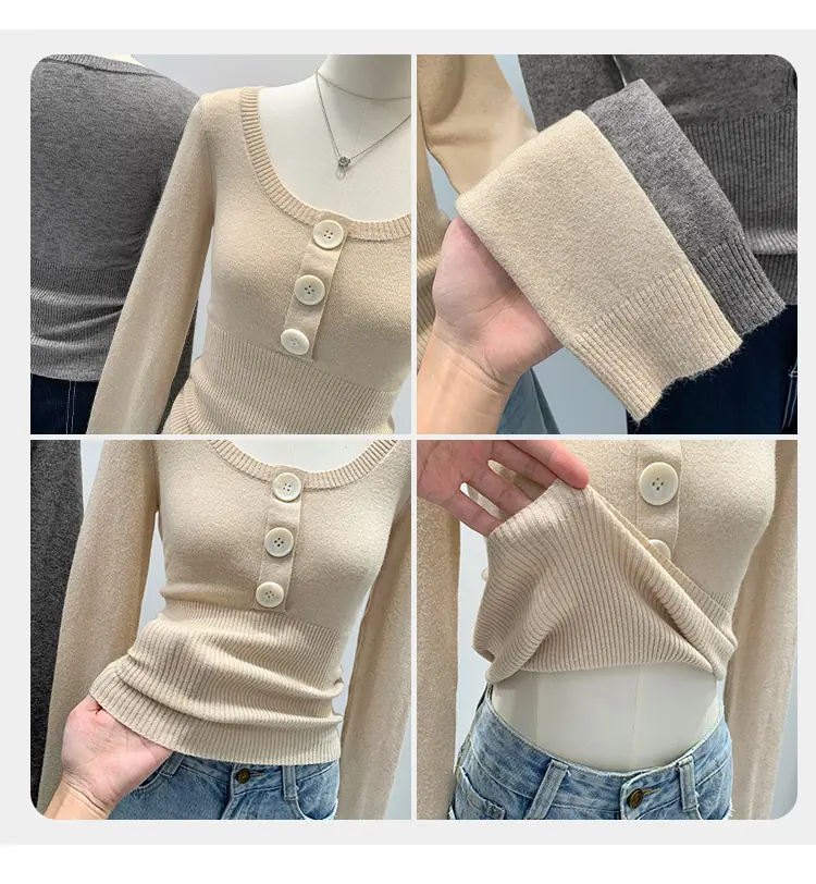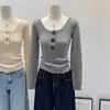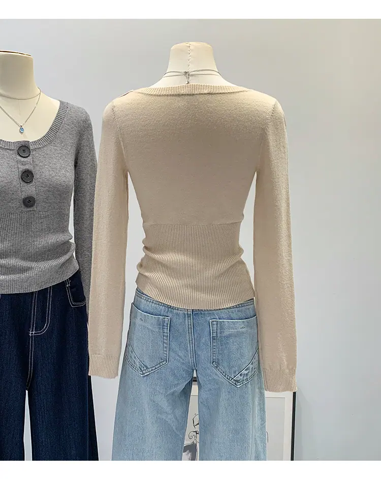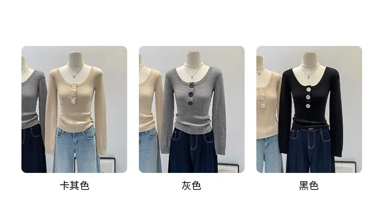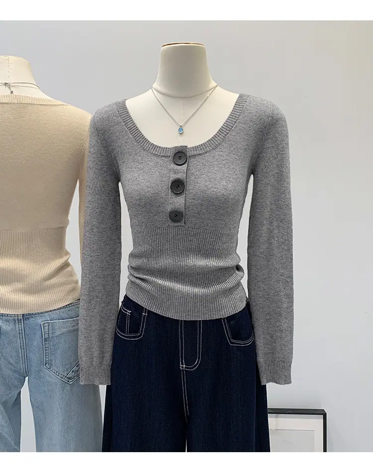 Camiseta Base de Punto con Botones Estilo Francés Cuello U Otoño/Invierno 2025 Nuevo Diseño Coreano Ajustado Top Interior