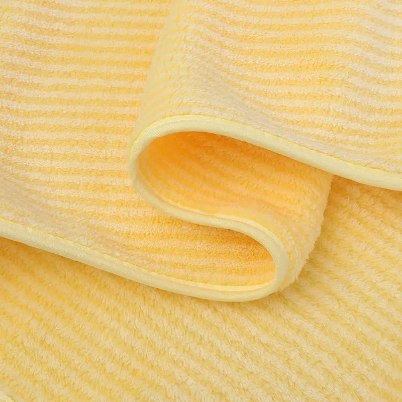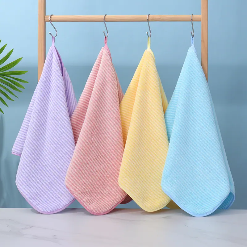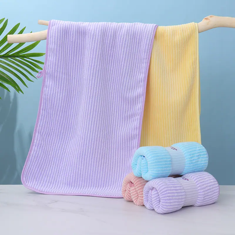 Yellow striped towel, Purple striped towel, Pink striped towel, Blue striped towel