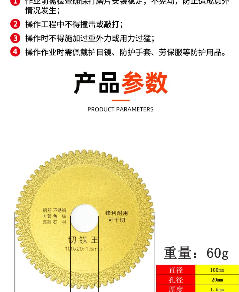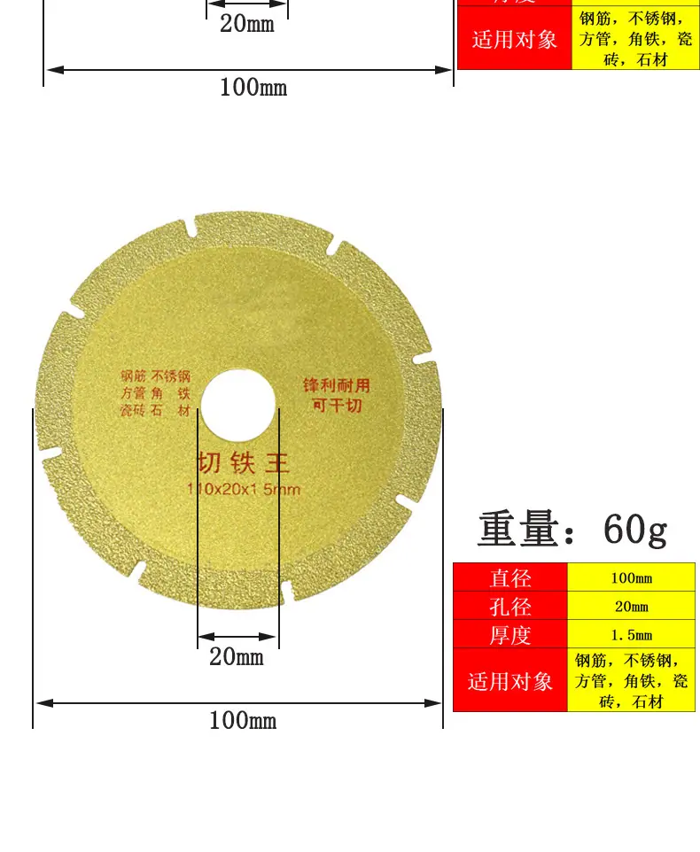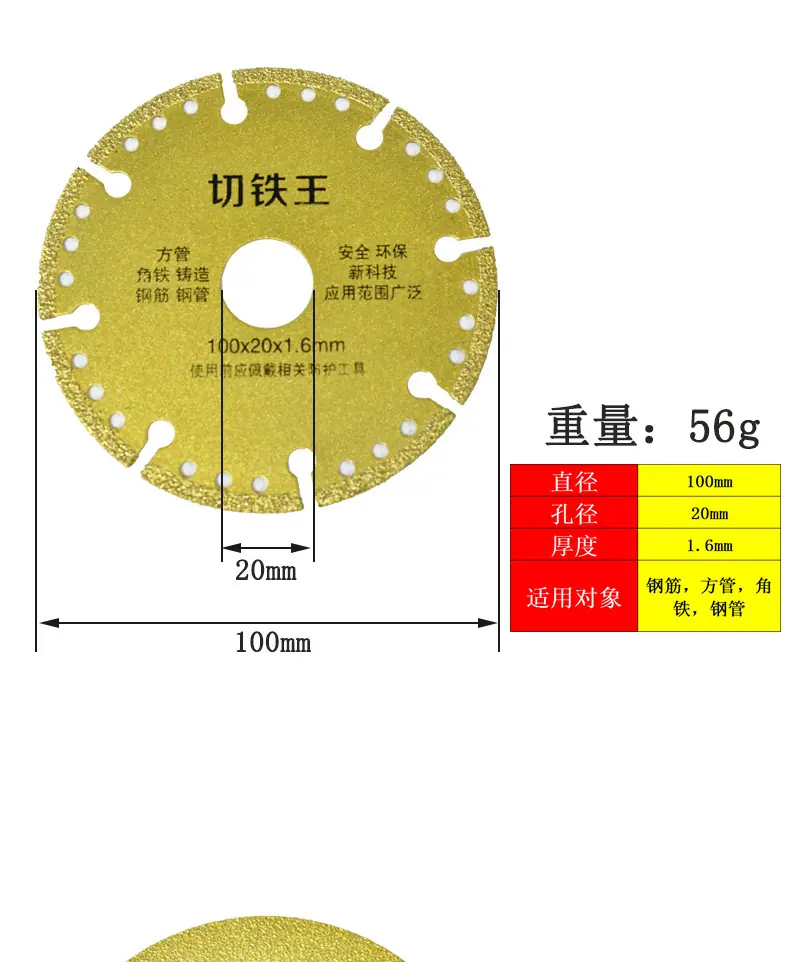 Descripción del producto: Cada disco con un diámetro de agujero de 20 mm vendrá con una arandela de conversión de 20 mm a 16 mm. ¡Todas las series de este producto pueden cortar piedra y metal y pulir la superficie. Es una hoja de sierra multifuncional!