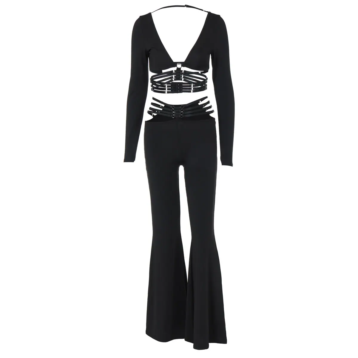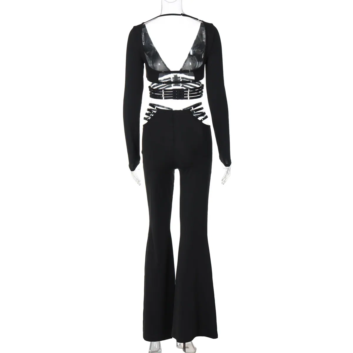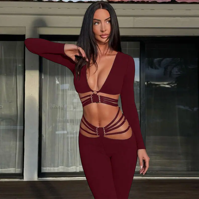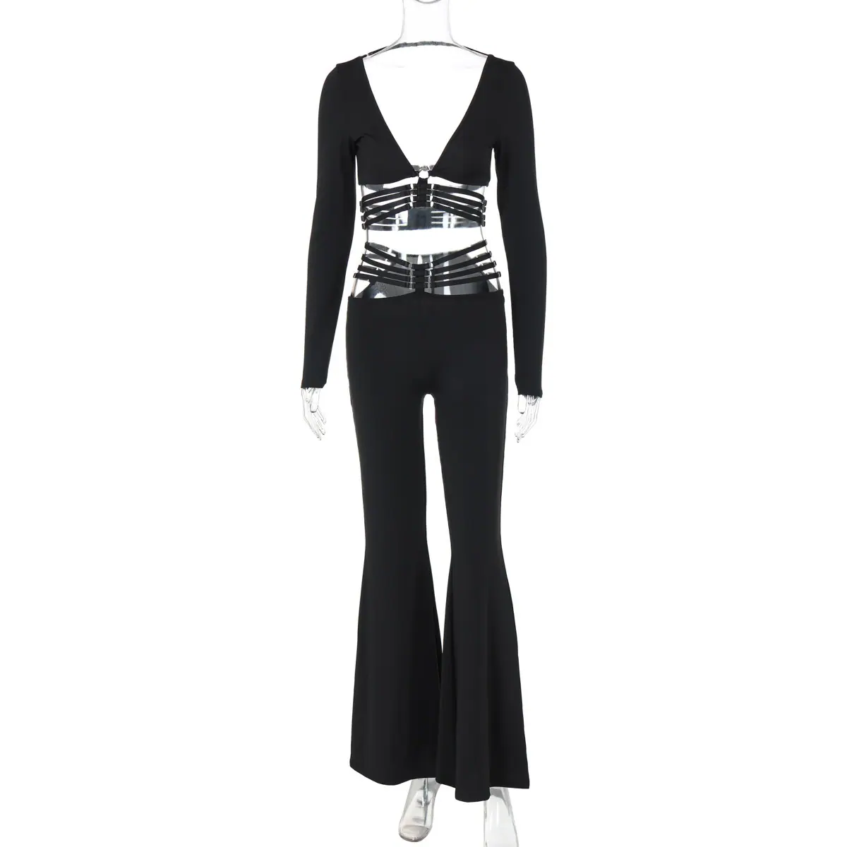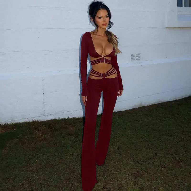 Ropa de Mujer Europea y Americana 2025 Verano Nueva Moda Sexy Cuello en V Mangas Largas Tops Ajustados Tirantes Pantalones de Pierna Ancha Traje Venta al por Mayor