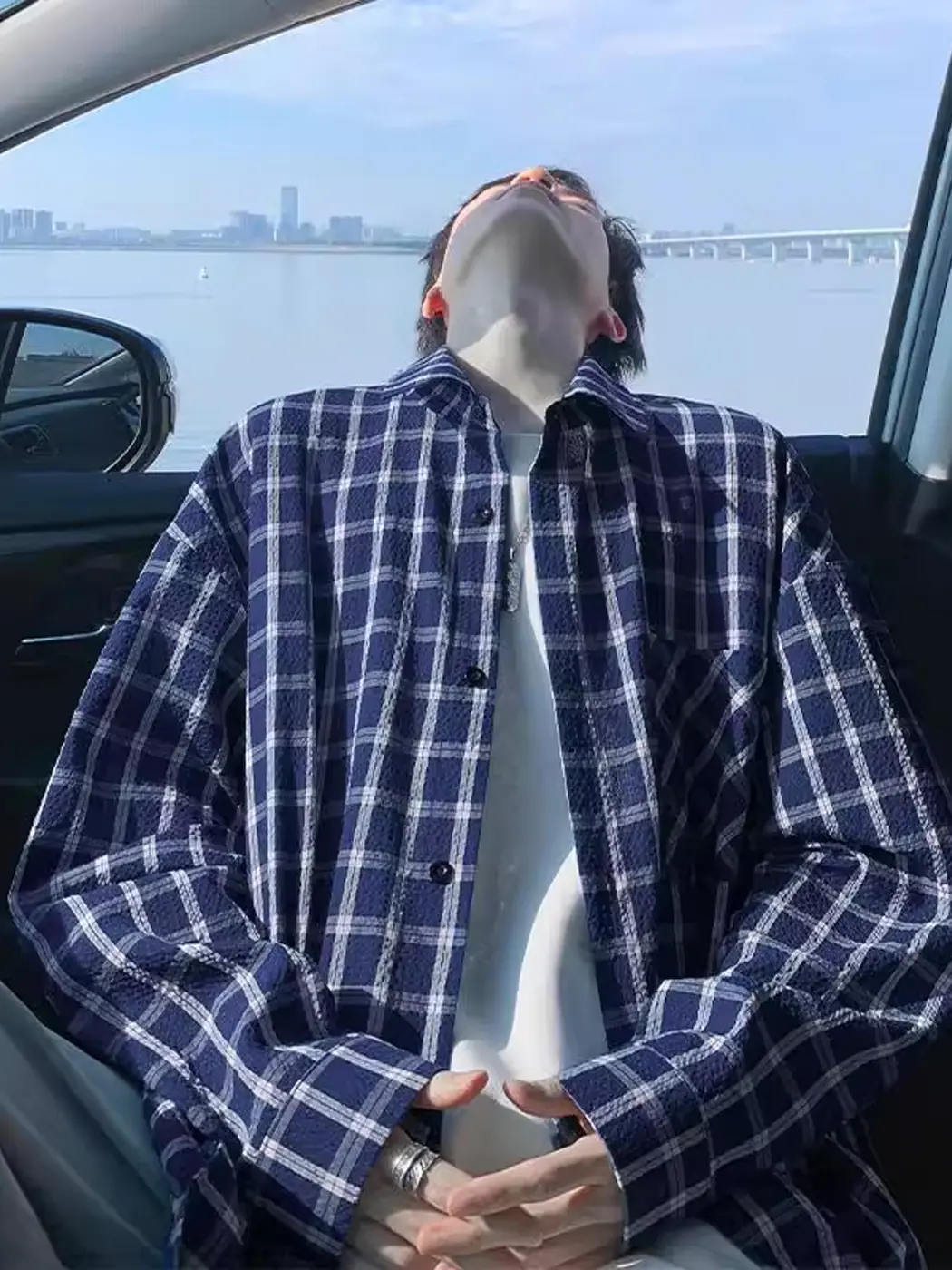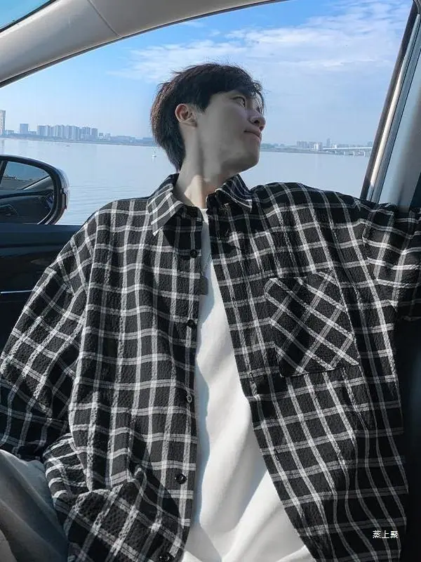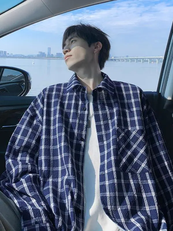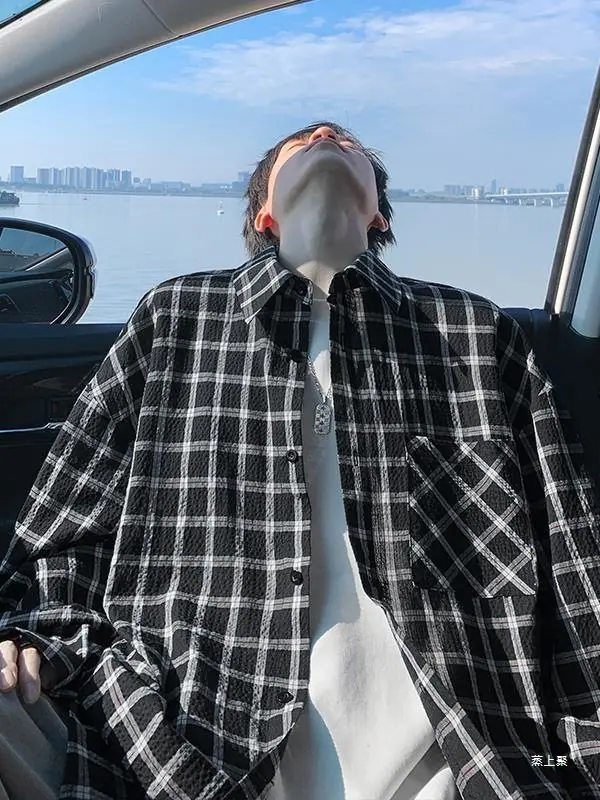 Camisa de Manga Larga a Cuadros con Solapa Texturizada para Hombre Otoño Nuevo Estilo Americano Lazy Retro Casual Chaqueta Camisera Trendy
