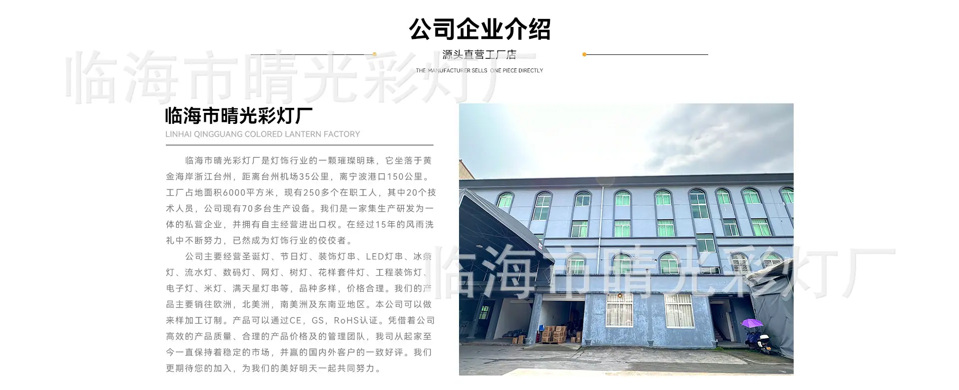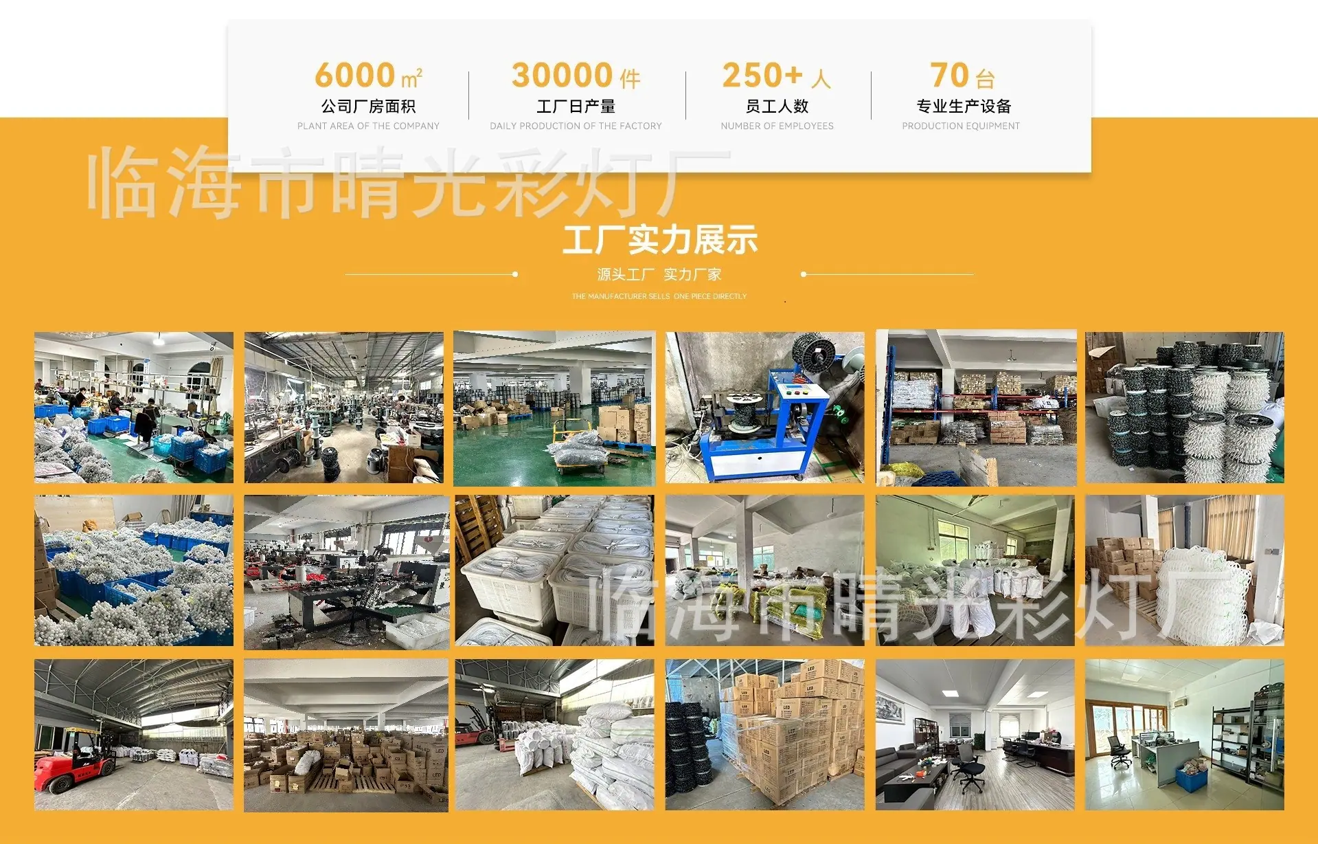 Somos la base de origen de luces de colores en la ciudad de Linhai, con condiciones de producción completas y procesamiento personalizable. Vendemos principalmente luces de colores navideñas, guirnaldas de luces solares, cortinas de luces, guirnaldas de luces LED para camping, guirnaldas de luces con caja de baterías y varios conjuntos de guirnaldas de luces colgantes. Cubrimos los estilos principales en los mercados nacionales e internacionales como Europa, América, Japón y Corea del Sur. Hemos estado proporcionando suministro estable a las principales marcas, plataformas de transmisión en vivo y clientes de comercio electrónico durante mucho tiempo. También apoyamos una variedad de cooperaciones como envío directo, procesamiento de muestras, marcas ODM, etc. Damos la bienvenida a clientes nuevos y antiguos para realizar pedidos. Para más detalles, por favor contacte con el servicio al cliente