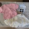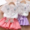 Ropa coreana para niños 2025 nuevo verano niñas lazo pequeño camiseta de manga corta pantalones falda de estilo occidental para niños conjunto de dos piezas moderno