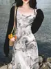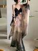En Stock Nuevo Vestido Strapless con Hombros Descubiertos Estilo Chino de Pintura al Tinta con Tirantes Flotantes y Chal Tejido Protector Solar, Set Súper de Hada