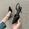 Zapatos de Mujer Lianhuaxiang 2025 Sandalias de Tacón Alto Punta Francesa Correa Microfibra Negra Tacones Altos Tacones de Aguja