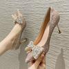 3265-H37 Banquete Moda Estilo Coreano Tacones Altos Tacón de Aguja Zapatos de Mujer Boca Baja Punta Afilada Zapatos con Lazo de Pedrería Tacón Alto