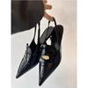 237-K31 Zapatos de Banquete para Mujer Estilo Europeo y Americano Tacón Fino Tacón Medio Charol Boca Baja Puntiagudos Pedrería Metal Decorativo Zapatos Individuales para Mujer